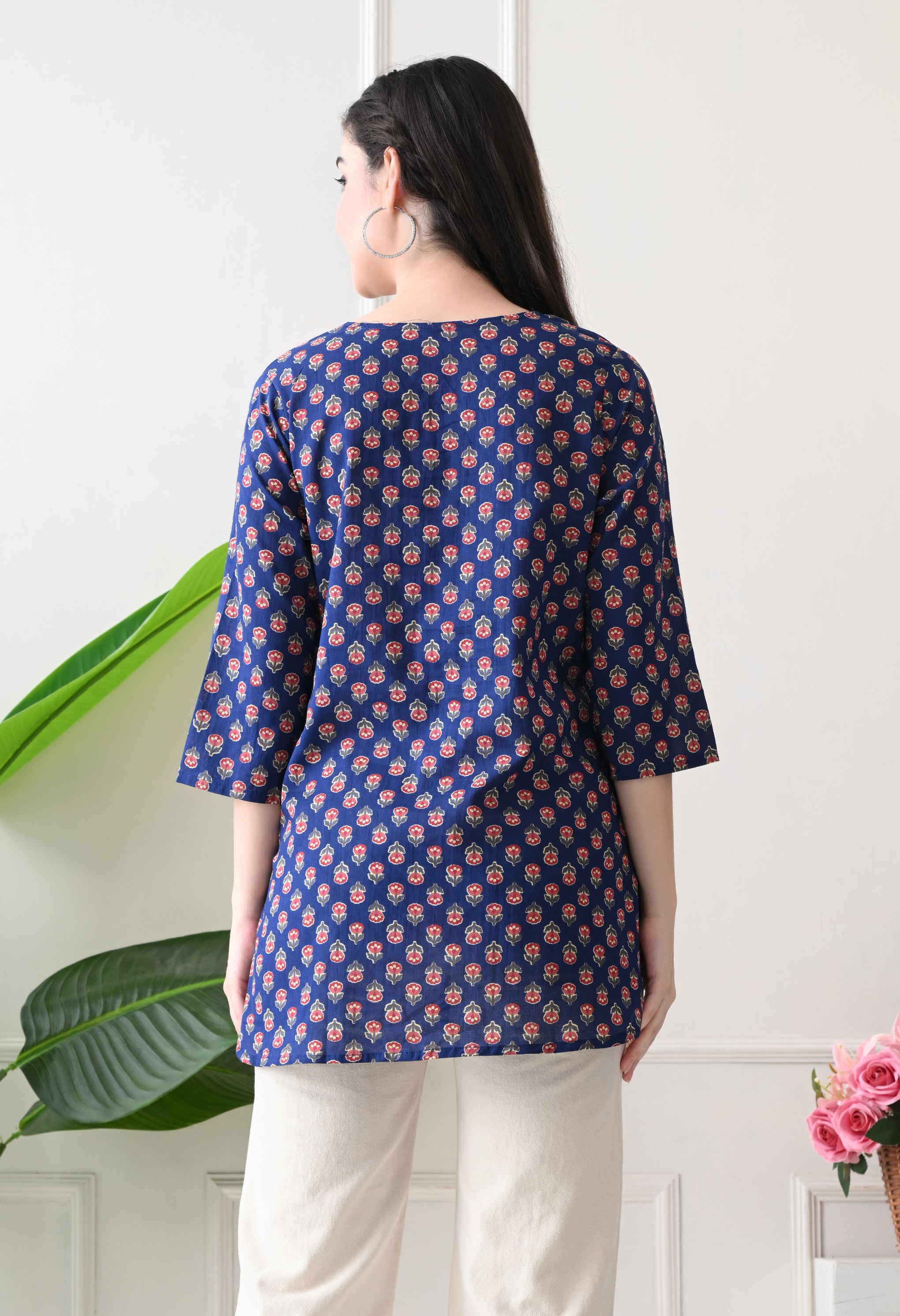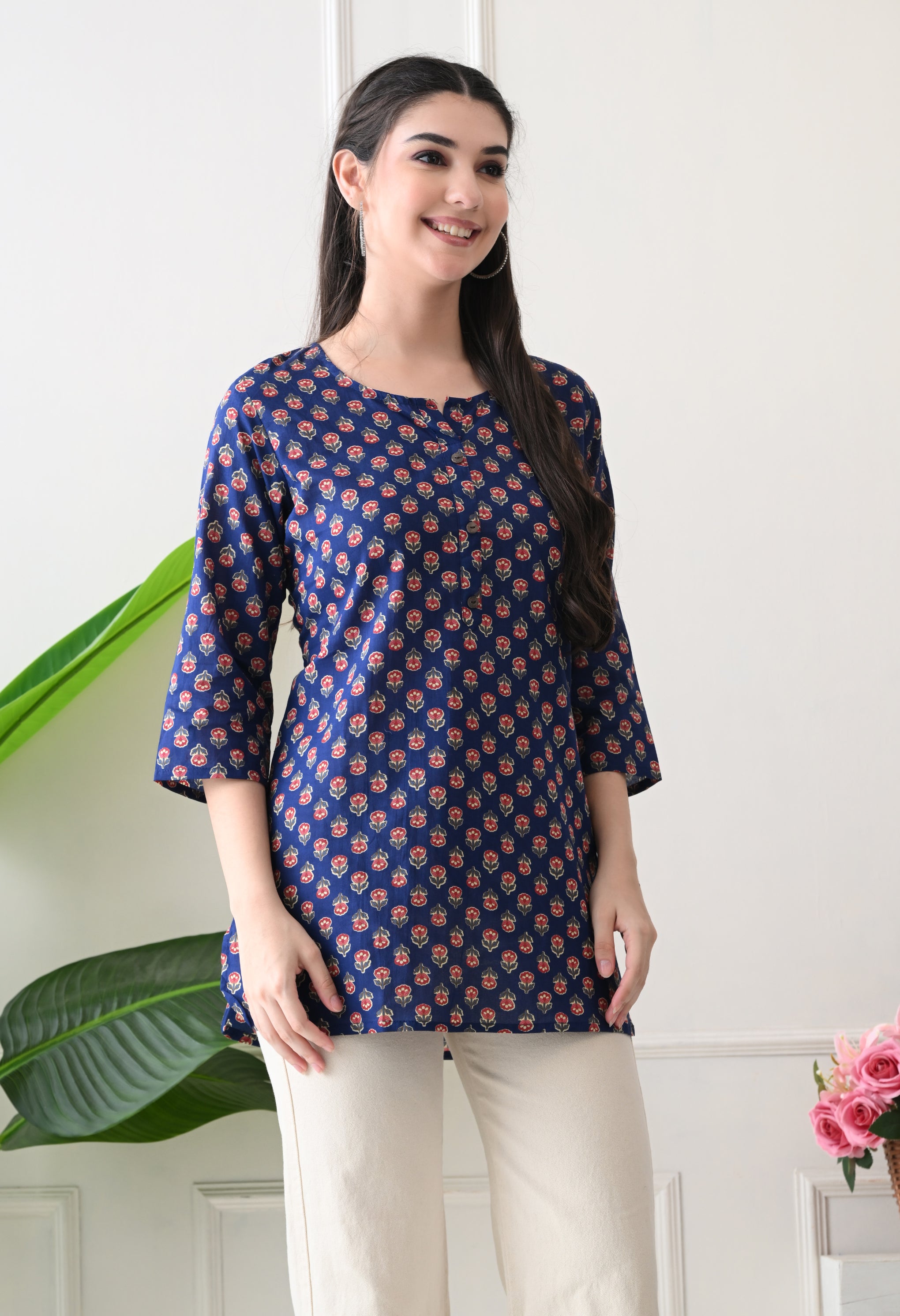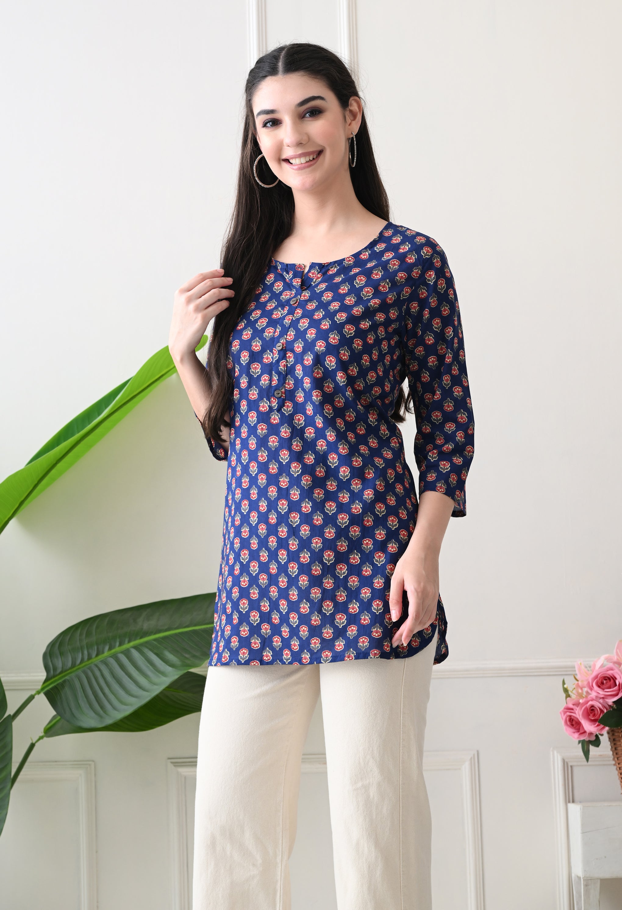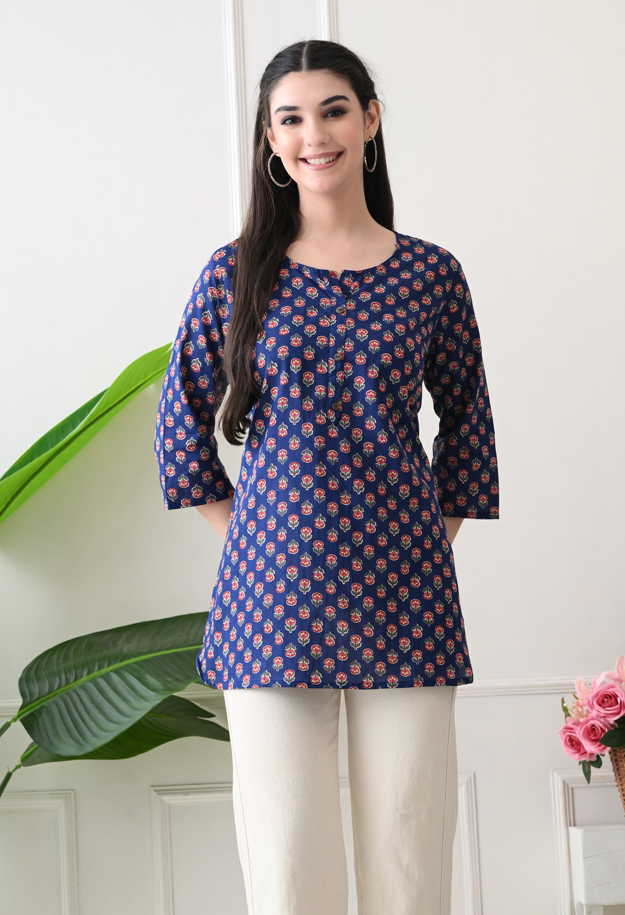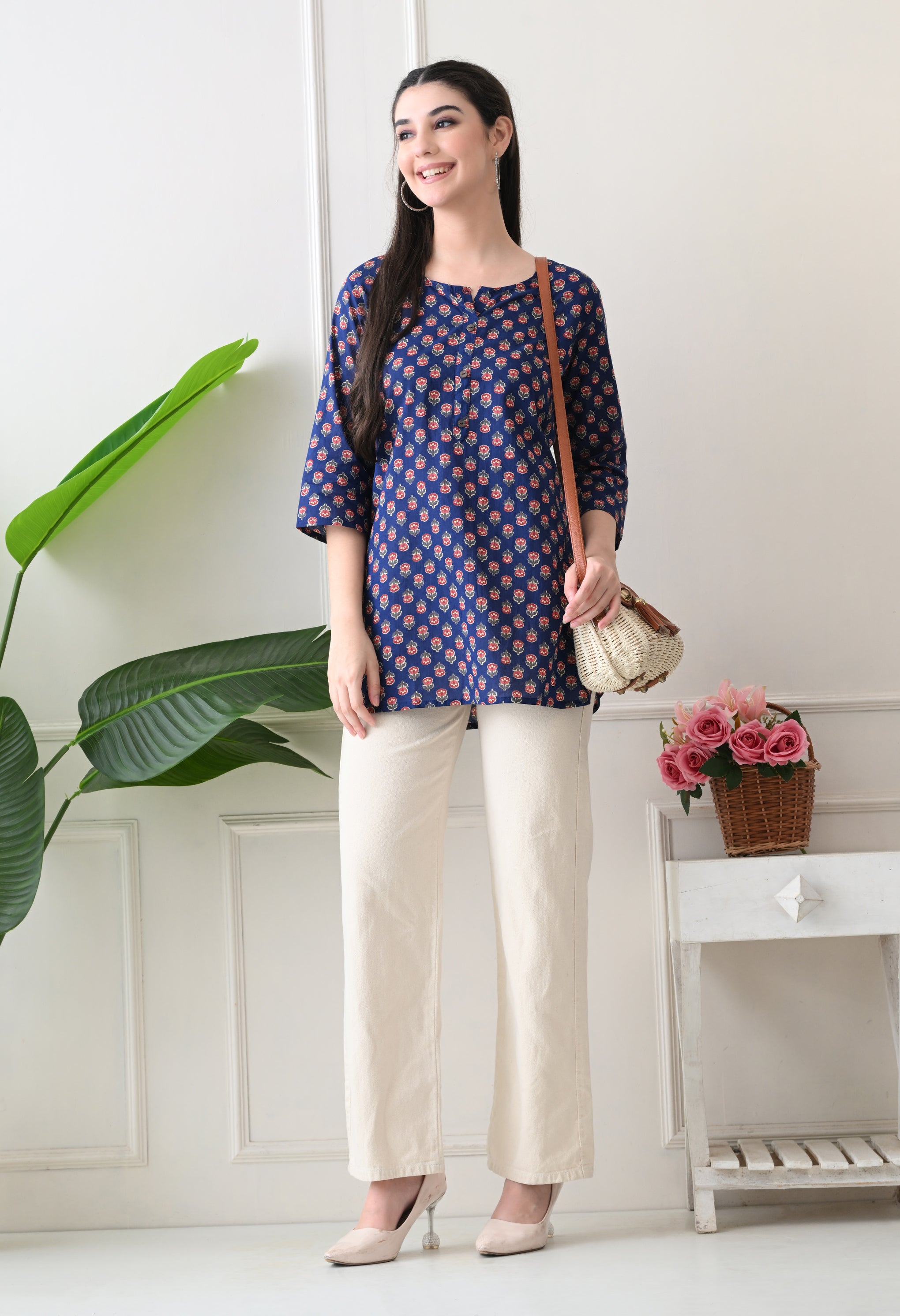 Step into everyday elegance with this Navy Micro Butti Pure Cotton Casual Top for women. Made from premium breathable cotton, it ensures comfort and ease of movement throughout the day. The micro butti print in a classic navy shade adds a subtle yet stylish charm. Featuring 3/4th sleeves and a relaxed silhouette, this top is perfect for casual outings, college, or office wear. Pair it effortlessly with jeans, trousers, or skirts for a smart and versatile look.