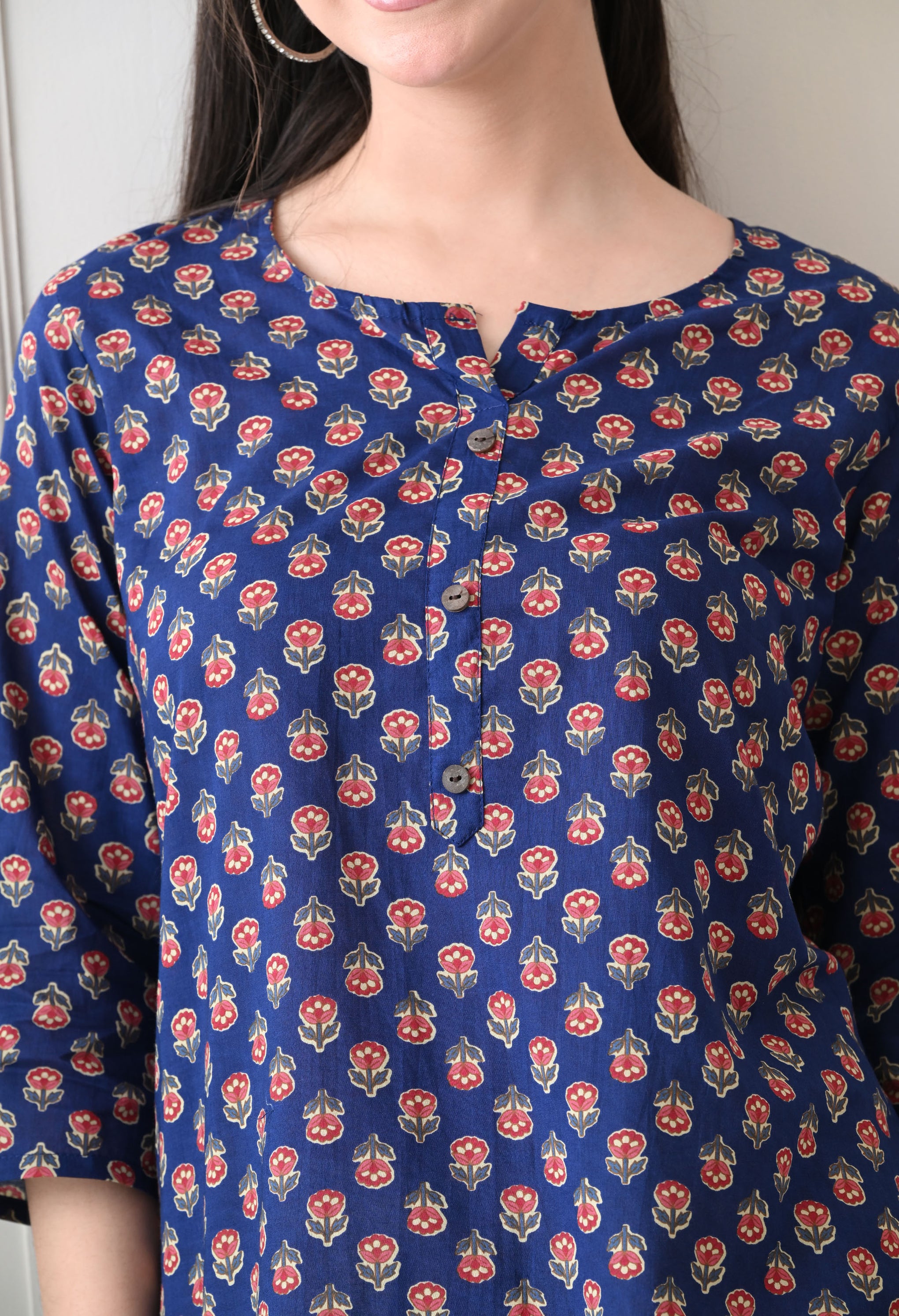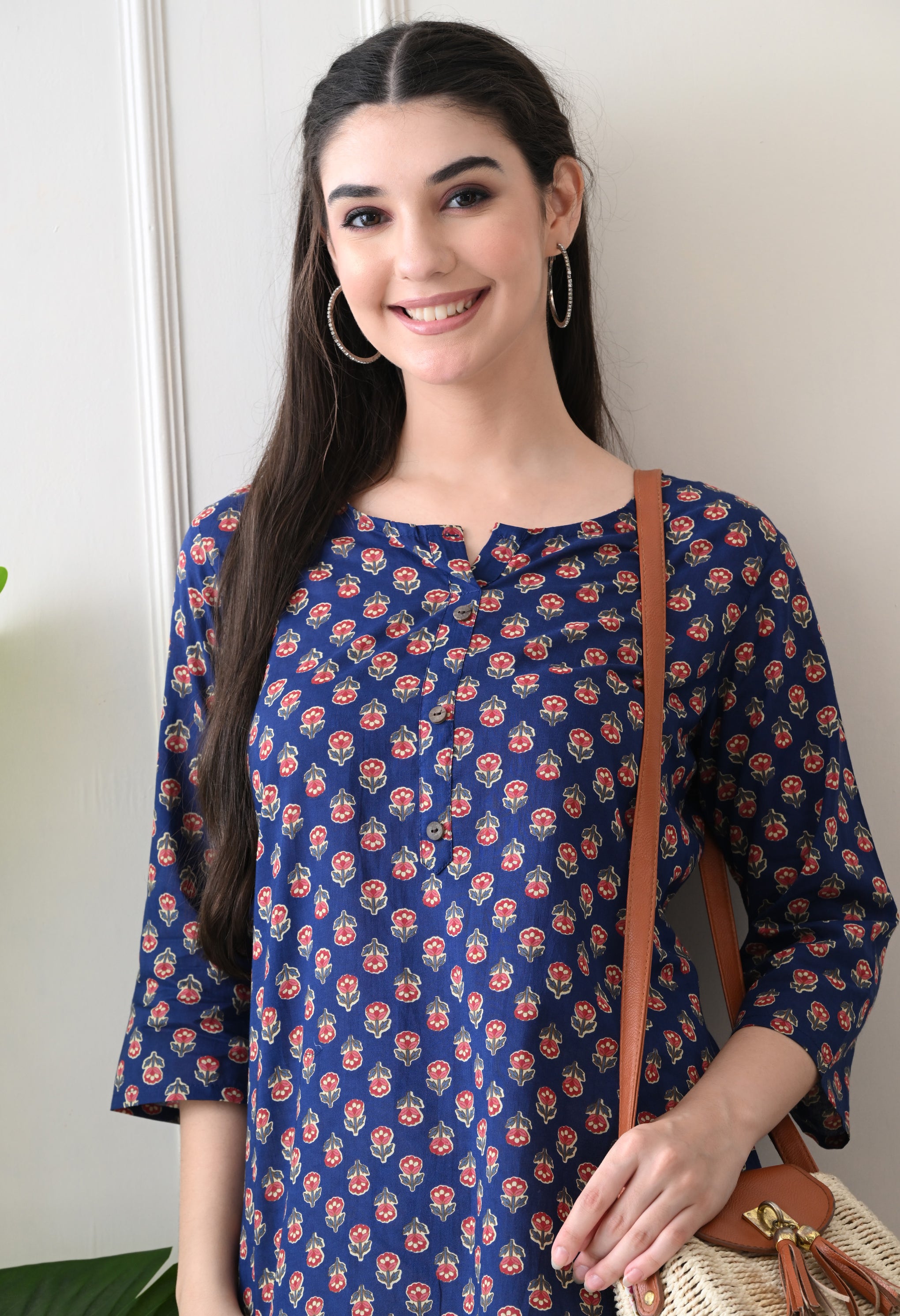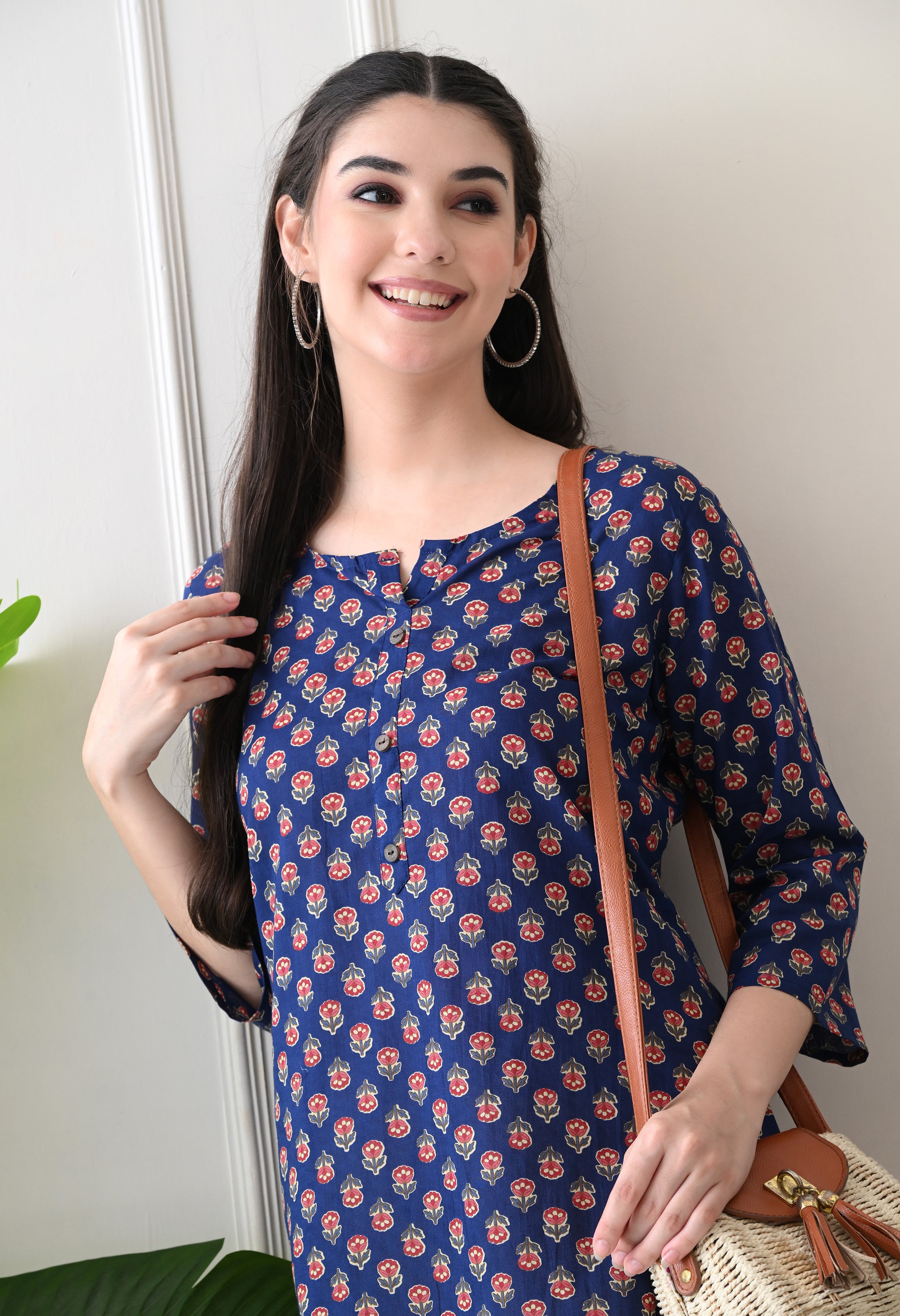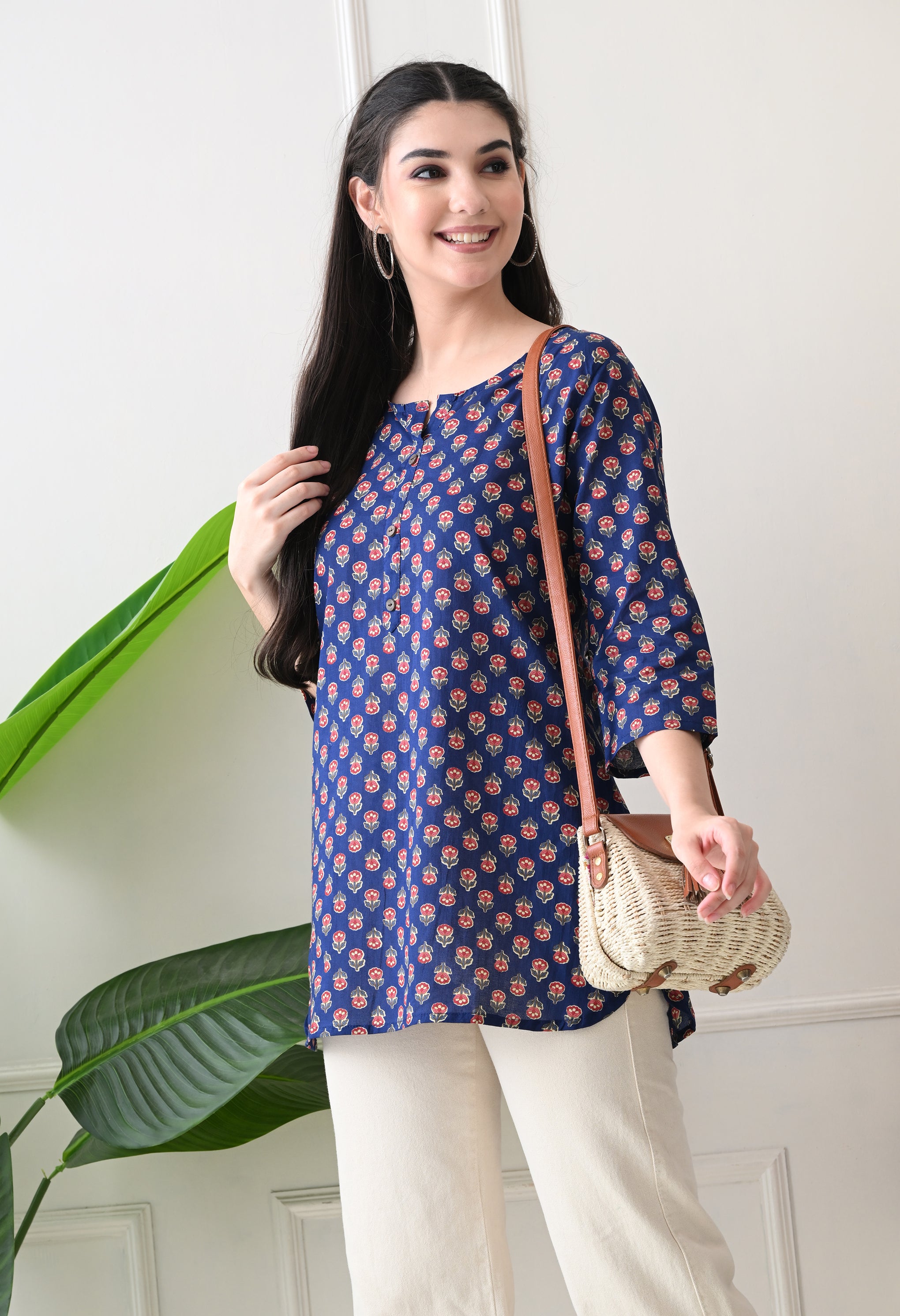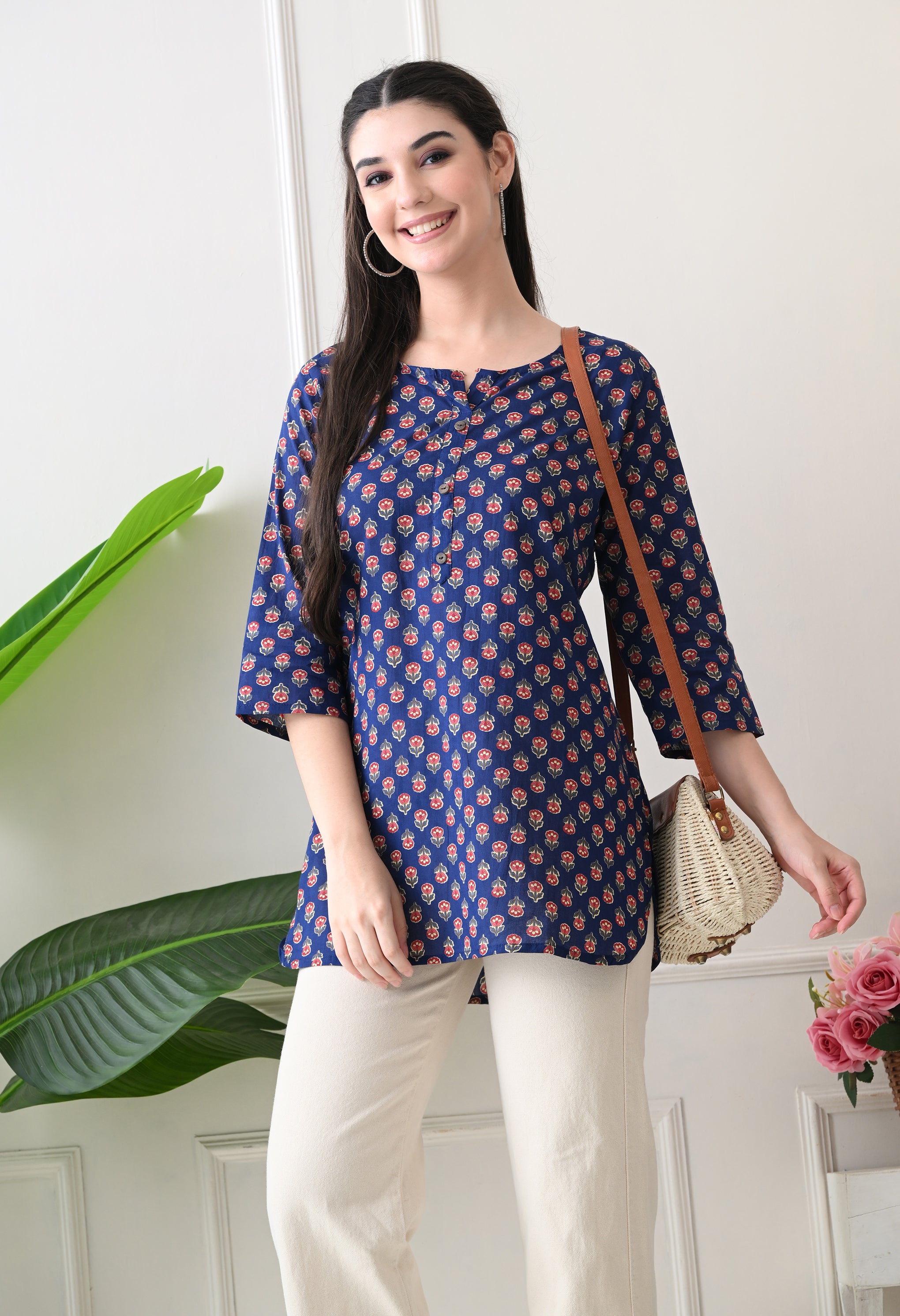Step into everyday elegance with this Navy Micro Butti Pure Cotton Casual Top for women. Made from premium breathable cotton, it ensures comfort and ease of movement throughout the day. The micro butti print in a classic navy shade adds a subtle yet stylish charm. Featuring 3/4th sleeves and a relaxed silhouette, this top is perfect for casual outings, college, or office wear. Pair it effortlessly with jeans, trousers, or skirts for a smart and versatile look.