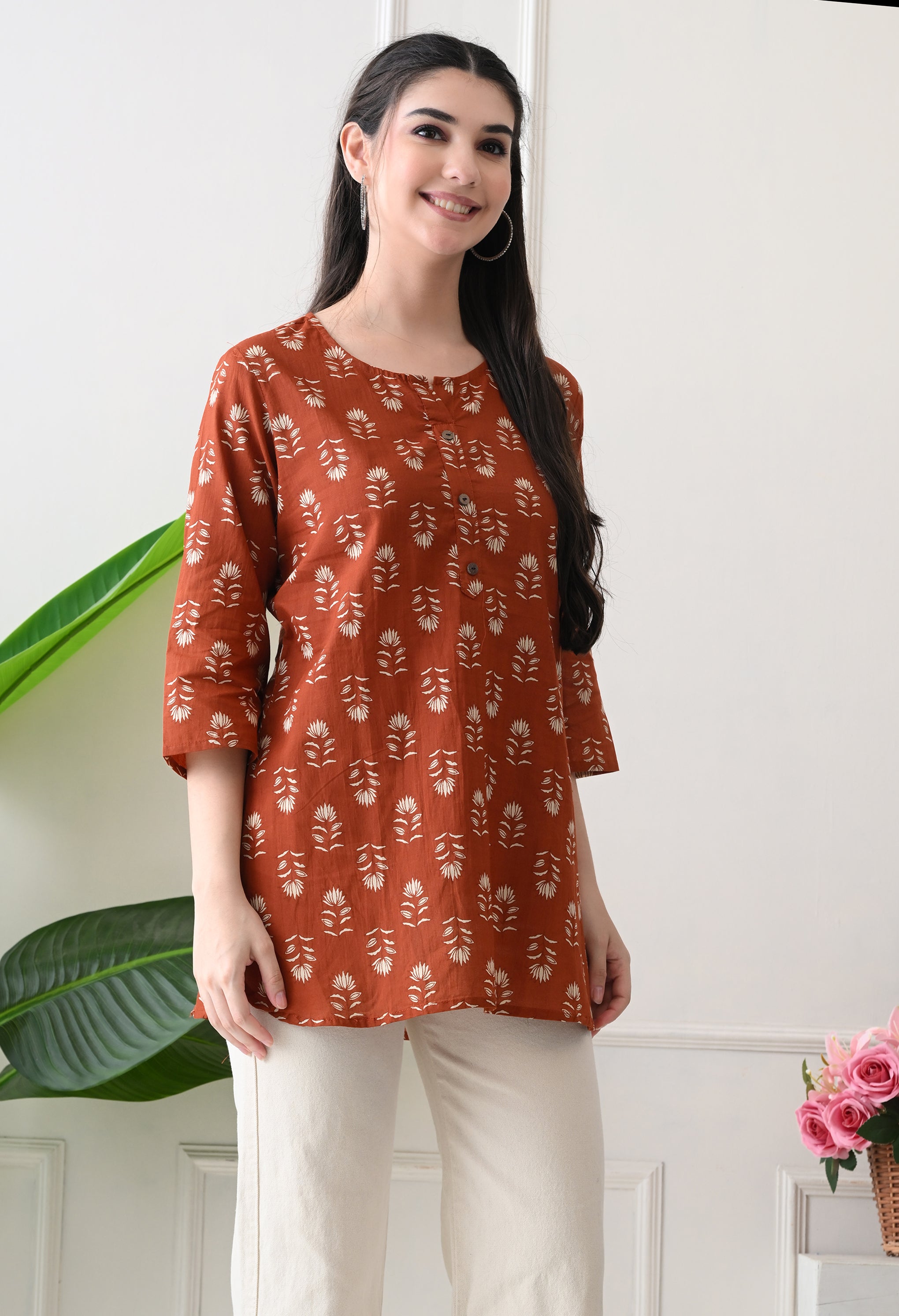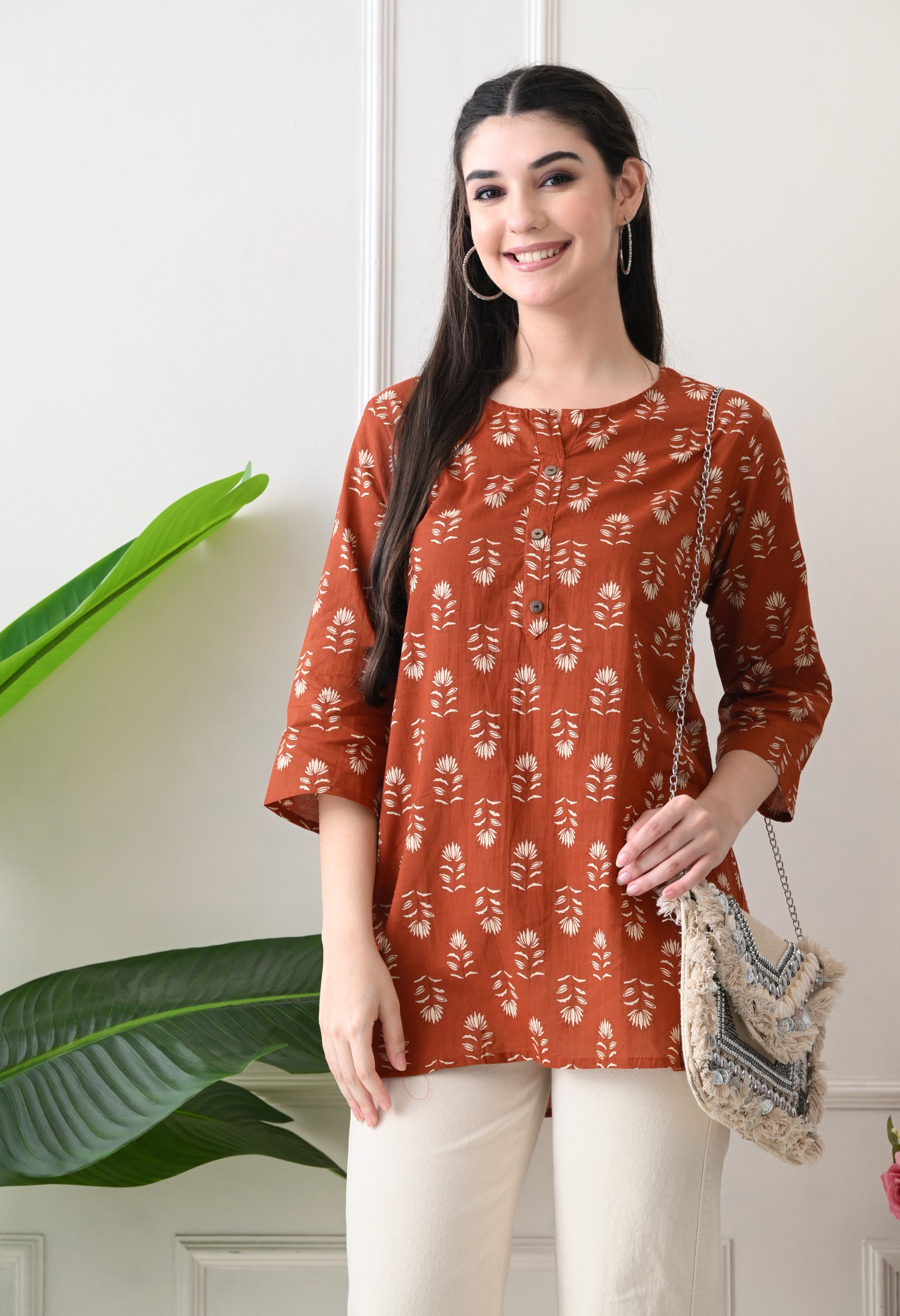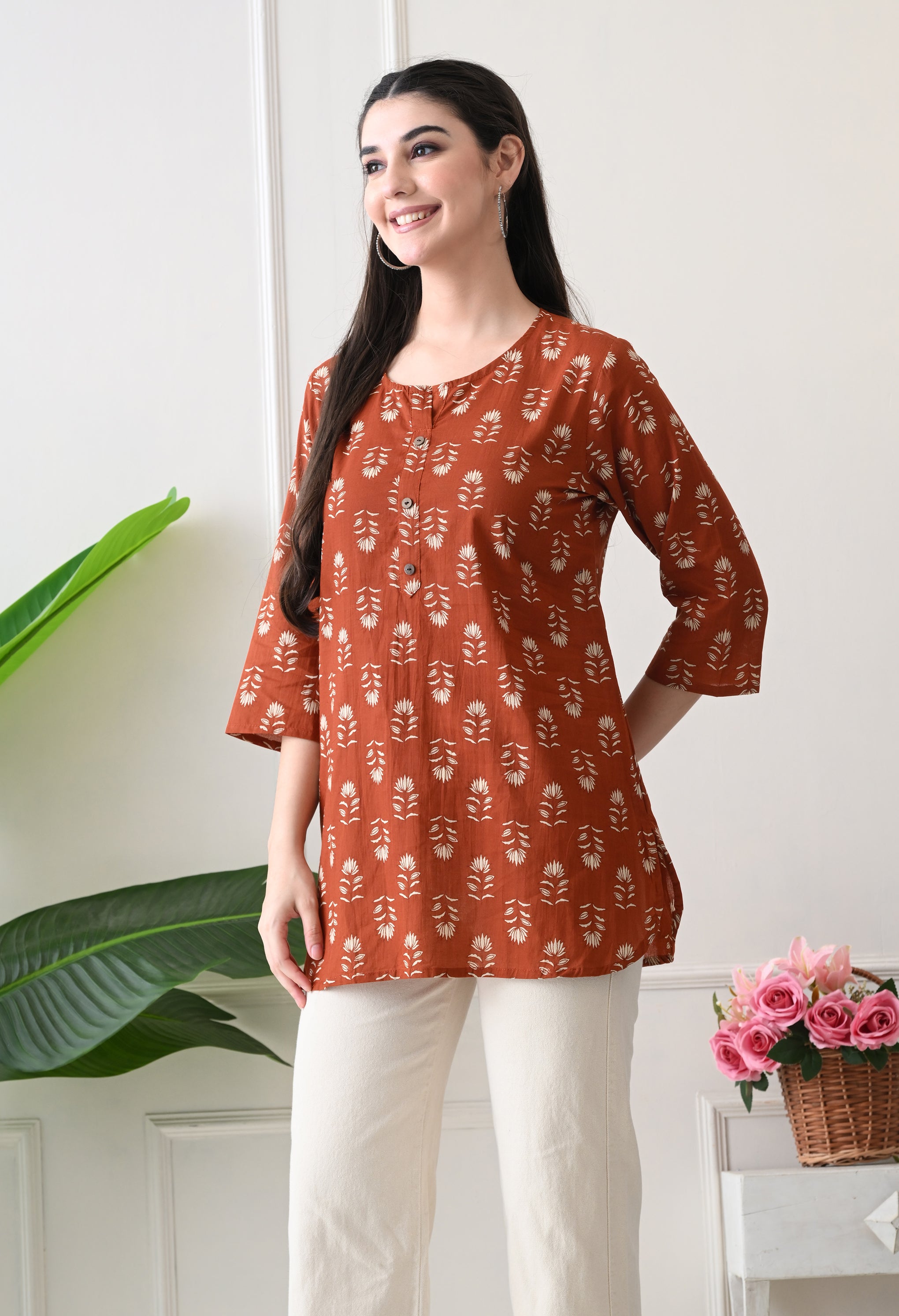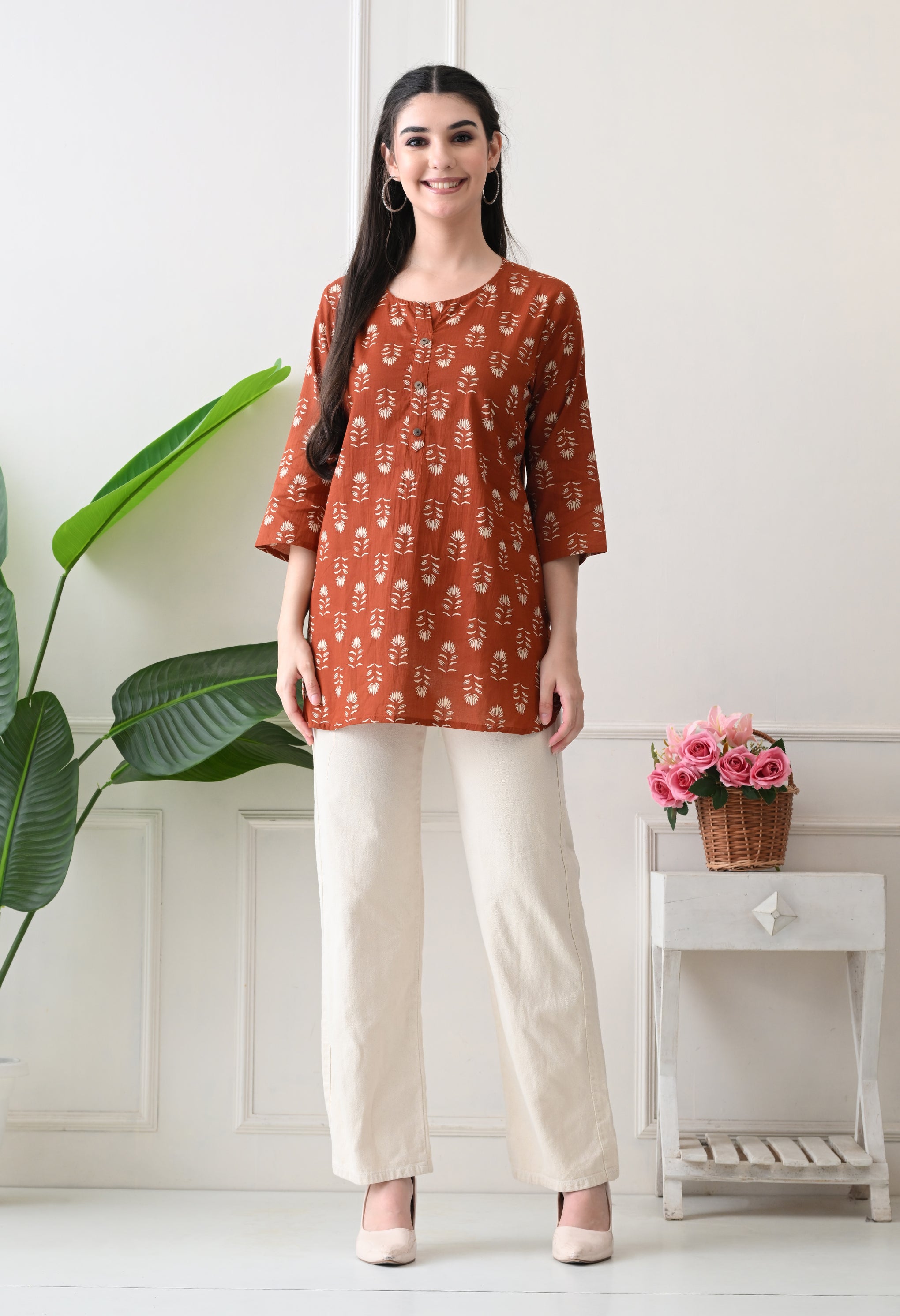 ing timeless charm to your wardrobe with this Rustic Butti Pure Cotton Casual Top for women. Made from soft, breathable cotton, it ensures all-day comfort while keeping your style effortless. The subtle butti print in a rustic shade adds a touch of traditional elegance. Featuring 3/4th sleeves and a relaxed fit, this top is perfect for casual outings, office wear, or college. Pair it with jeans, trousers, or palazzos for a versatile and chic look.