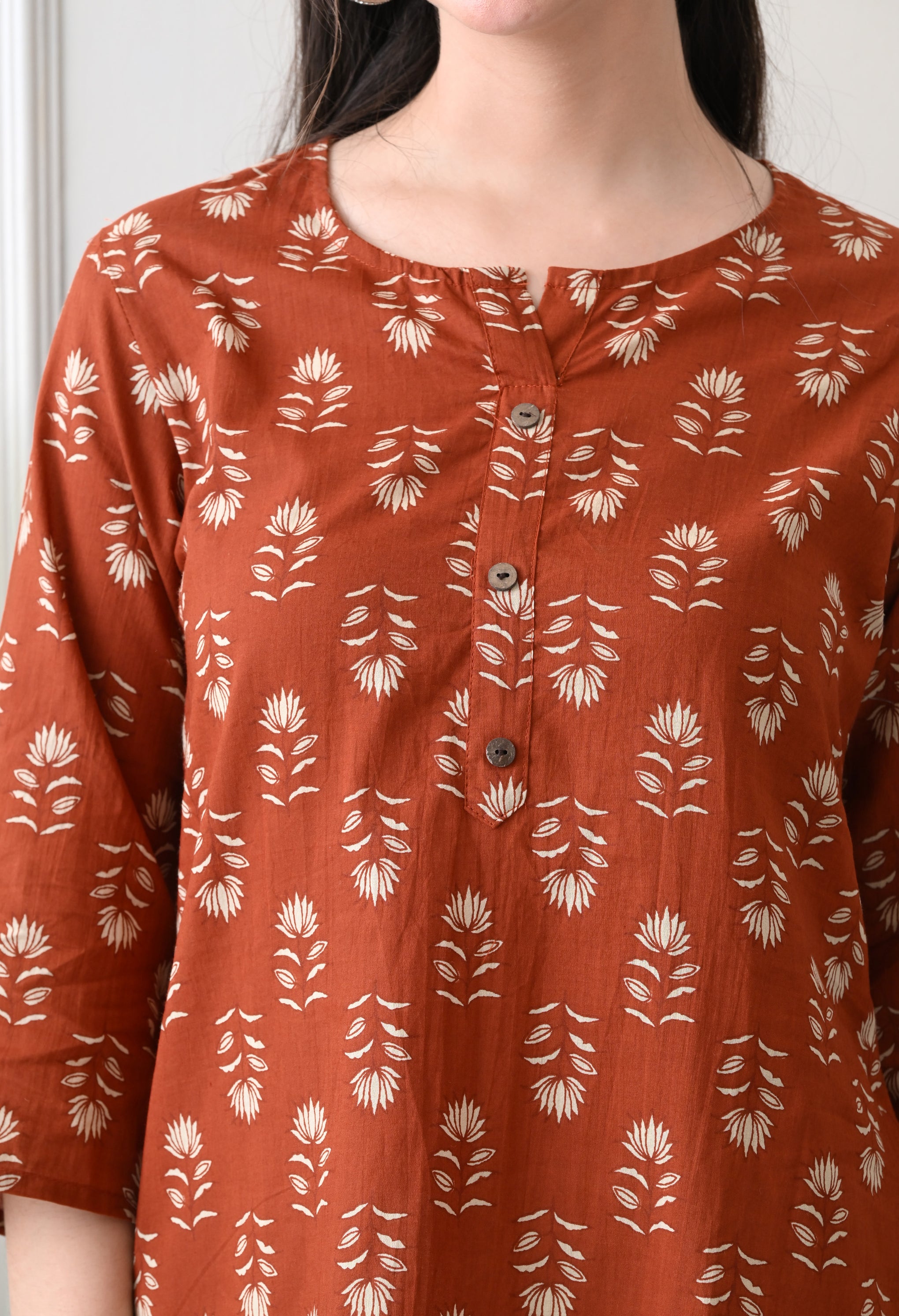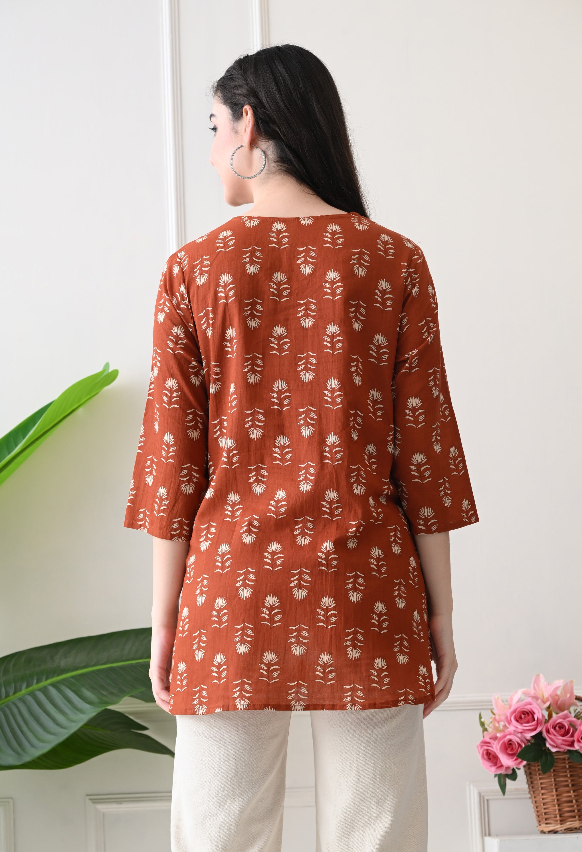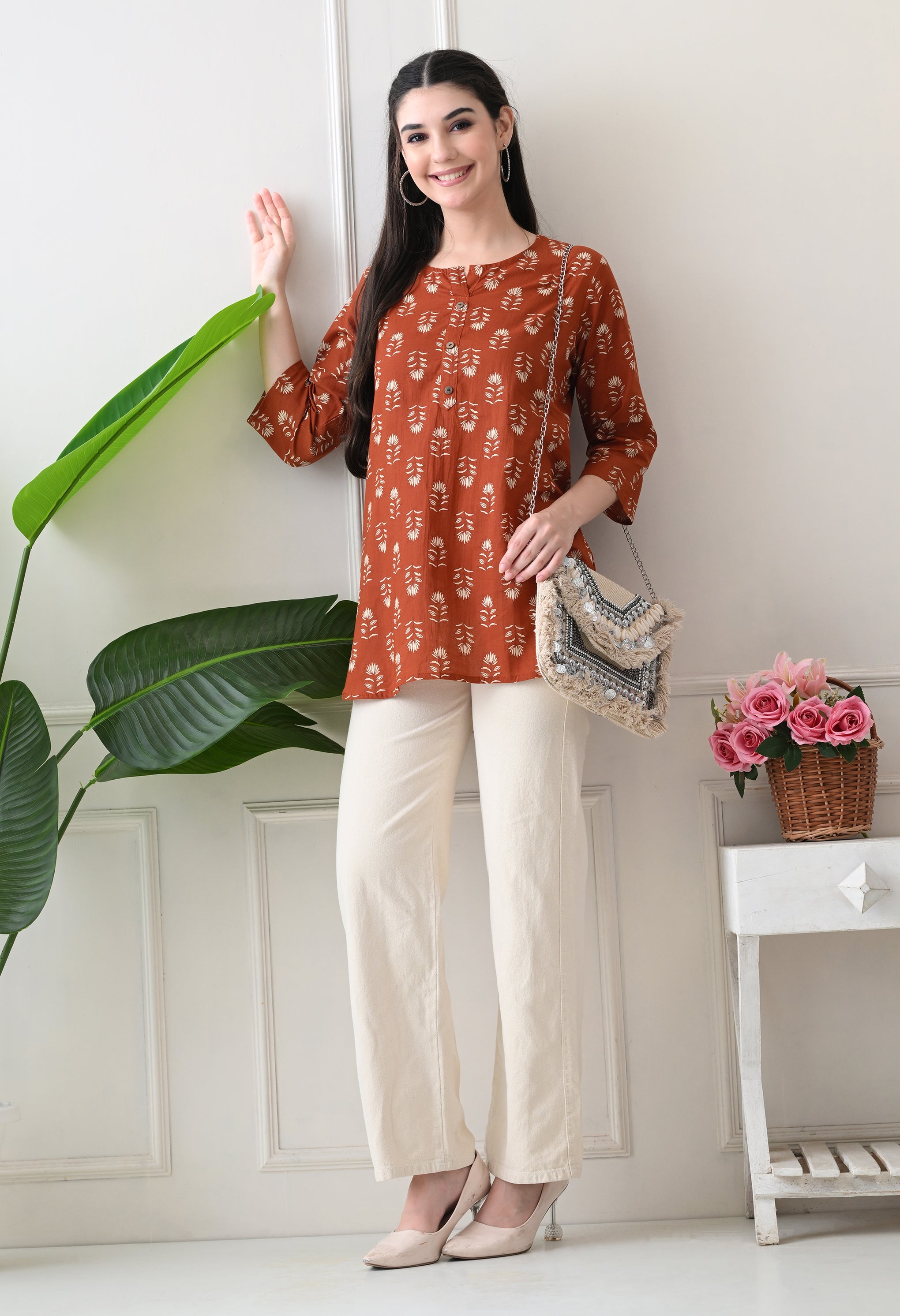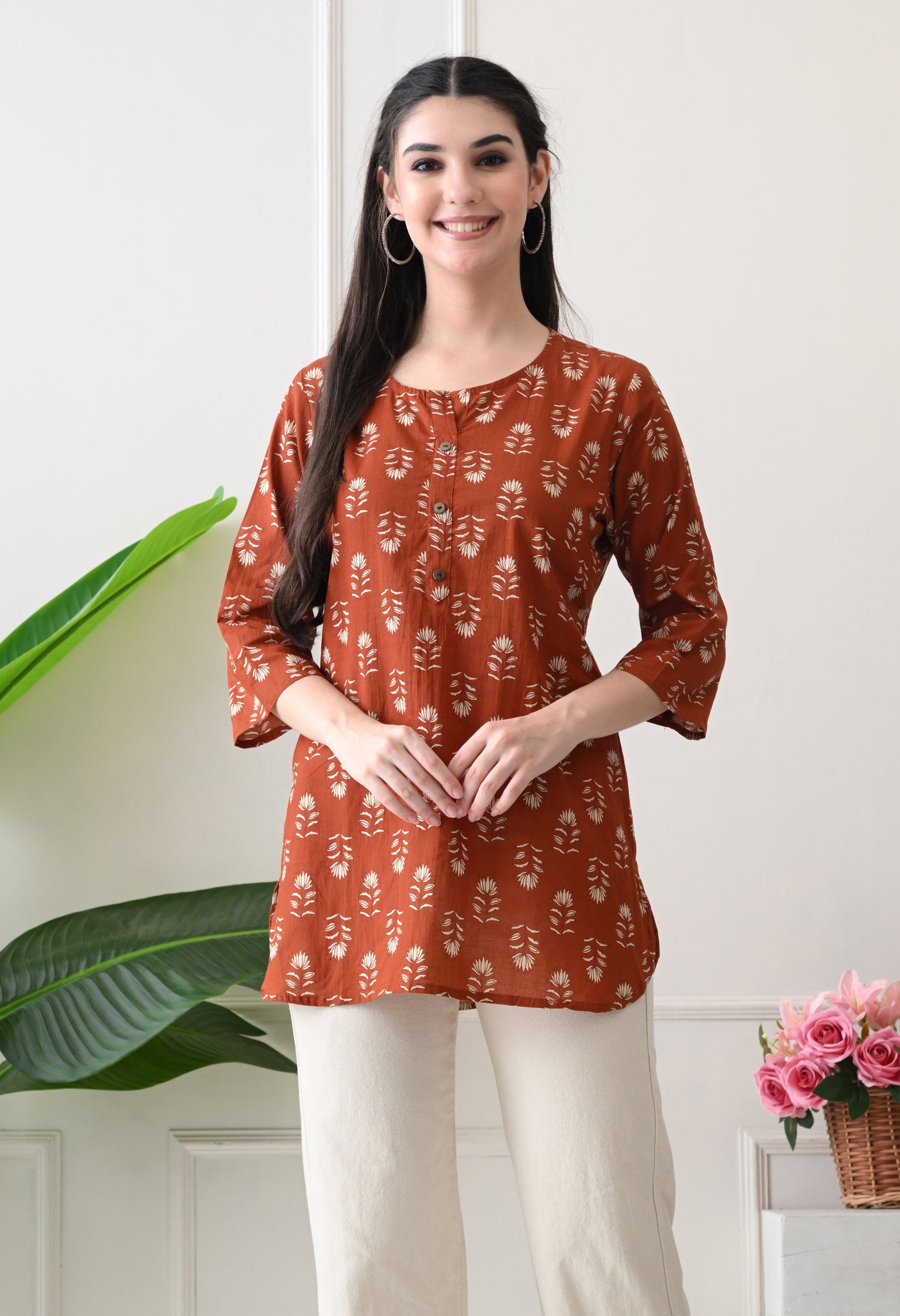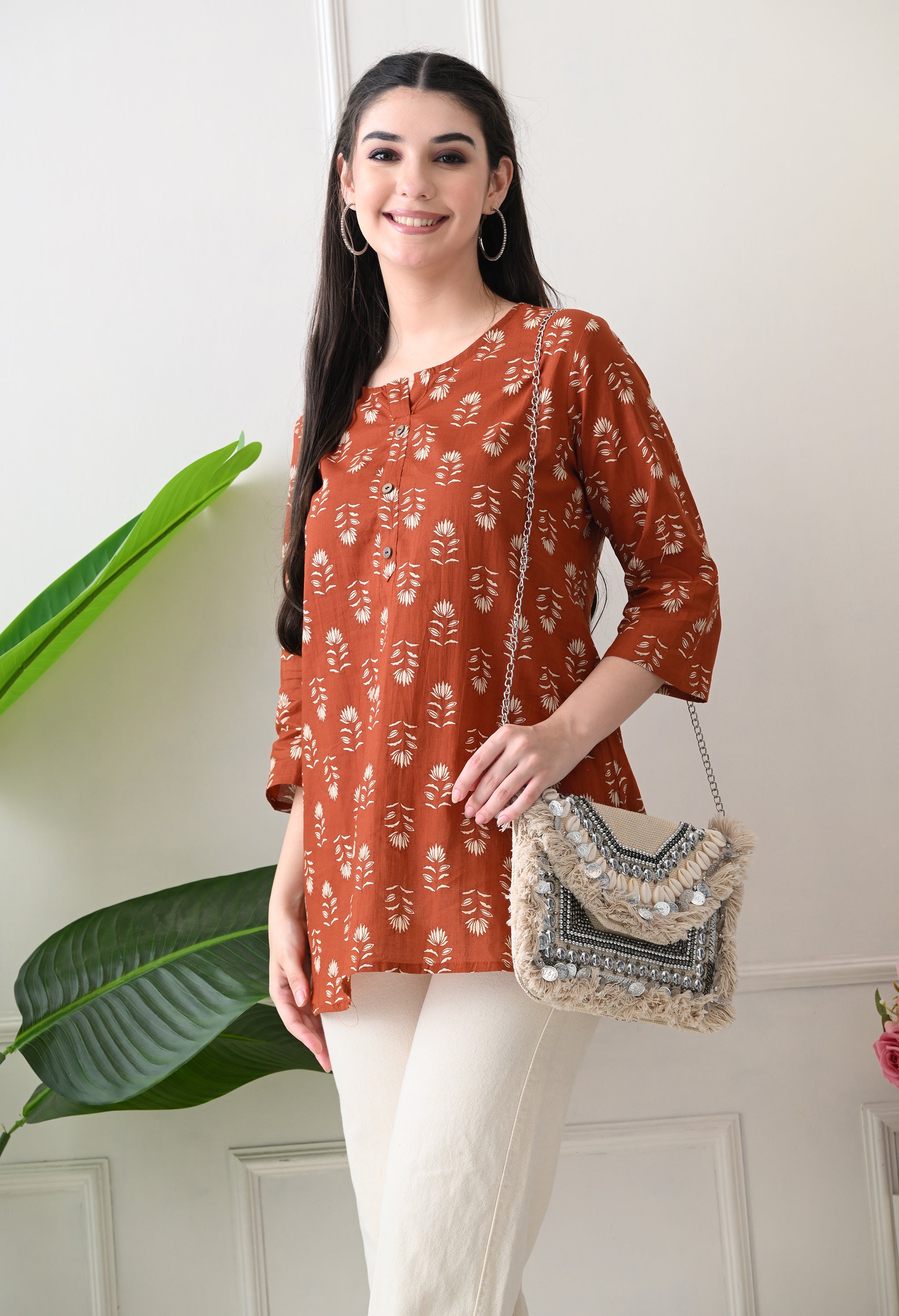 ing timeless charm to your wardrobe with this Rustic Butti Pure Cotton Casual Top for women. Made from soft, breathable cotton, it ensures all-day comfort while keeping your style effortless. The subtle butti print in a rustic shade adds a touch of traditional elegance. Featuring 3/4th sleeves and a relaxed fit, this top is perfect for casual outings, office wear, or college. Pair it with jeans, trousers, or palazzos for a versatile and chic look.