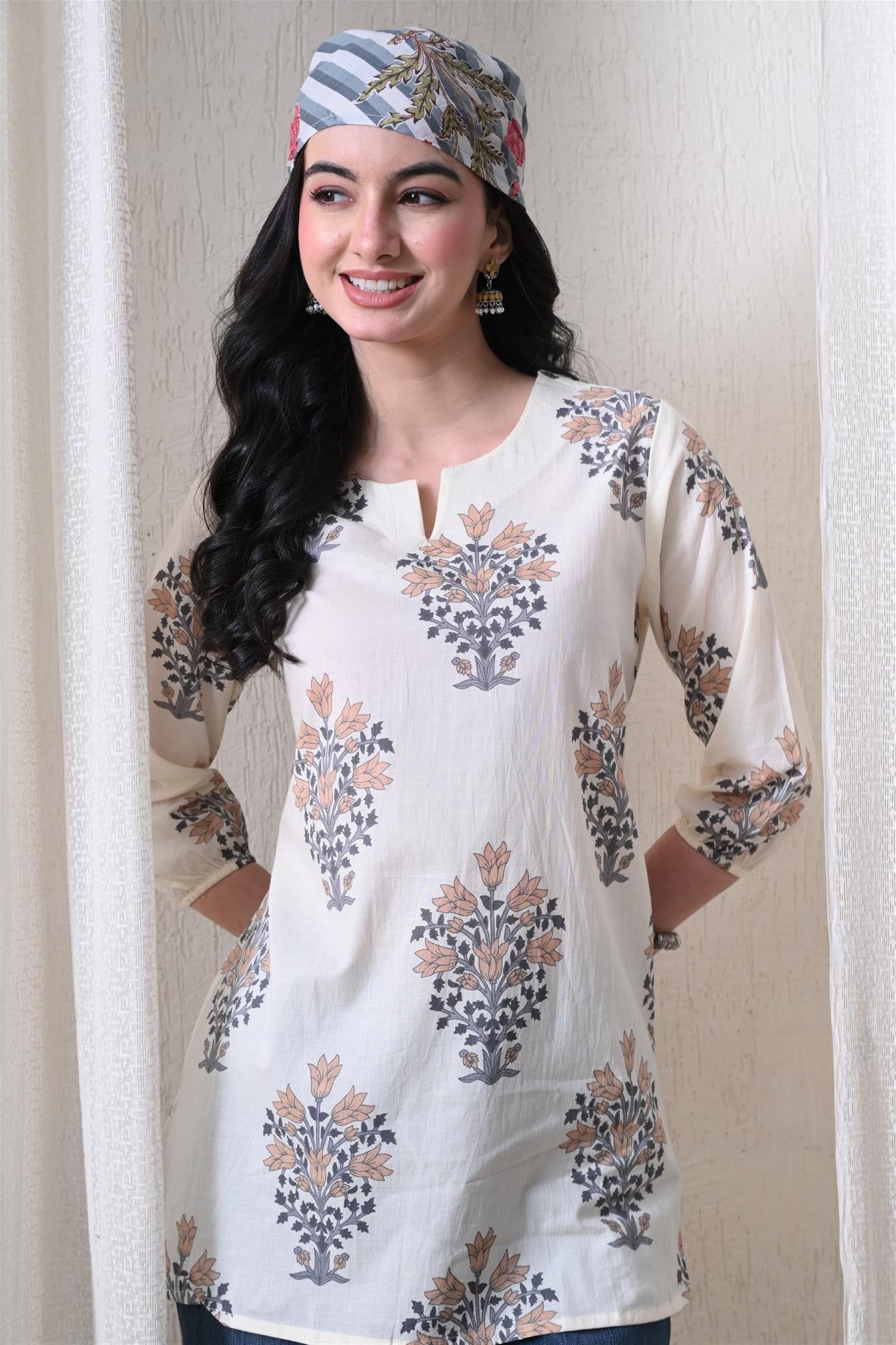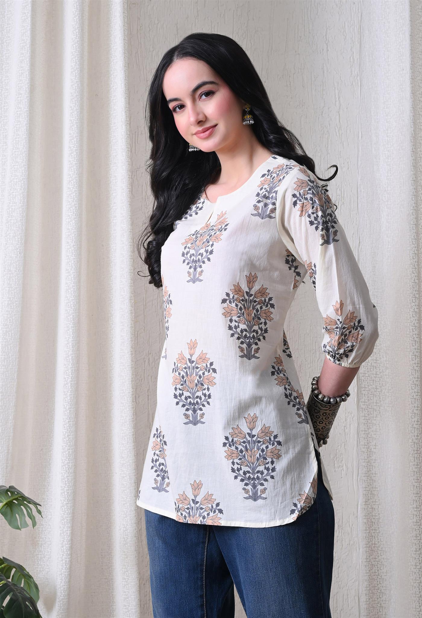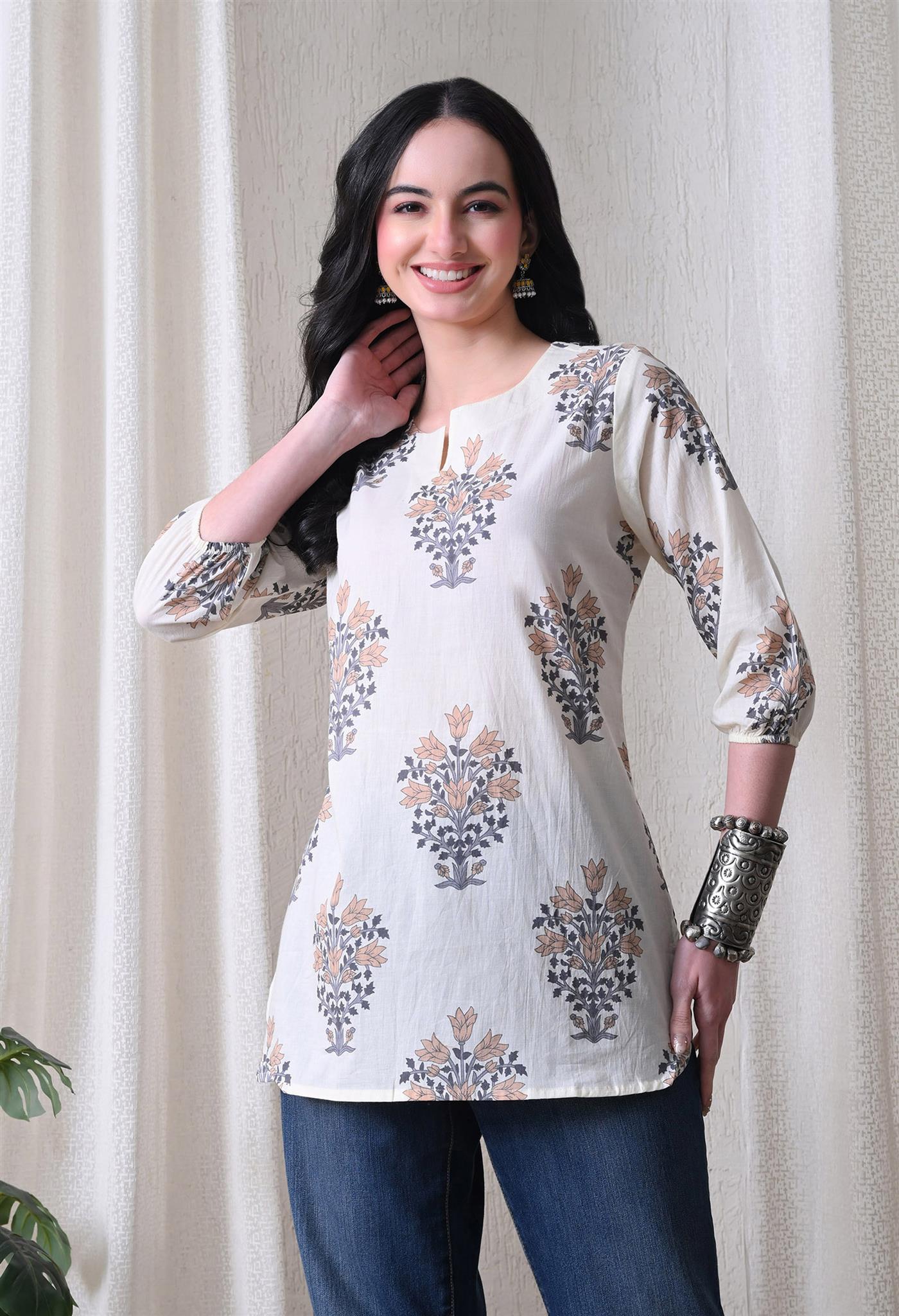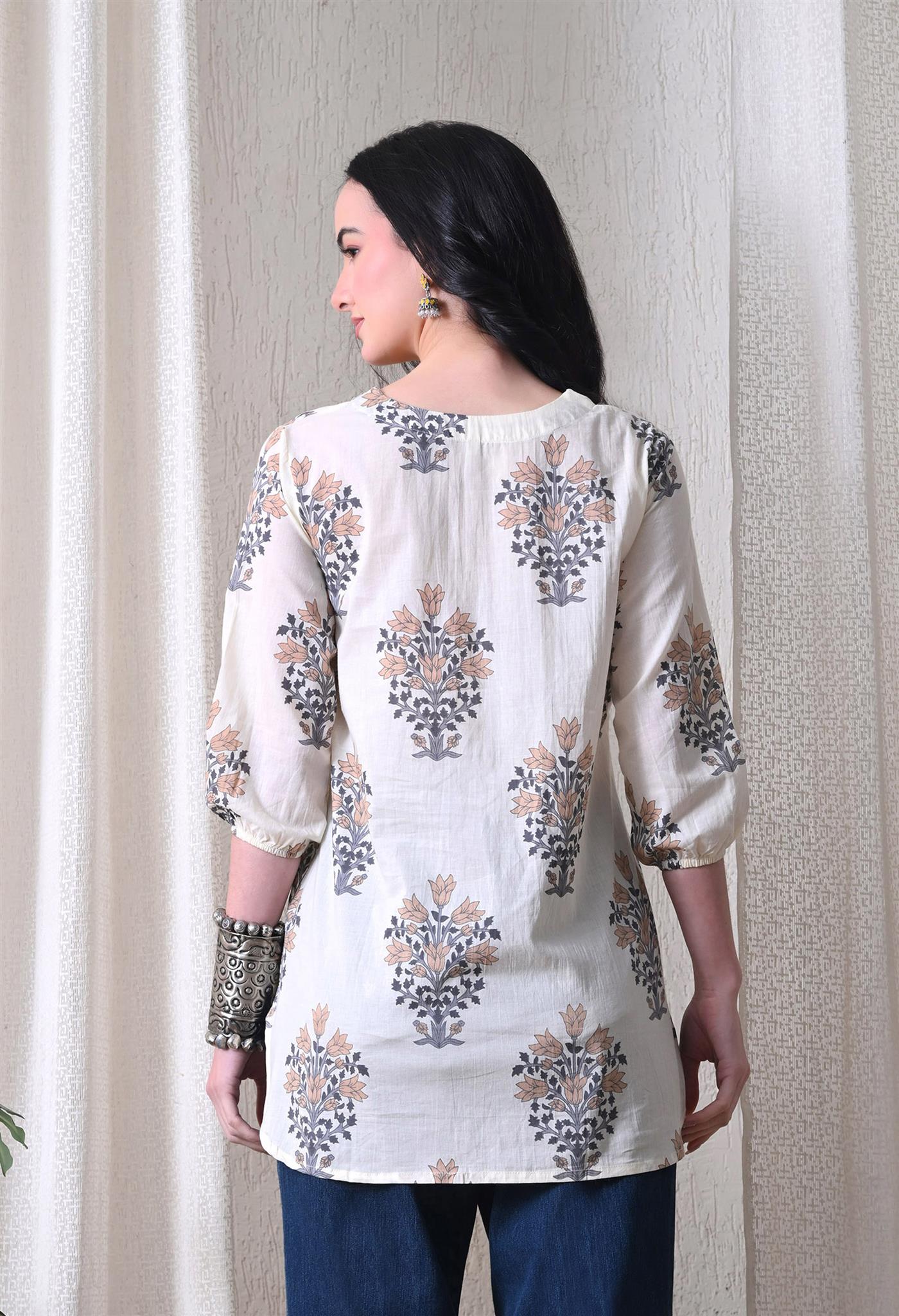 The elegant block print in a cream and brown combination adds a timeless ethnic charm, while the comfortable silhouette makes it easy to style for everyday wear. Designed with 3/4th sleeves, this top provides balanced coverage and versatile appeal, perfect for casual outings, workdays, or relaxed weekends.