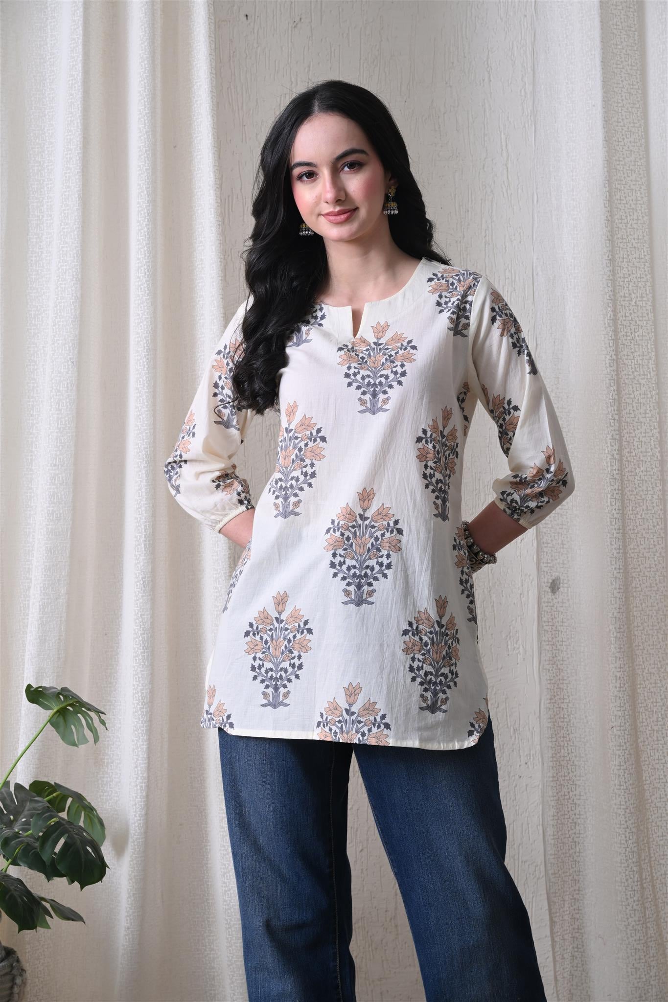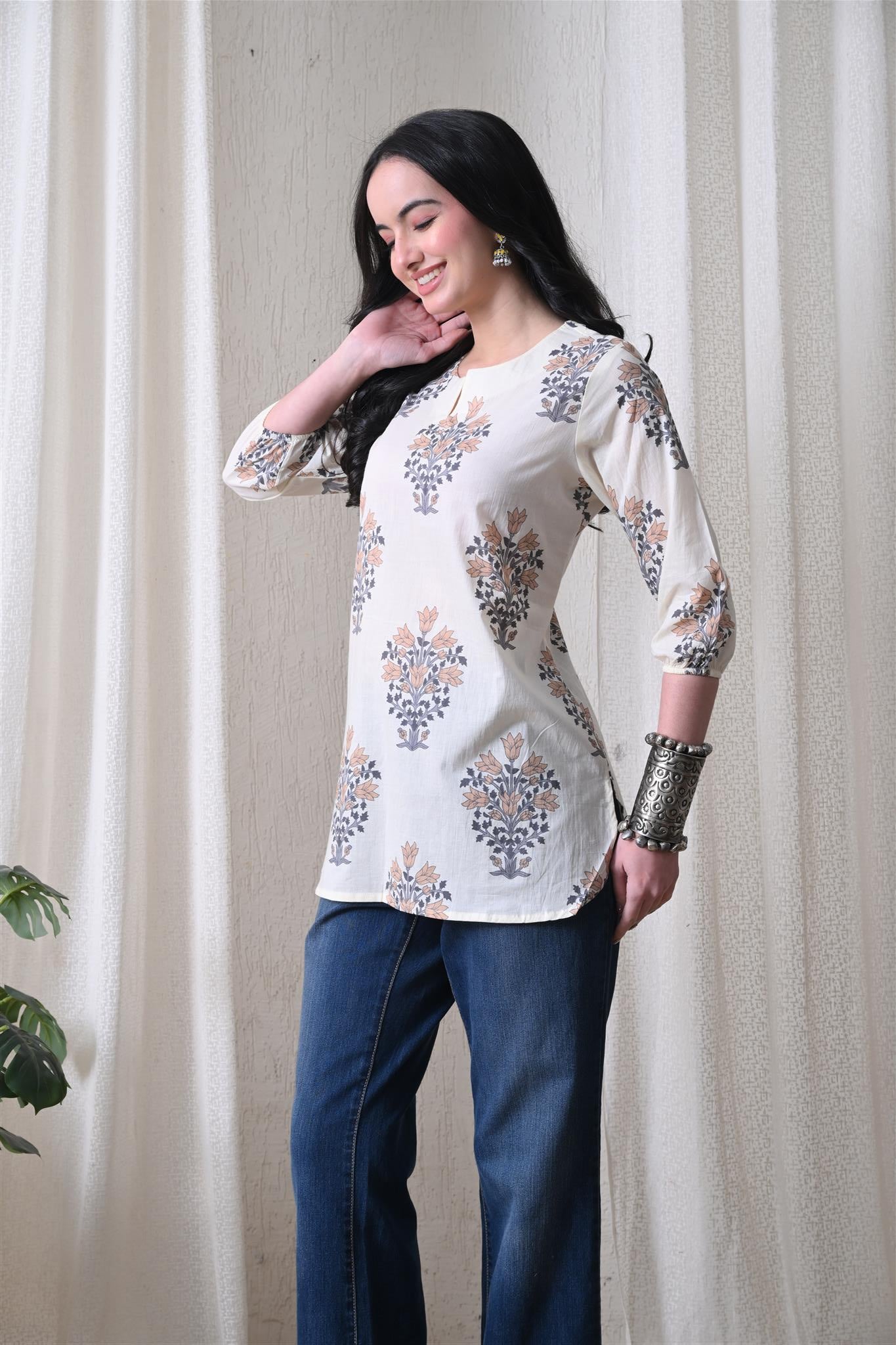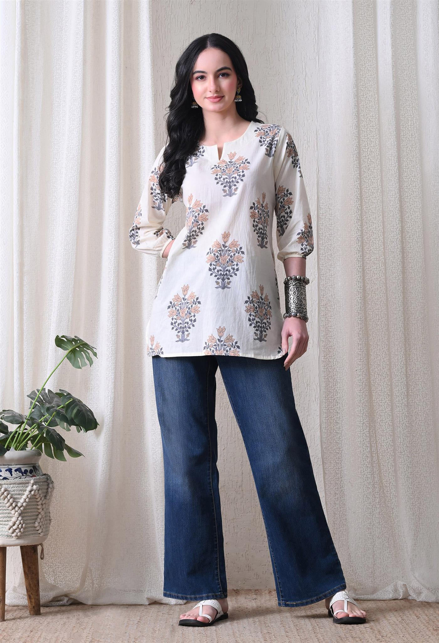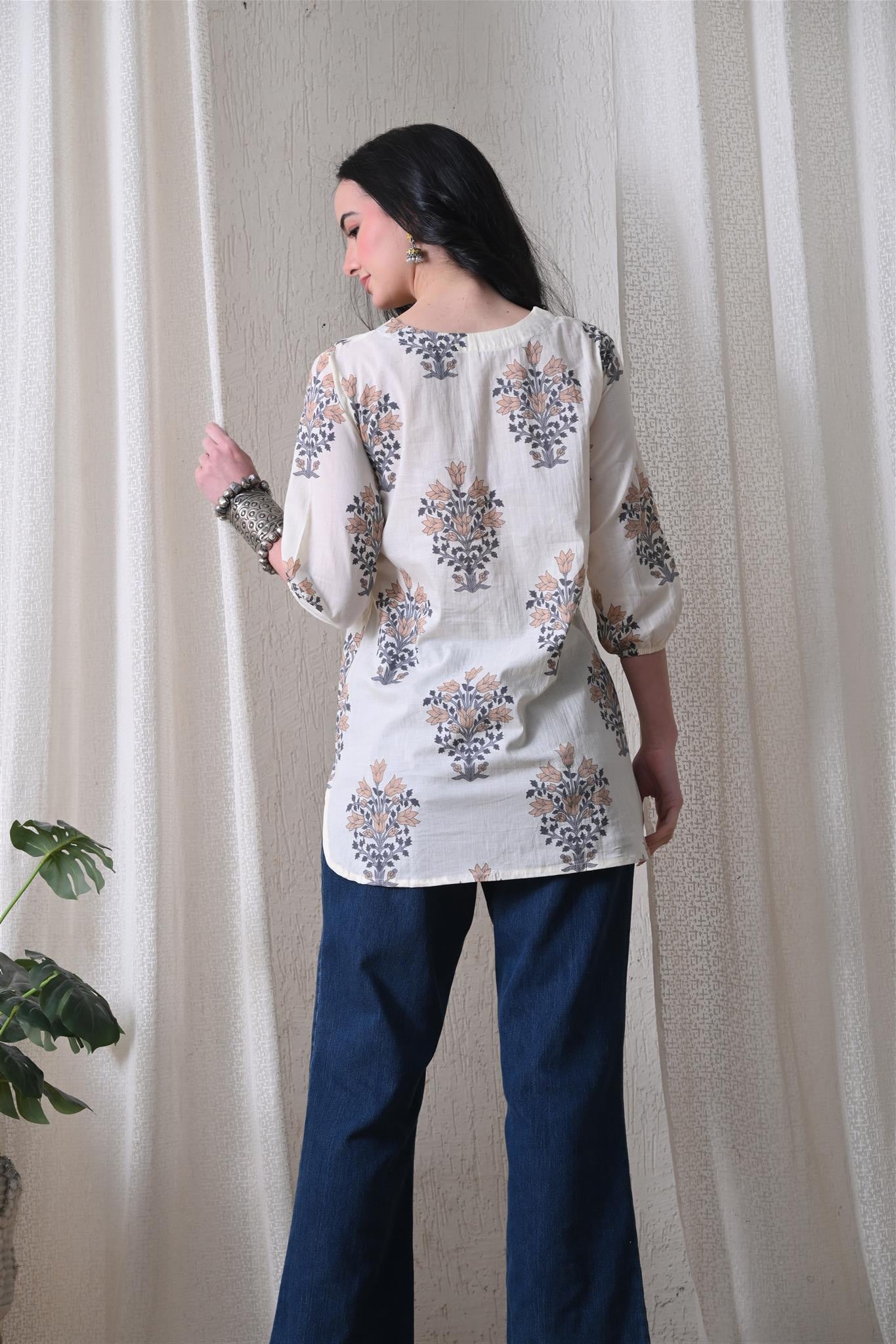 The elegant block print in a cream and brown combination adds a timeless ethnic charm, while the comfortable silhouette makes it easy to style for everyday wear. Designed with 3/4th sleeves, this top provides balanced coverage and versatile appeal, perfect for casual outings, workdays, or relaxed weekends.