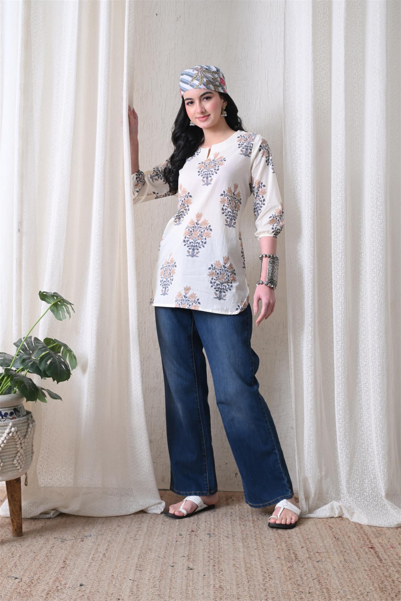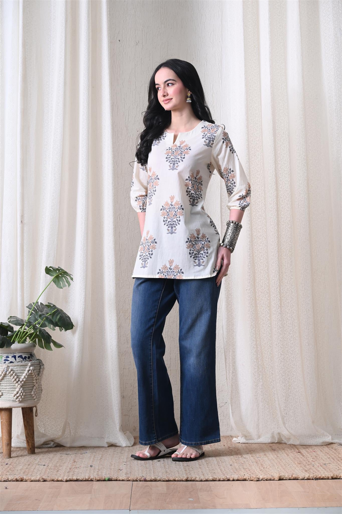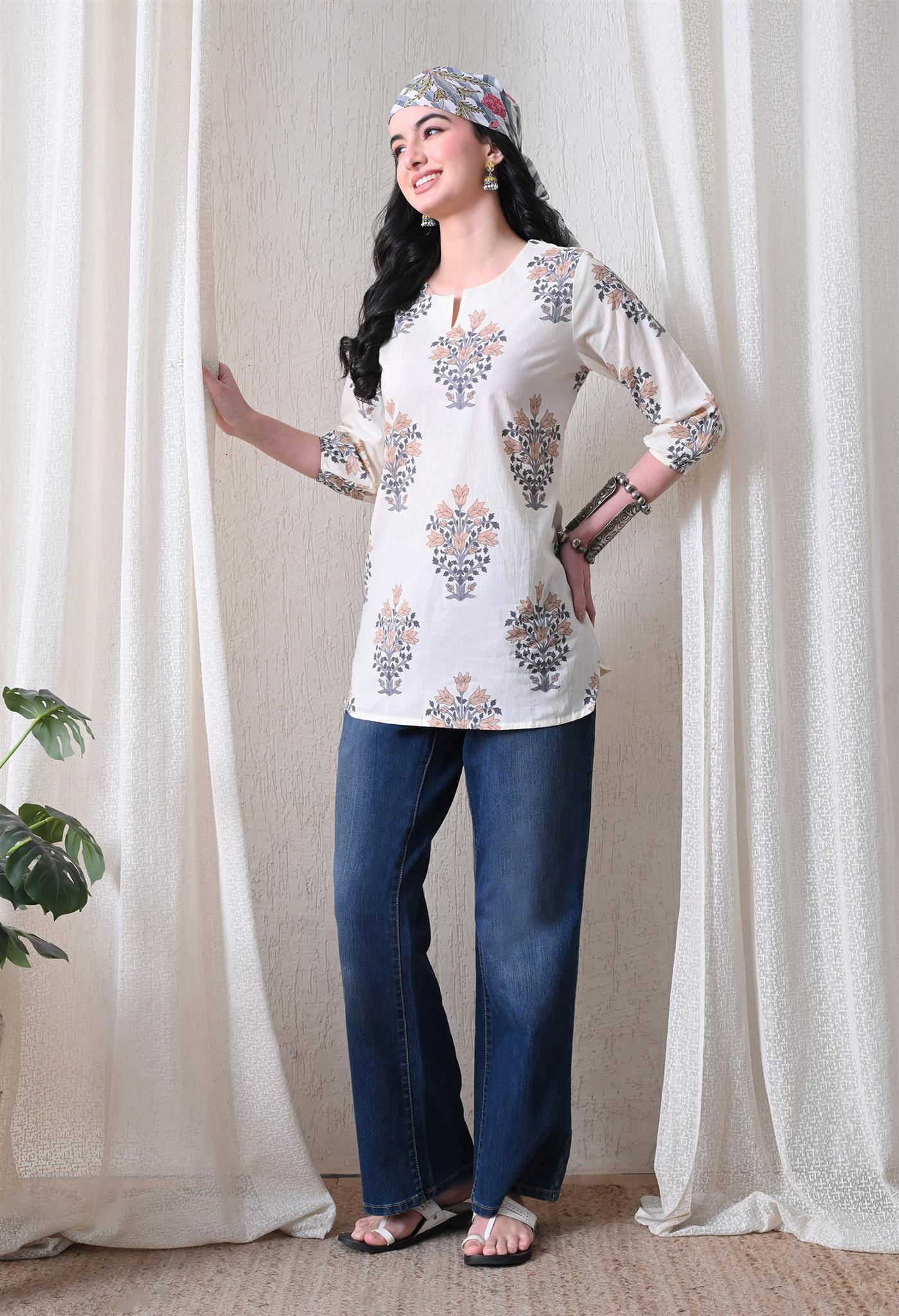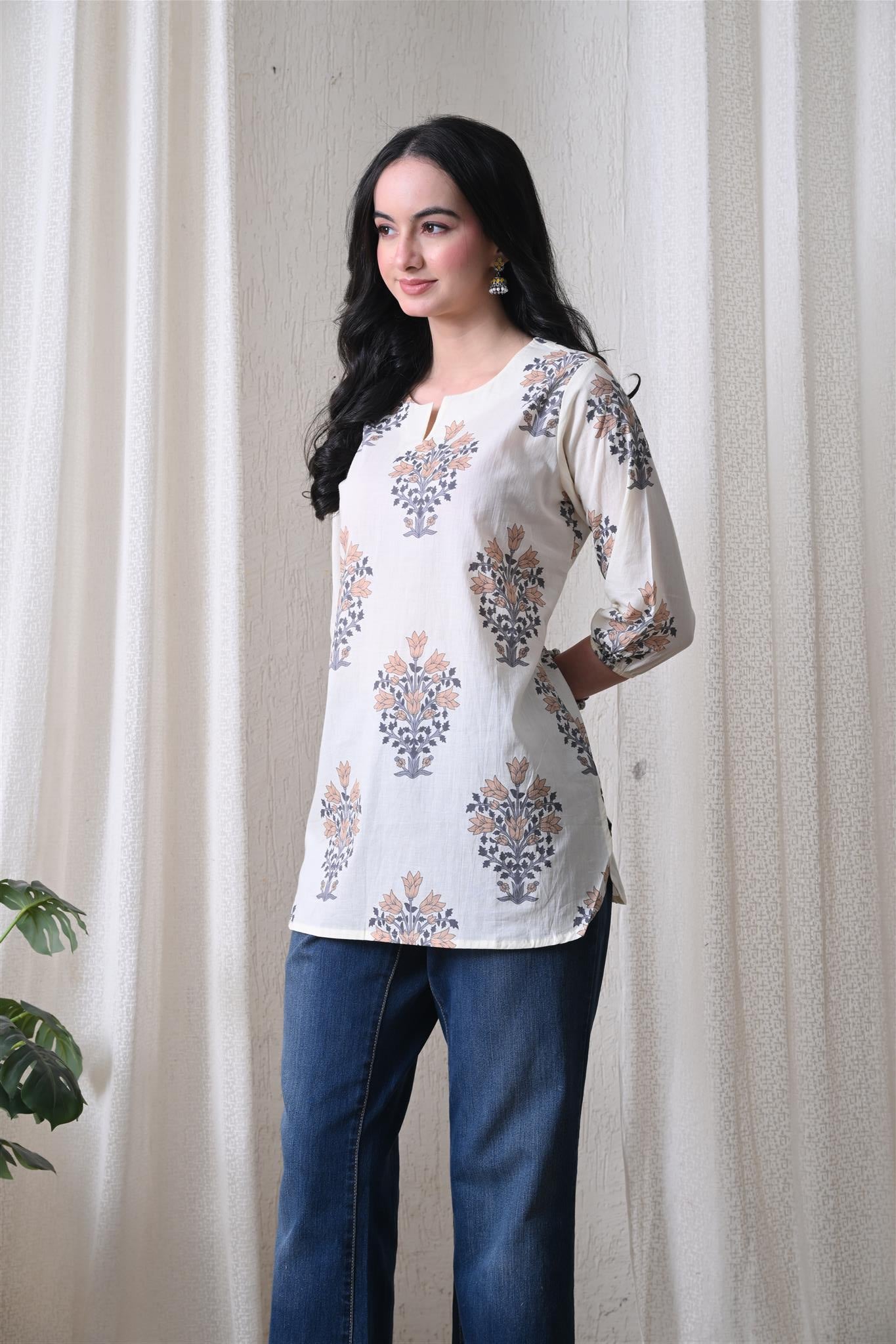 The elegant block print in a cream and brown combination adds a timeless ethnic charm, while the comfortable silhouette makes it easy to style for everyday wear. Designed with 3/4th sleeves, this top provides balanced coverage and versatile appeal, perfect for casual outings, workdays, or relaxed weekends.