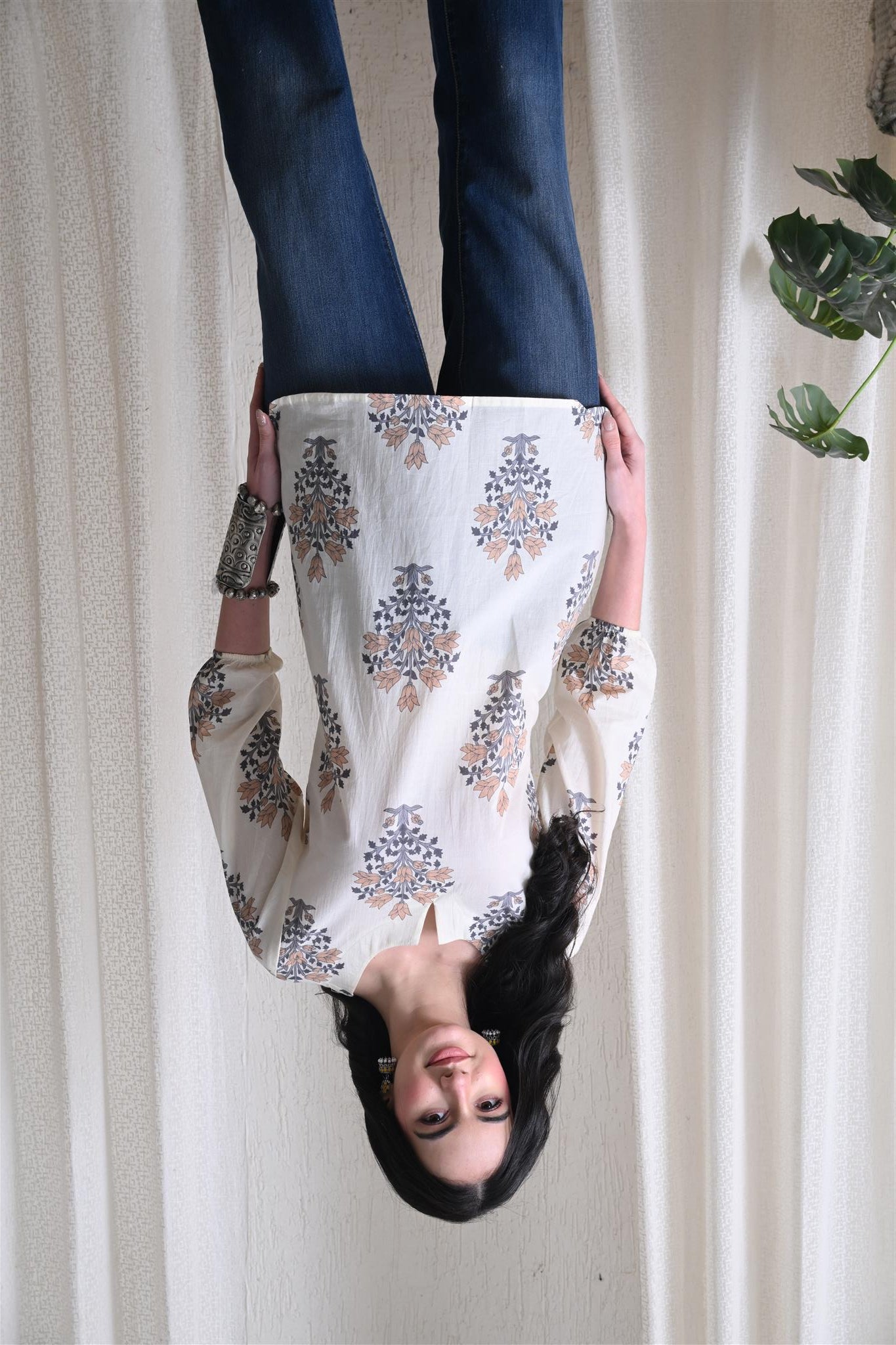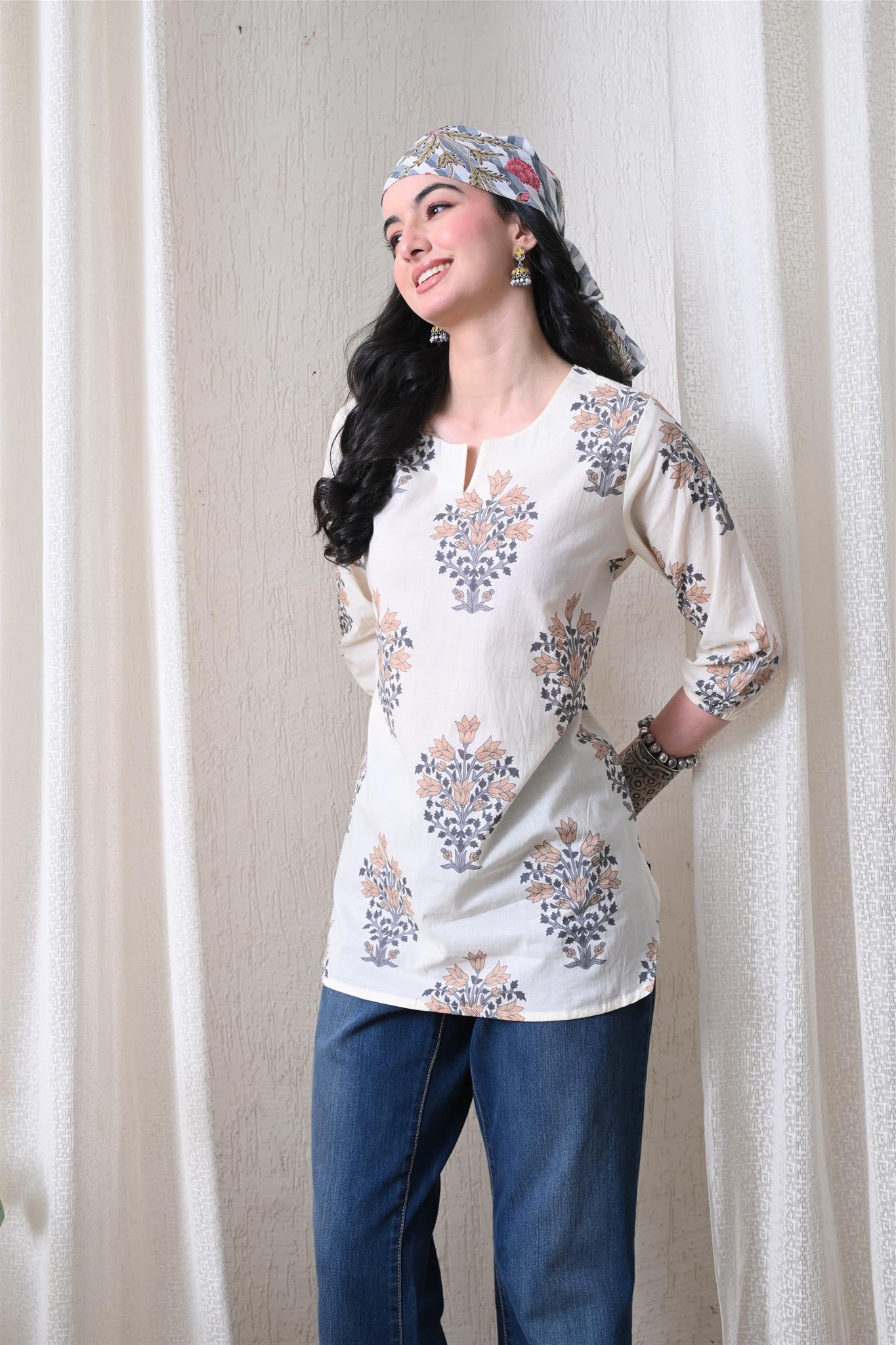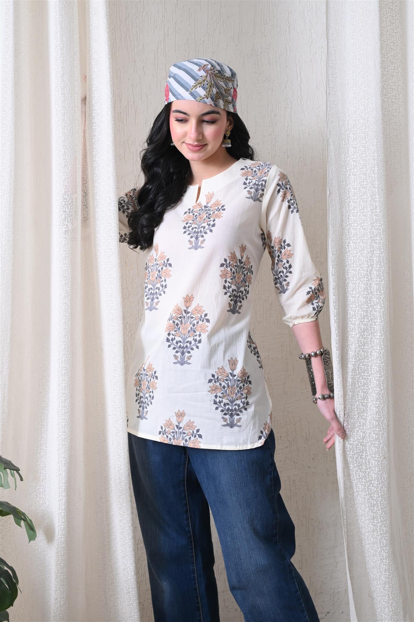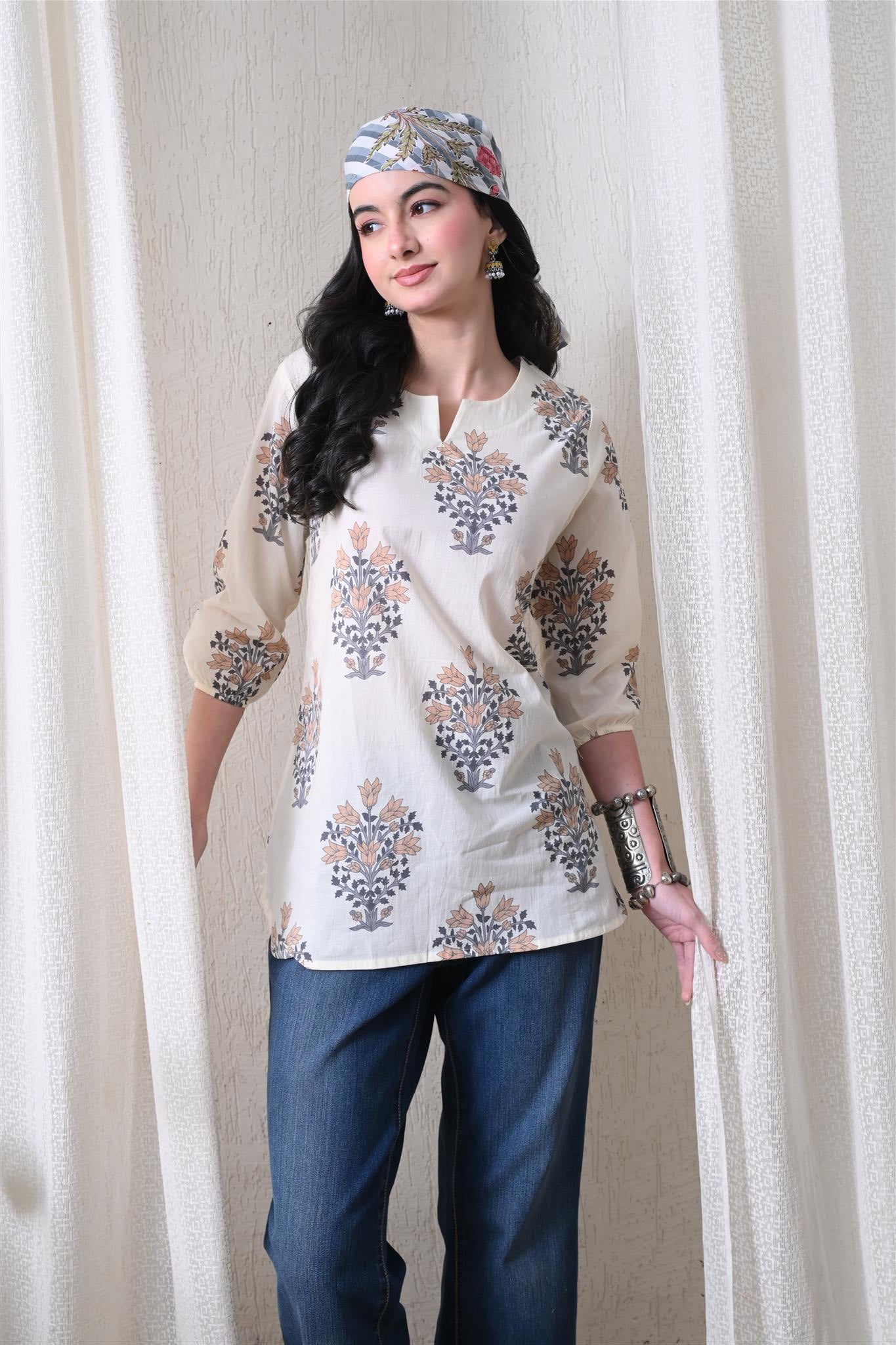 The elegant block print in a cream and brown combination adds a timeless ethnic charm, while the comfortable silhouette makes it easy to style for everyday wear. Designed with 3/4th sleeves, this top provides balanced coverage and versatile appeal, perfect for casual outings, workdays, or relaxed weekends.