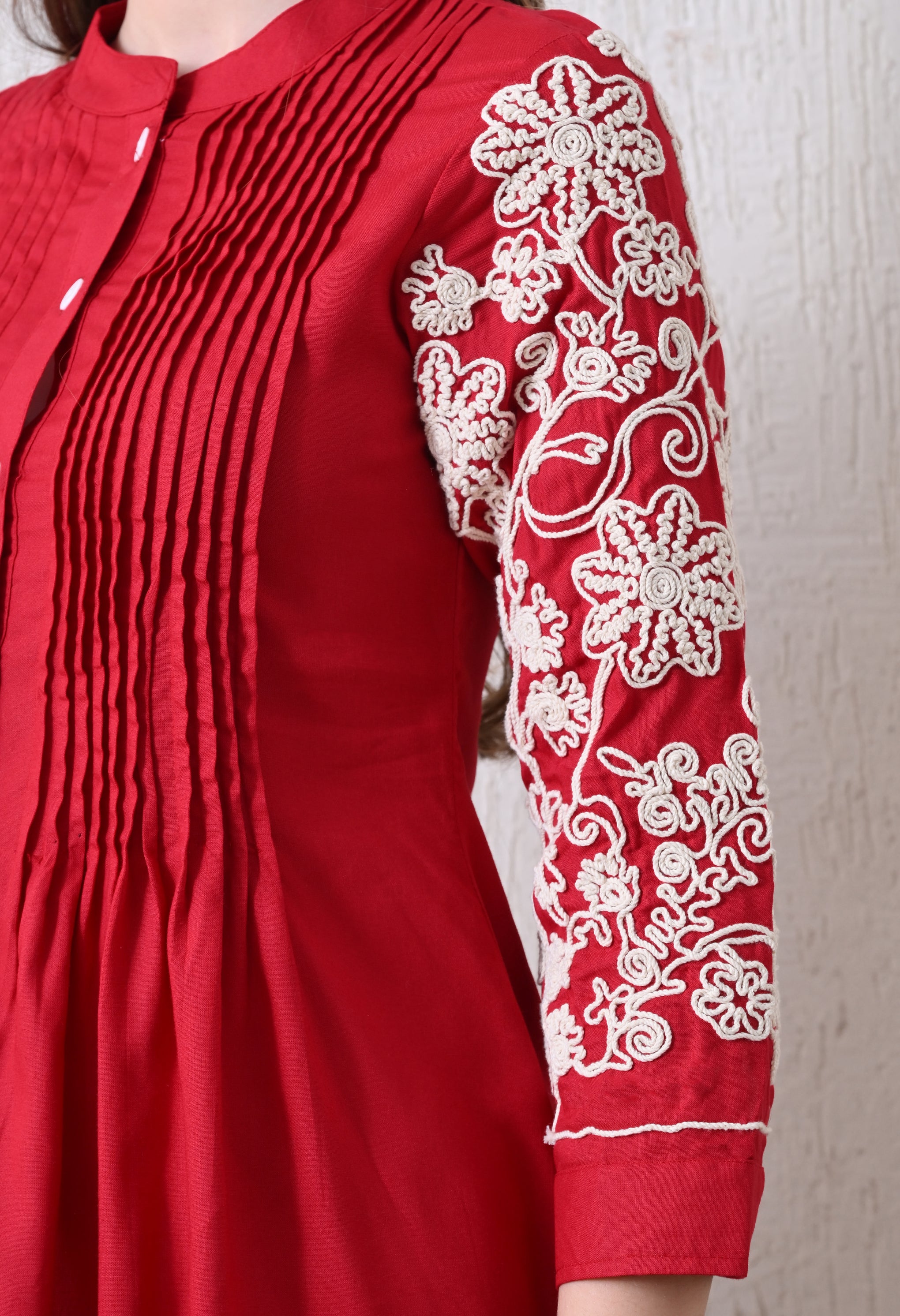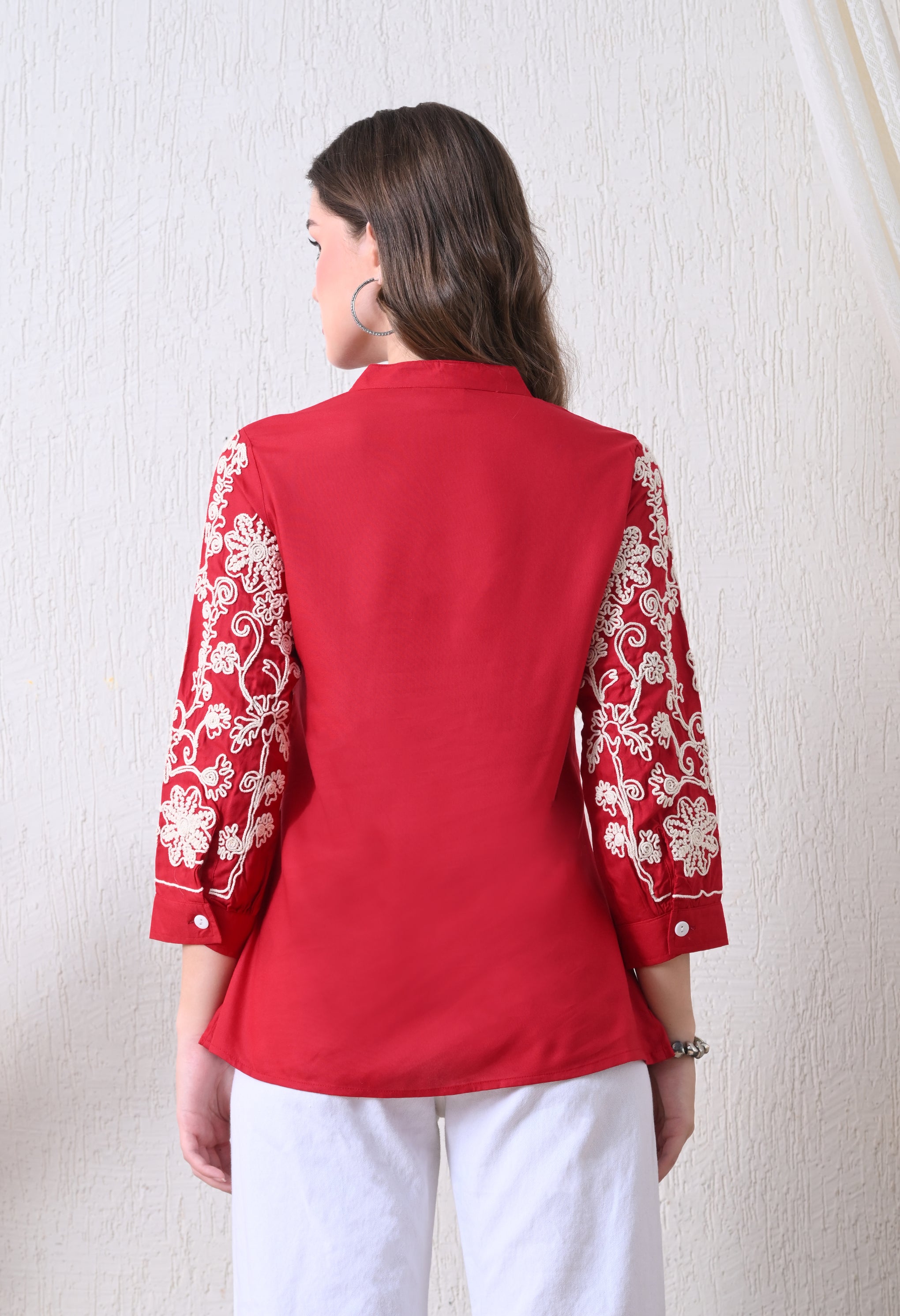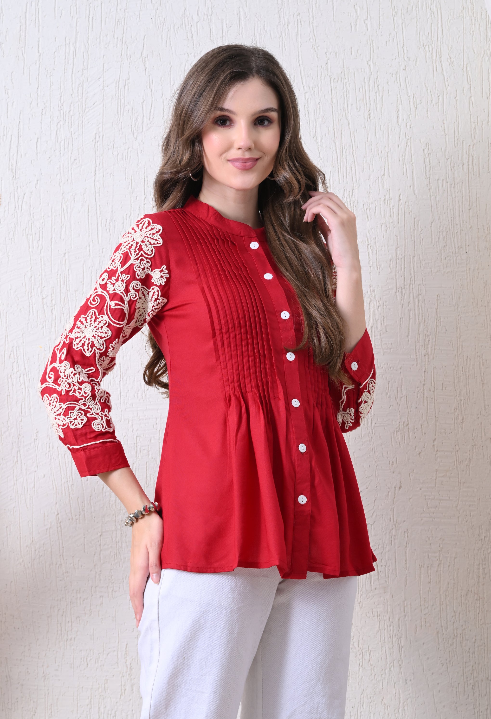 Maroon Premium Rayon Casual A-Line Top With Embroidered 3/4th Sleeves