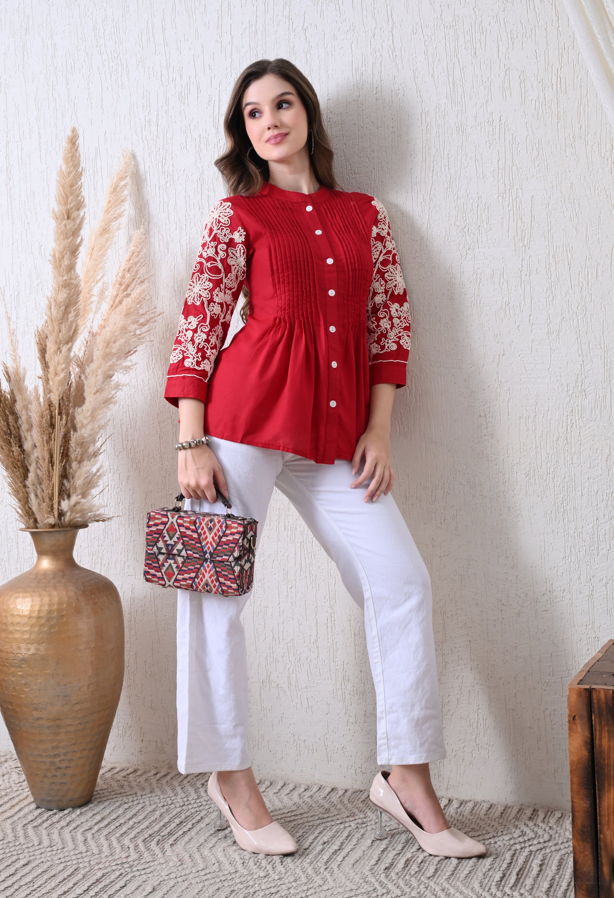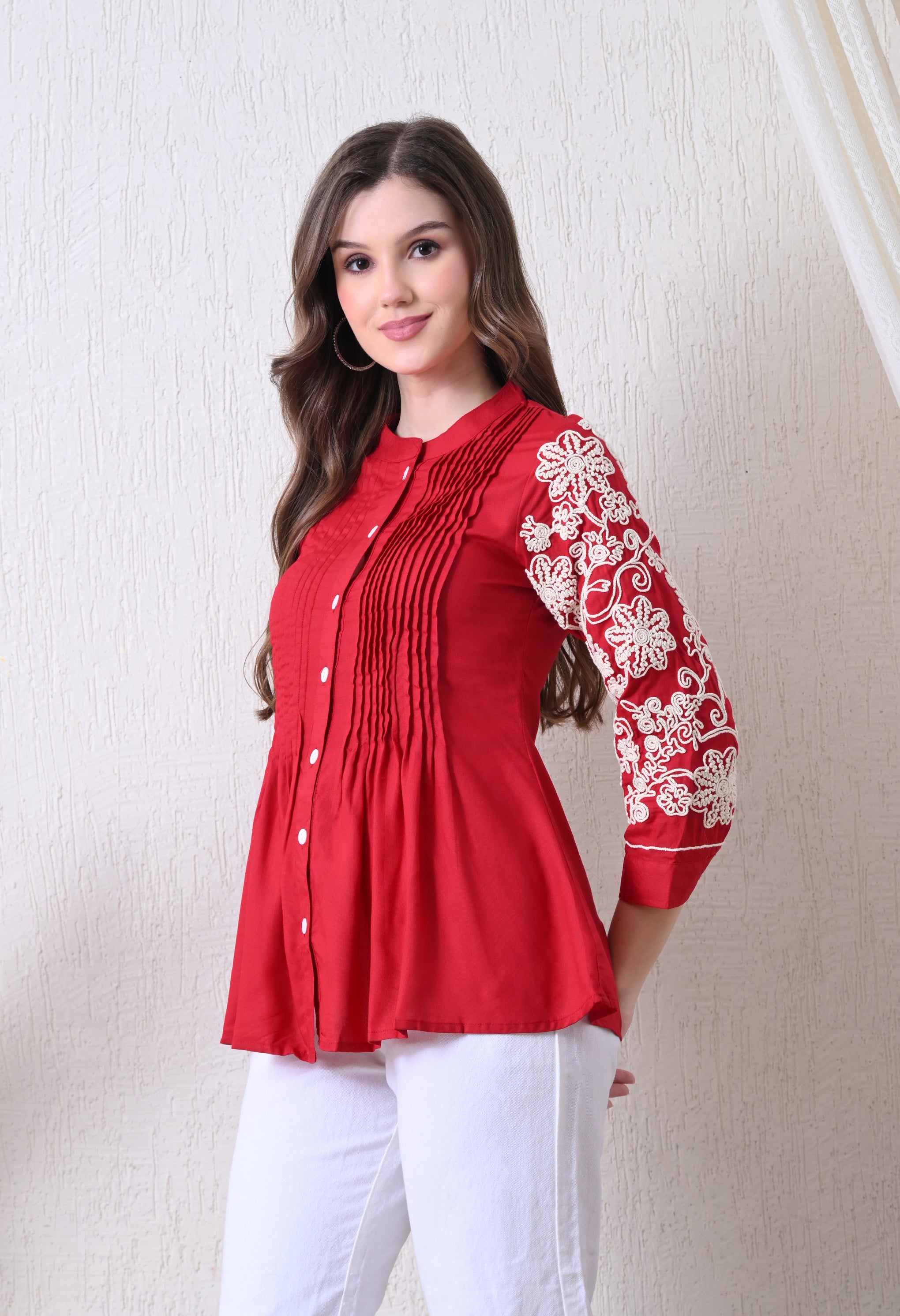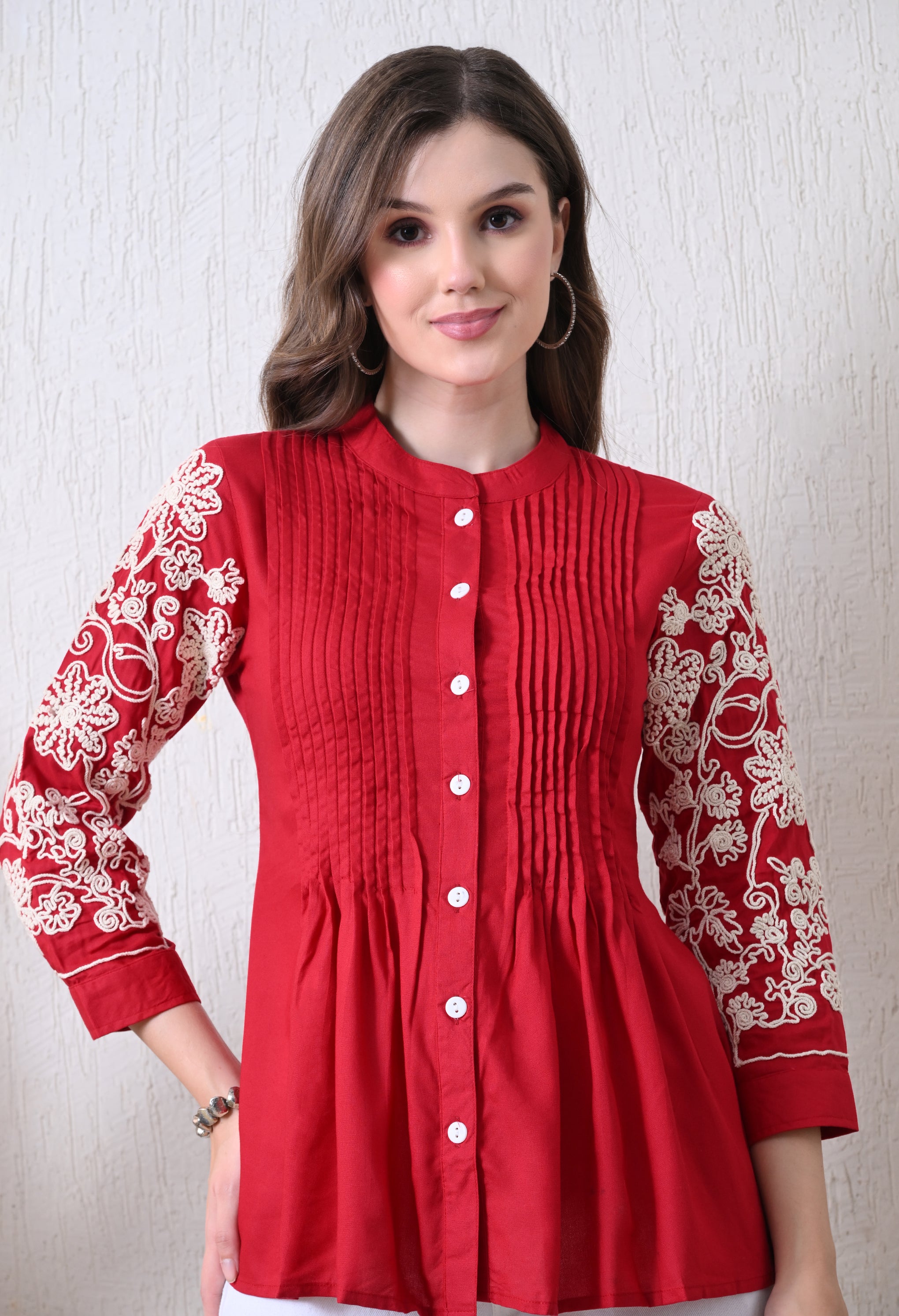 Elevate your style with subtle elegance in this Maroon Premium Rayon Casual A-Line Top. Crafted from high-quality rayon, it offers a smooth, breathable, and lightweight feel that keeps you comfortable all day. The flattering A-line silhouette enhances your look, while the 3/4th sleeves feature intricate embroidery, adding a graceful and feminine touch. Perfect for pairing with jeans, trousers, or skirts for both casual and semi-formal occasions.