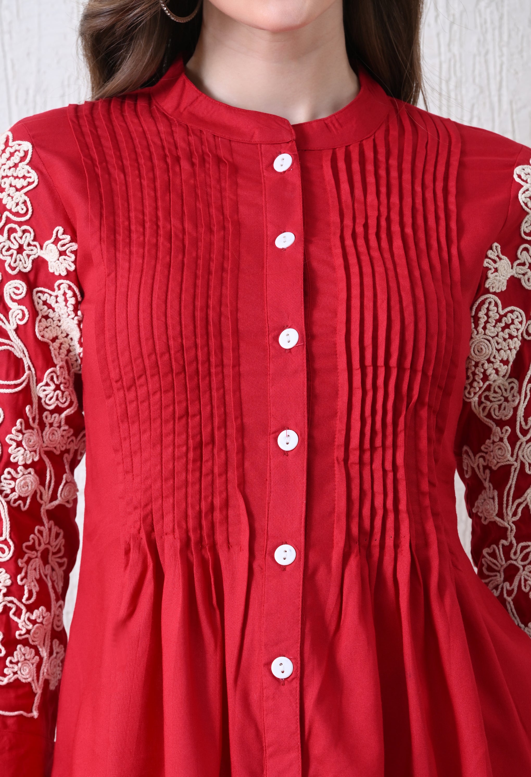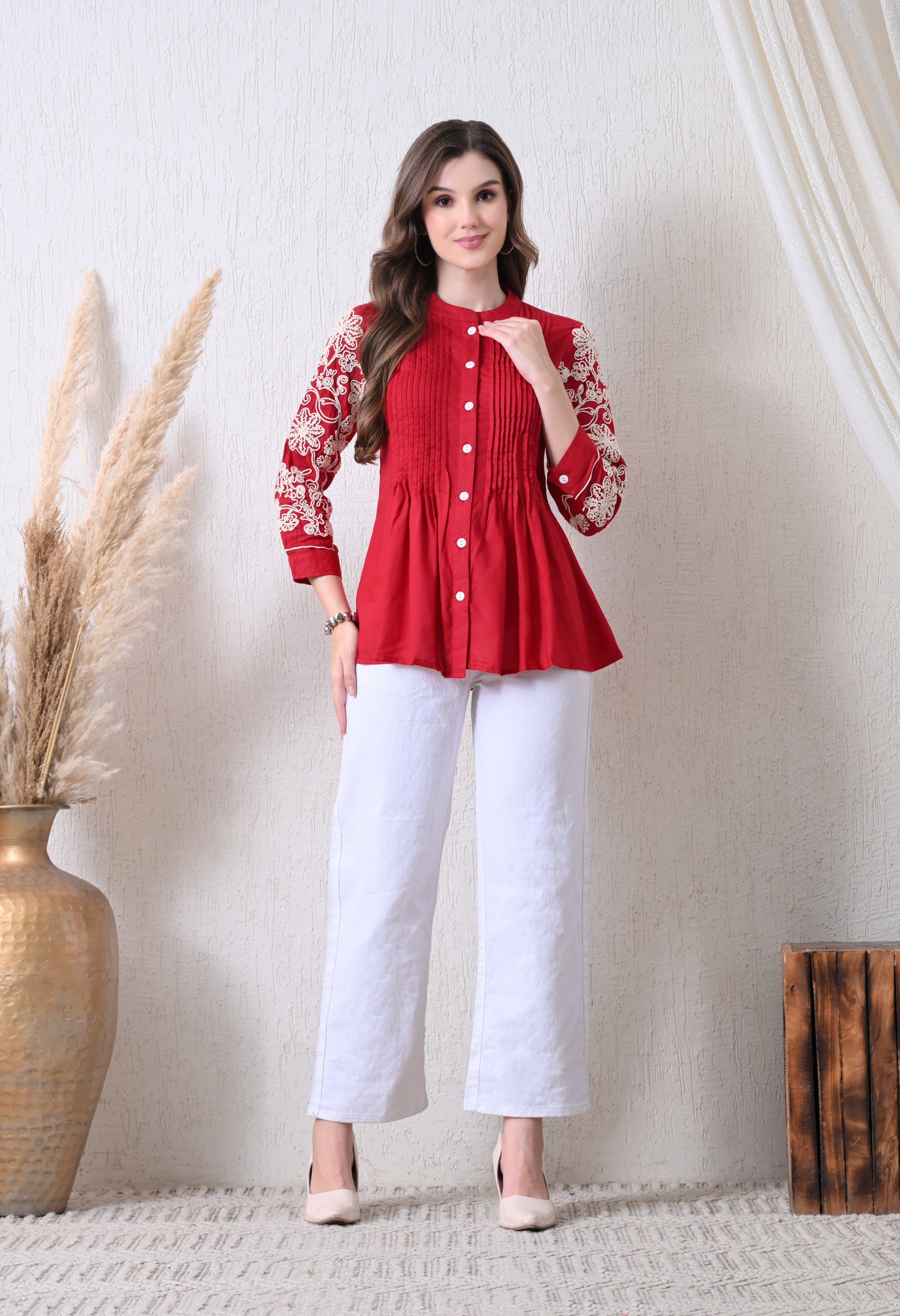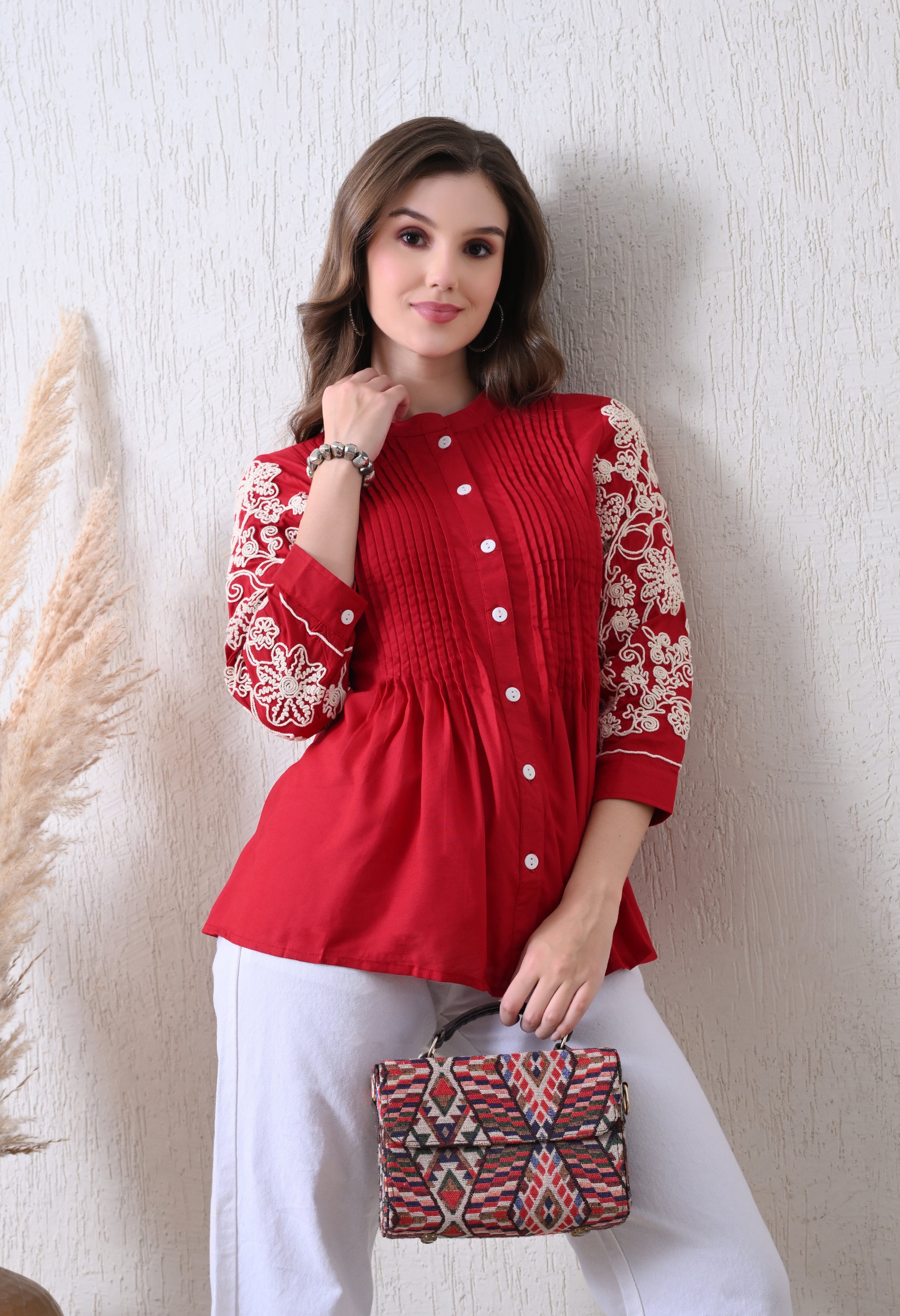 Elevate your style with subtle elegance in this Maroon Premium Rayon Casual A-Line Top. Crafted from high-quality rayon, it offers a smooth, breathable, and lightweight feel that keeps you comfortable all day. The flattering A-line silhouette enhances your look, while the 3/4th sleeves feature intricate embroidery, adding a graceful and feminine touch. Perfect for pairing with jeans, trousers, or skirts for both casual and semi-formal occasions.