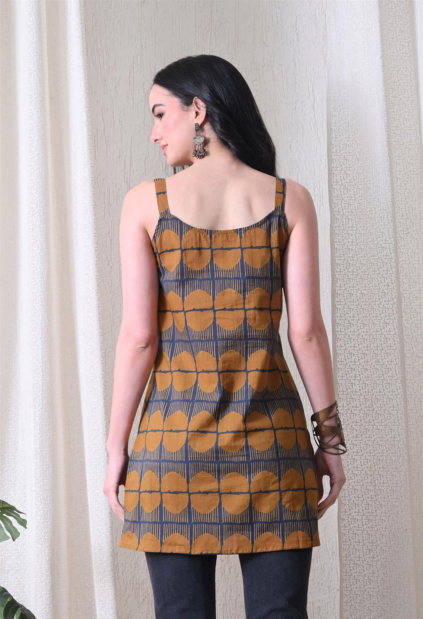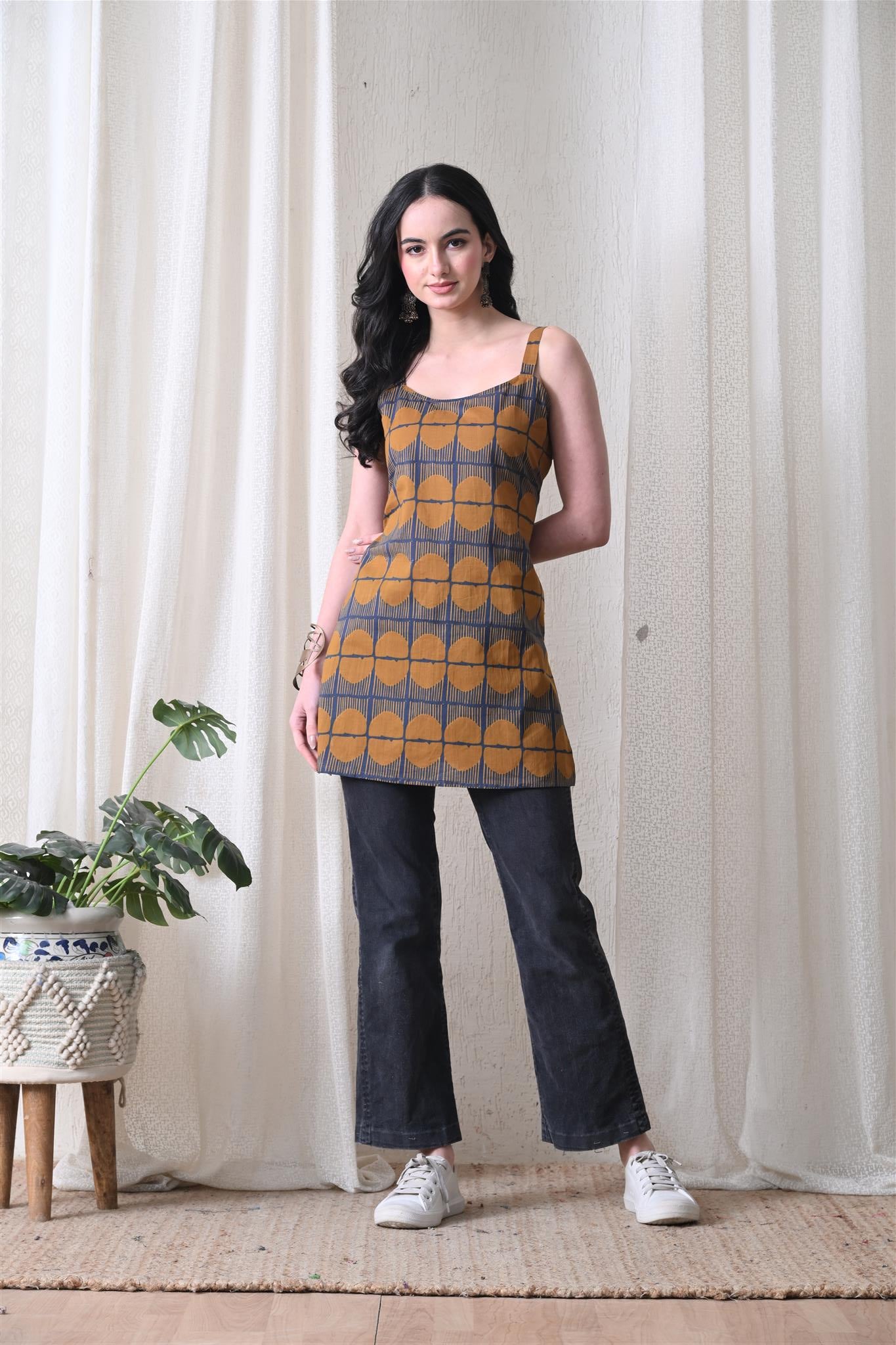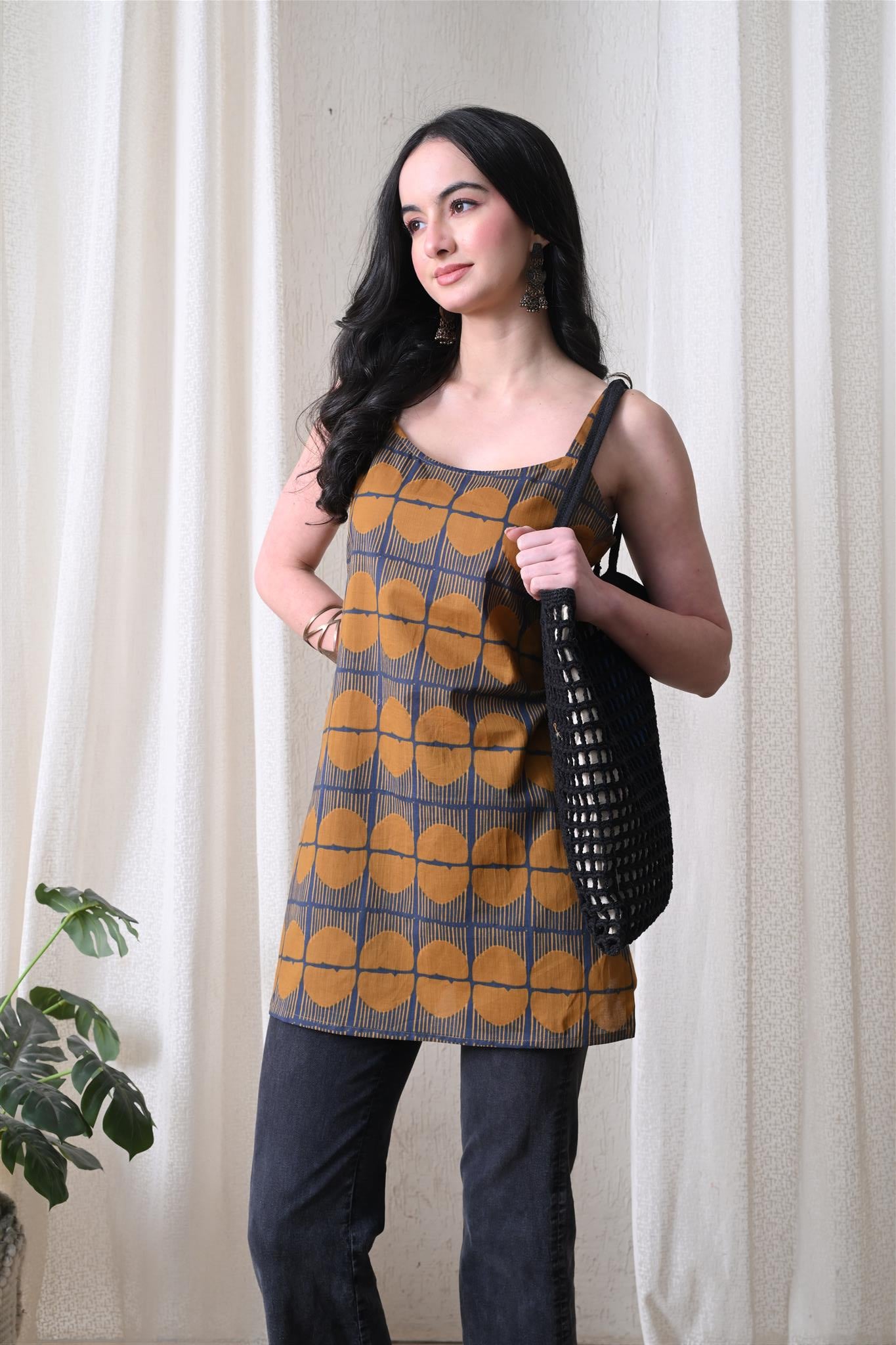 Designed with a stylish grid pattern in a vibrant mustard and blue combination, this top adds a bold yet effortless charm to your everyday look. Crafted from soft, breathable fabric, it offers a lightweight and comfortable feel for all-day wear. The flattering A-line silhouette ensures graceful movement, while the strappy design enhances its modern, summer-ready appeal.