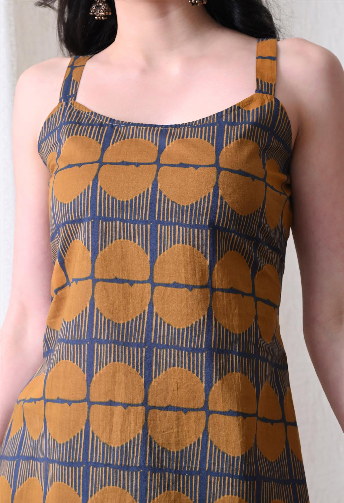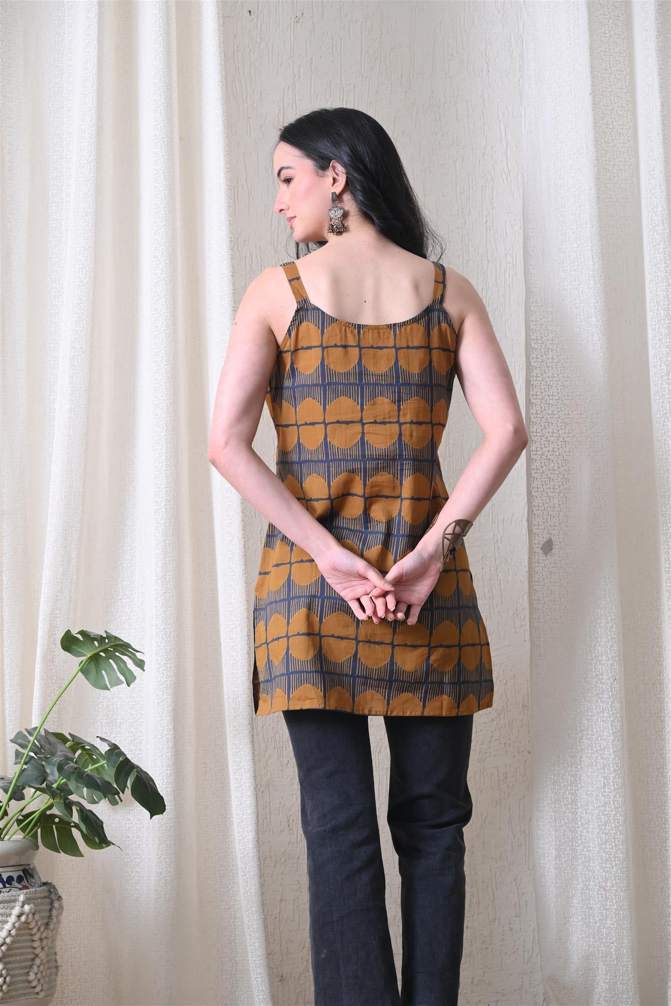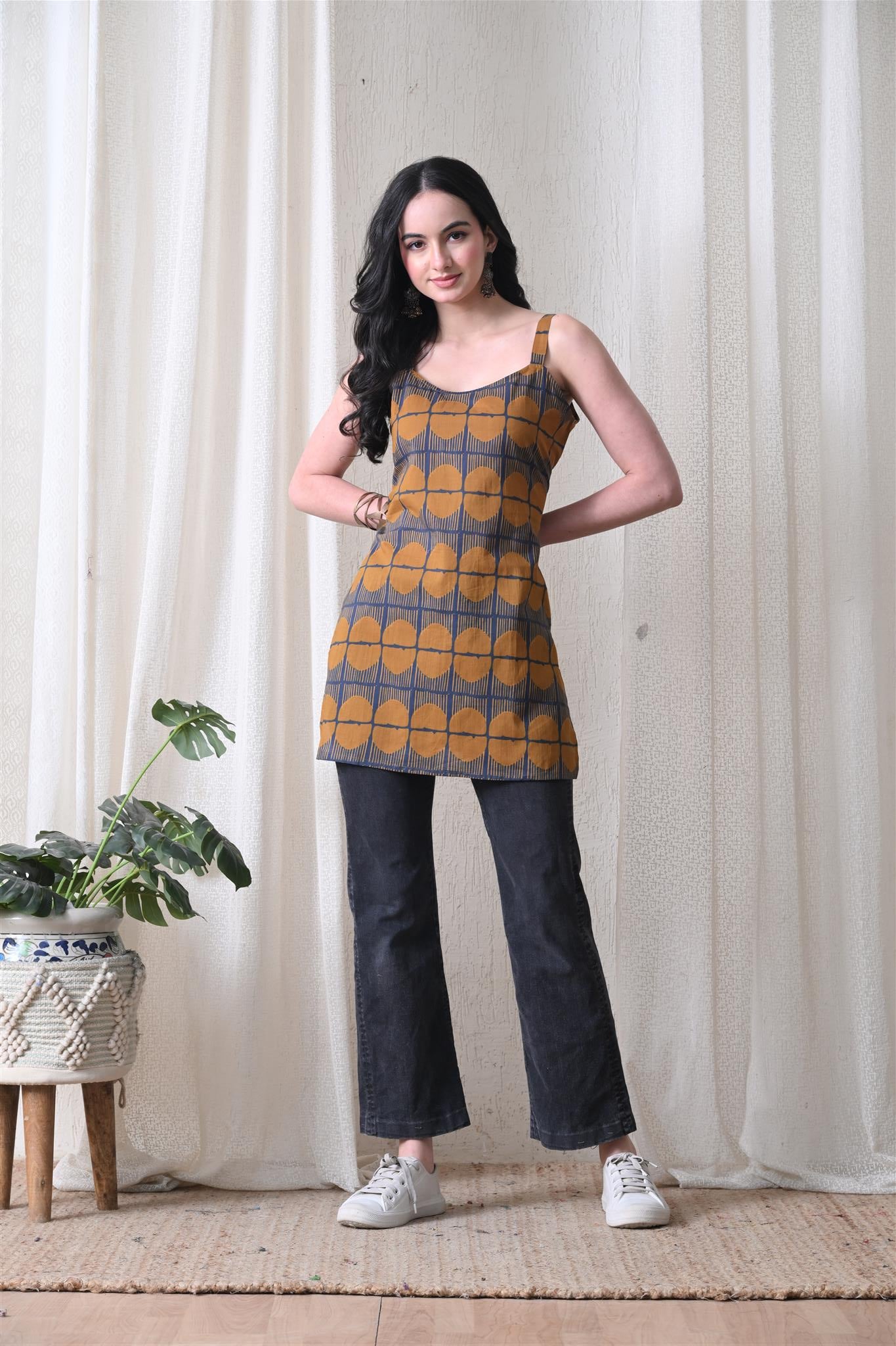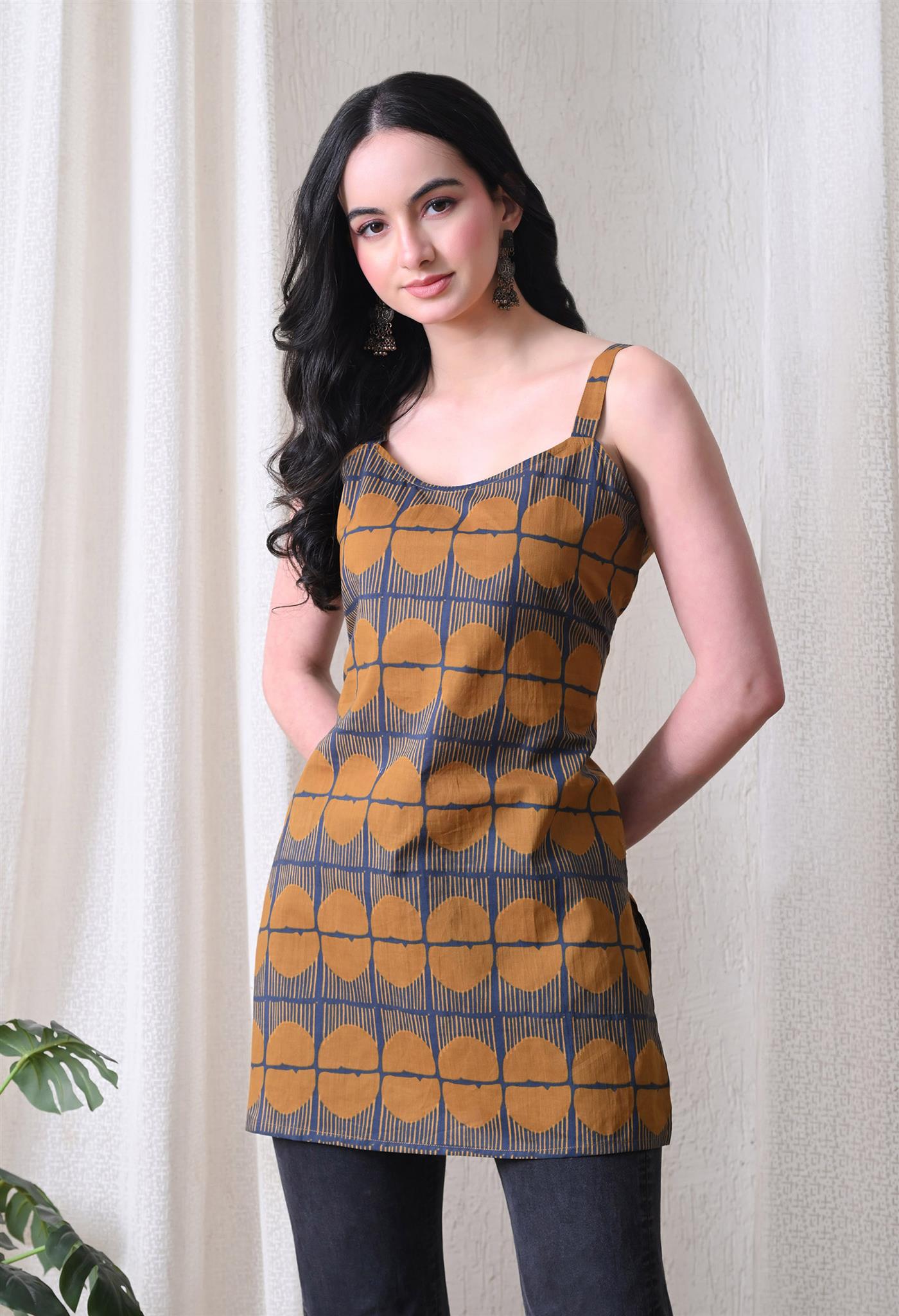 Designed with a stylish grid pattern in a vibrant mustard and blue combination, this top adds a bold yet effortless charm to your everyday look. Crafted from soft, breathable fabric, it offers a lightweight and comfortable feel for all-day wear. The flattering A-line silhouette ensures graceful movement, while the strappy design enhances its modern, summer-ready appeal.