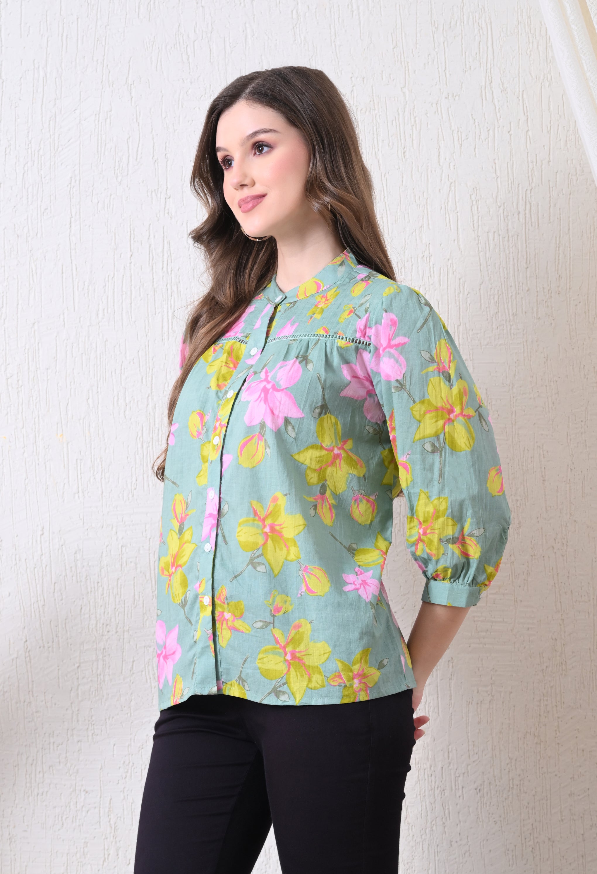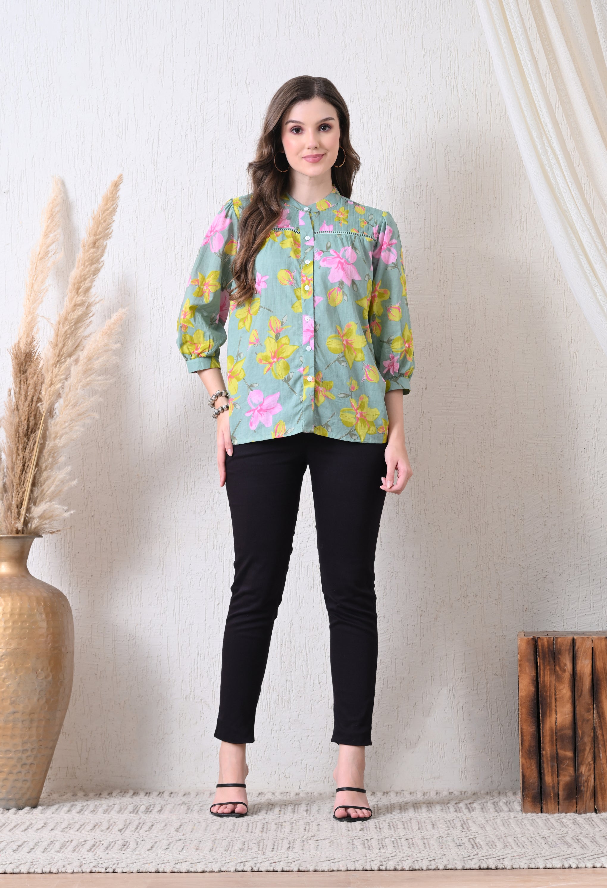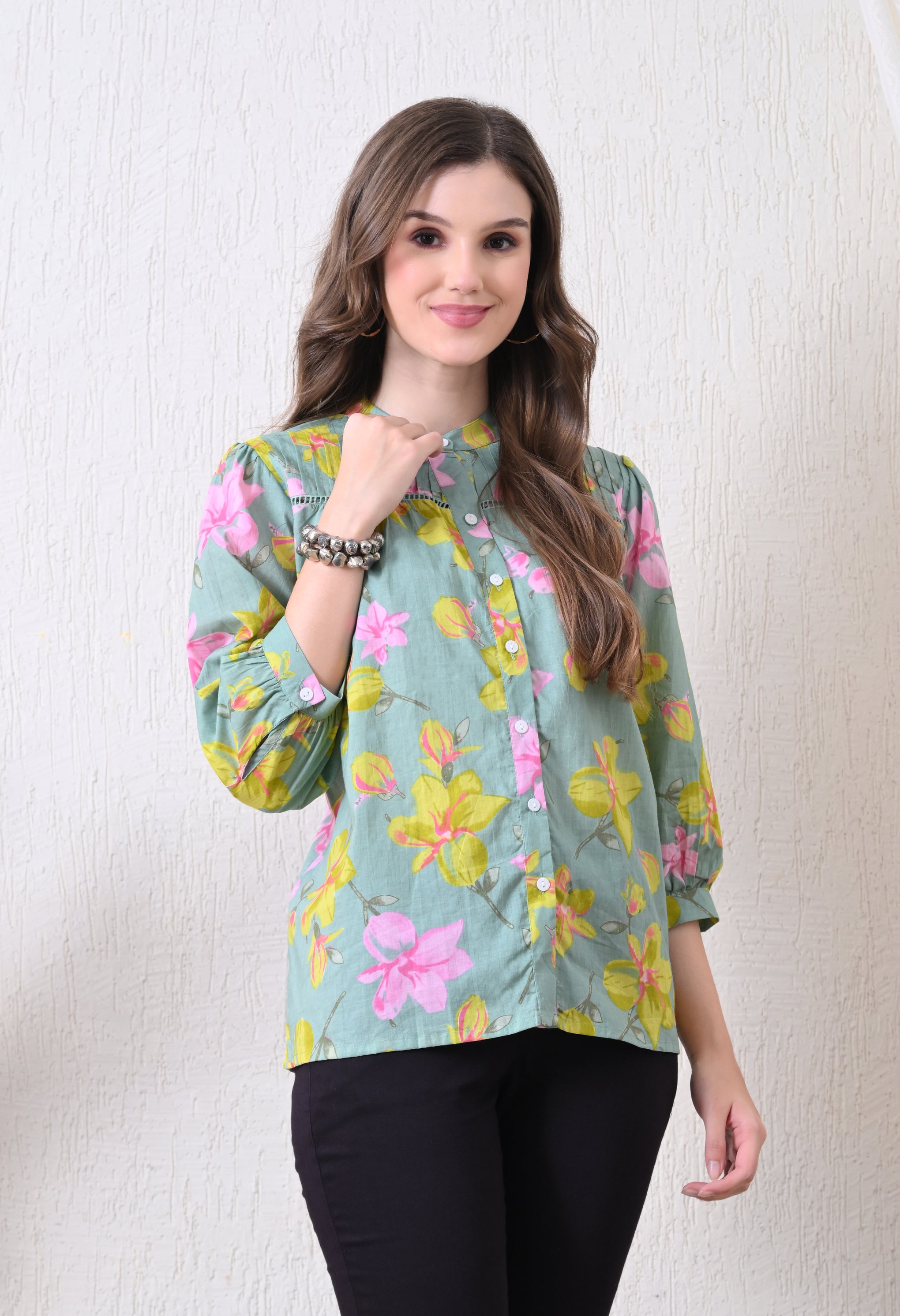 Refresh your wardrobe with this Sage Green Pure Cotton Casual Relaxed Fit Top. Made from 100% breathable cotton, it offers a soft, lightweight feel for all-day comfort. The relaxed fit ensures easy movement, while the 3/4th sleeves add a touch of elegance and versatility. The calming sage green shade brings a subtle, sophisticated charm, making it perfect for casual outings, workdays, or weekend wear.