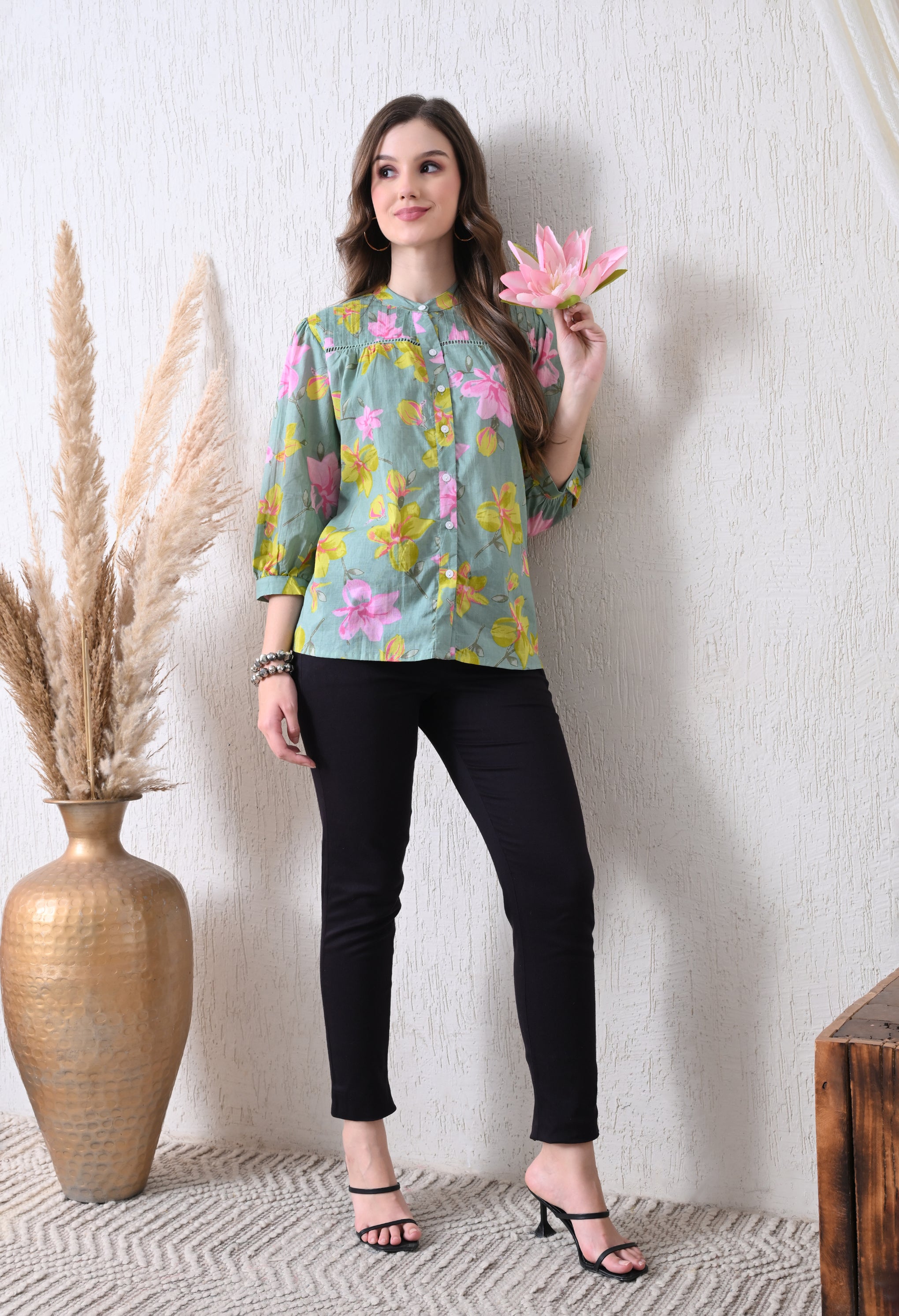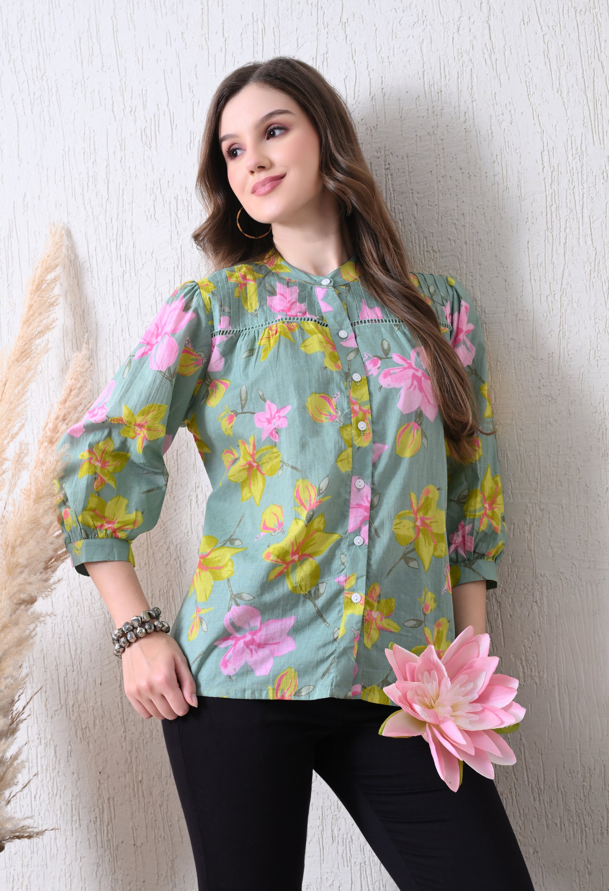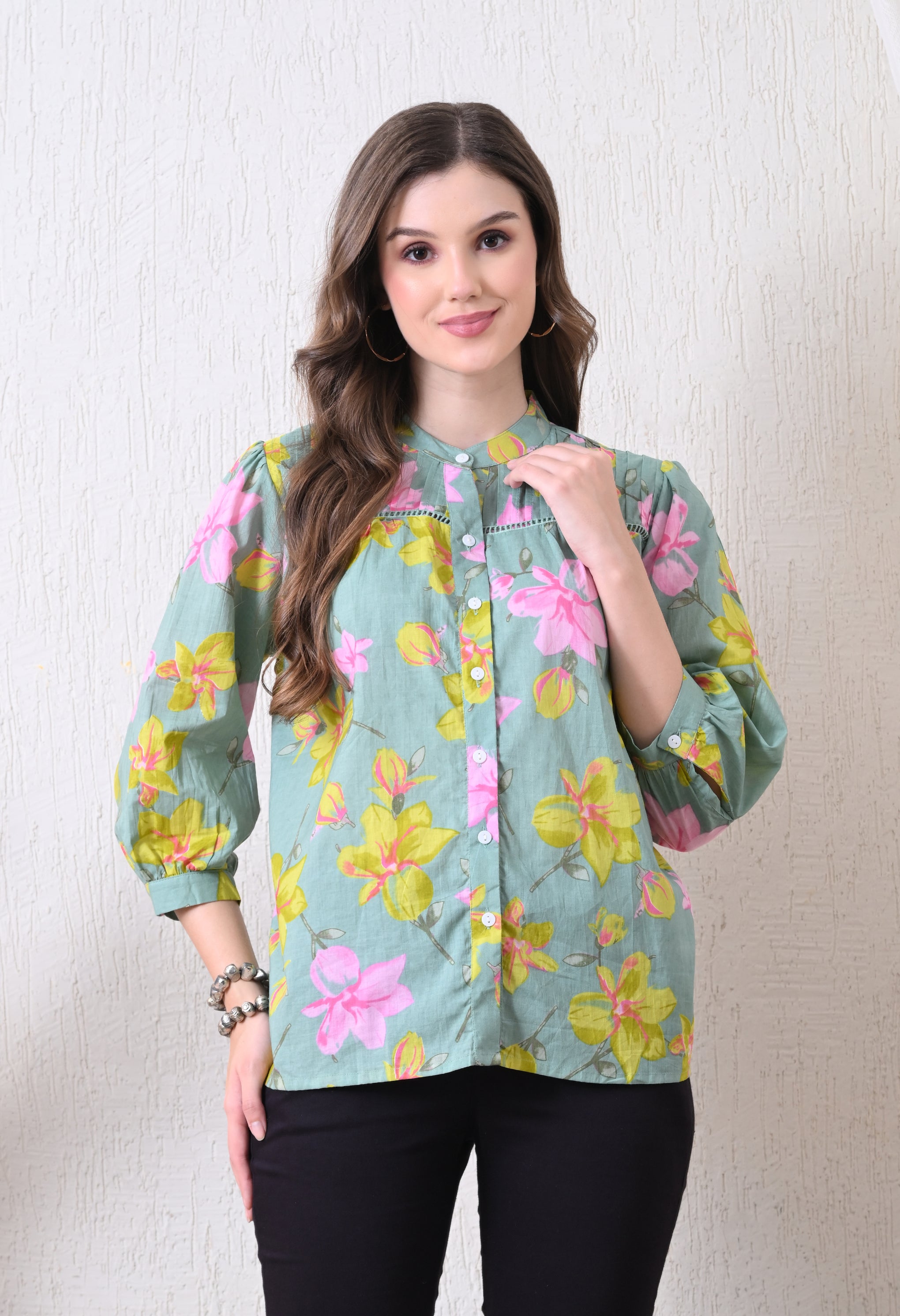 Refresh your wardrobe with this Sage Green Pure Cotton Casual Relaxed Fit Top. Made from 100% breathable cotton, it offers a soft, lightweight feel for all-day comfort. The relaxed fit ensures easy movement, while the 3/4th sleeves add a touch of elegance and versatility. The calming sage green shade brings a subtle, sophisticated charm, making it perfect for casual outings, workdays, or weekend wear.