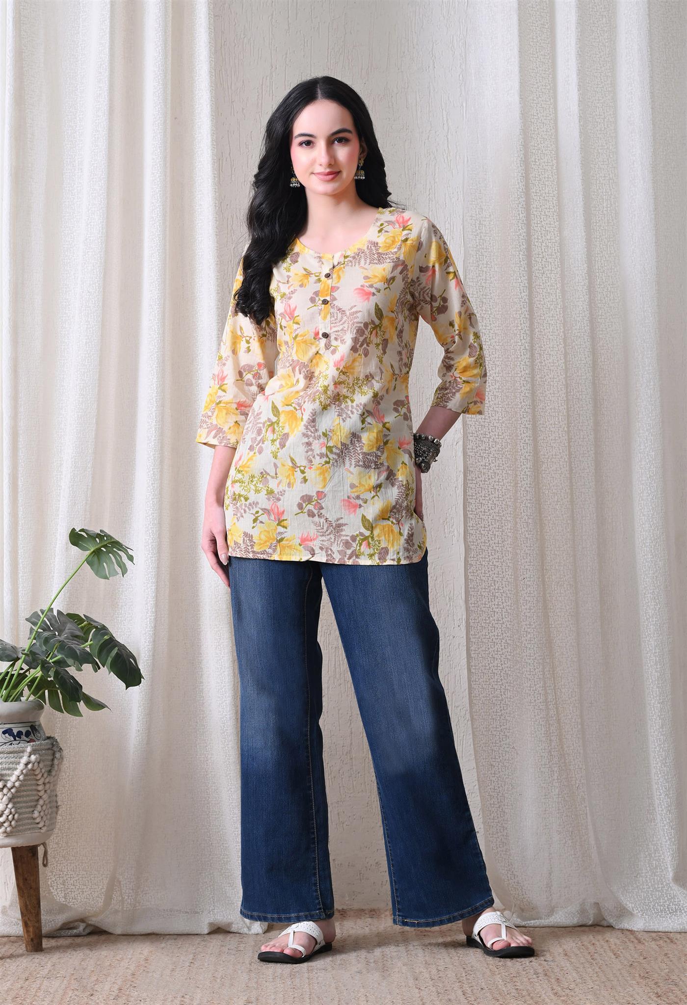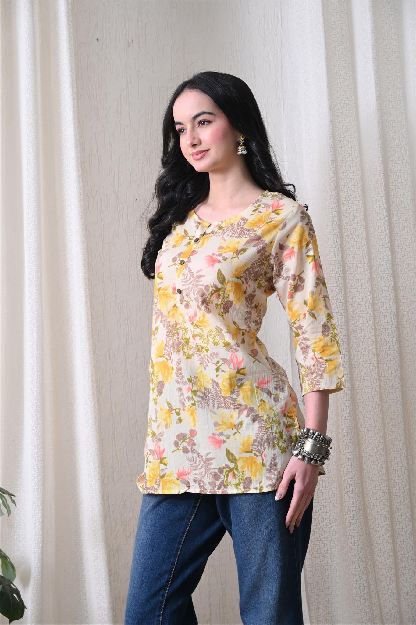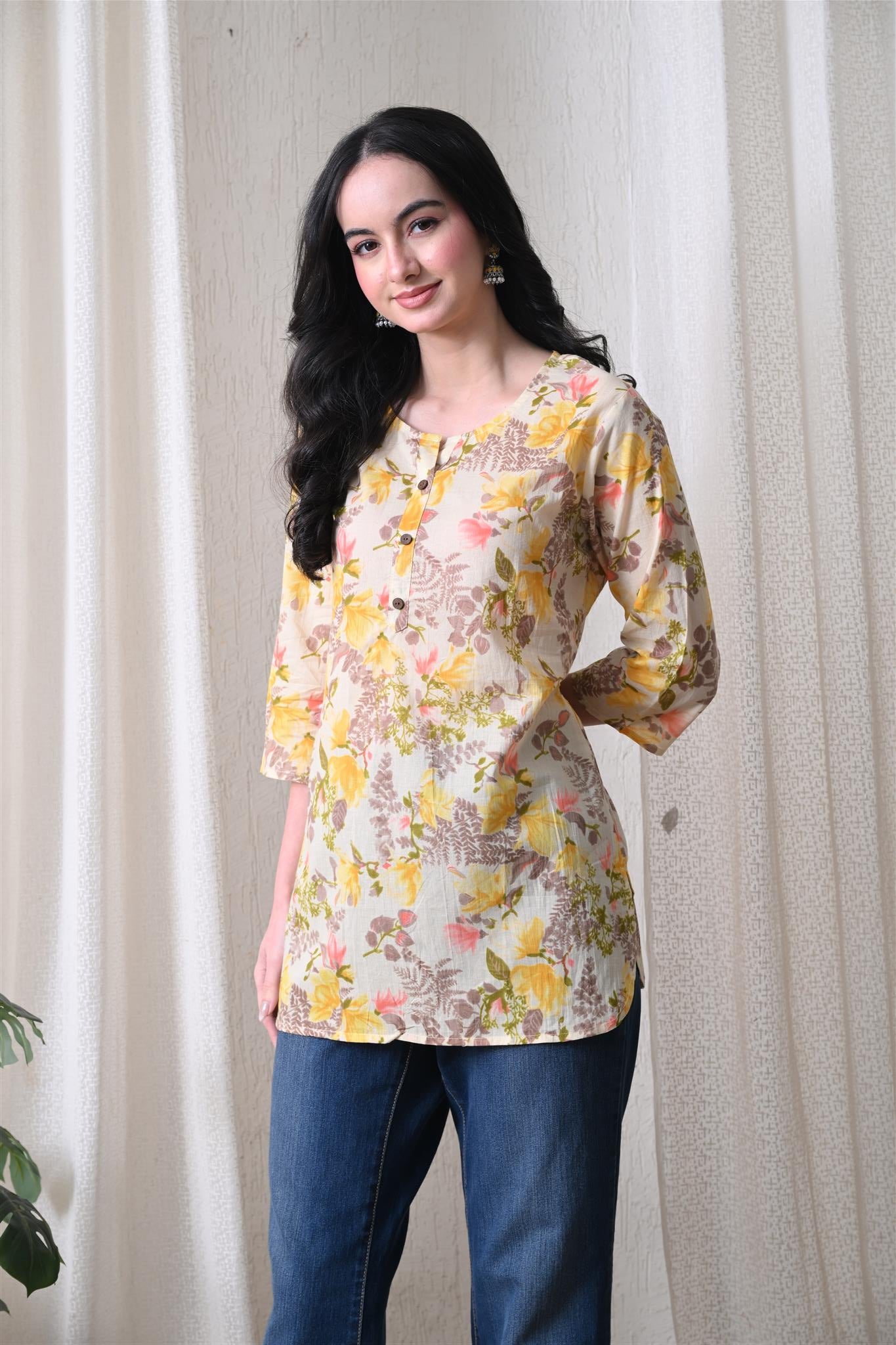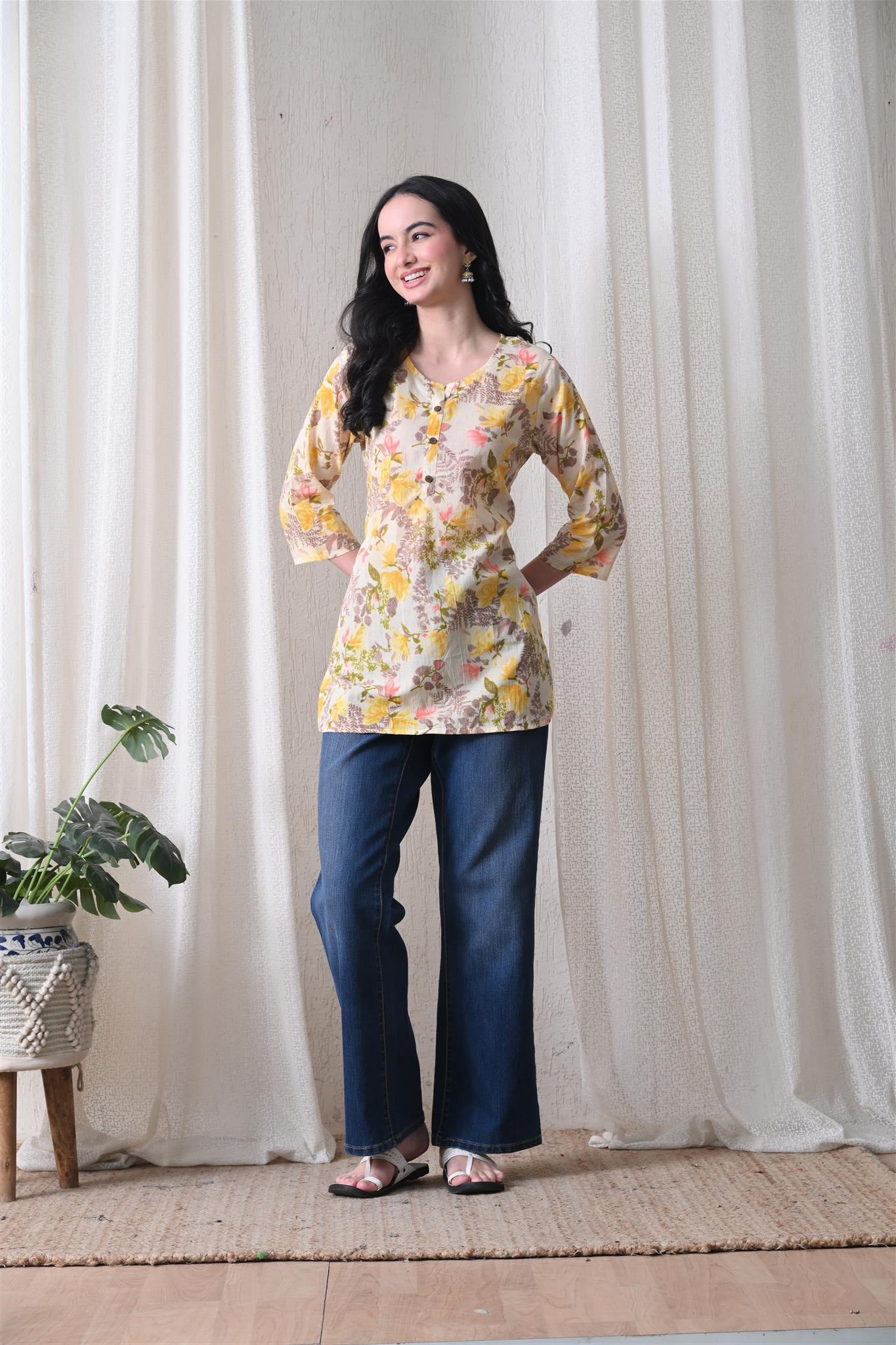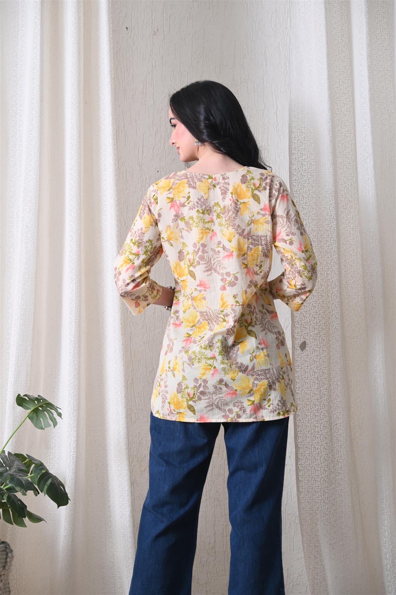 The charming garden-inspired print adds a fresh and lively touch, while the bright yellow shade brings warmth and positivity to your look. Designed with 3/4th sleeves, this top provides balanced coverage and versatile styling, making it perfect for casual outings, office wear, or relaxed weekend dressing.