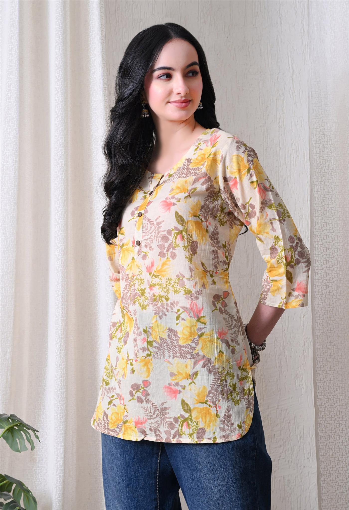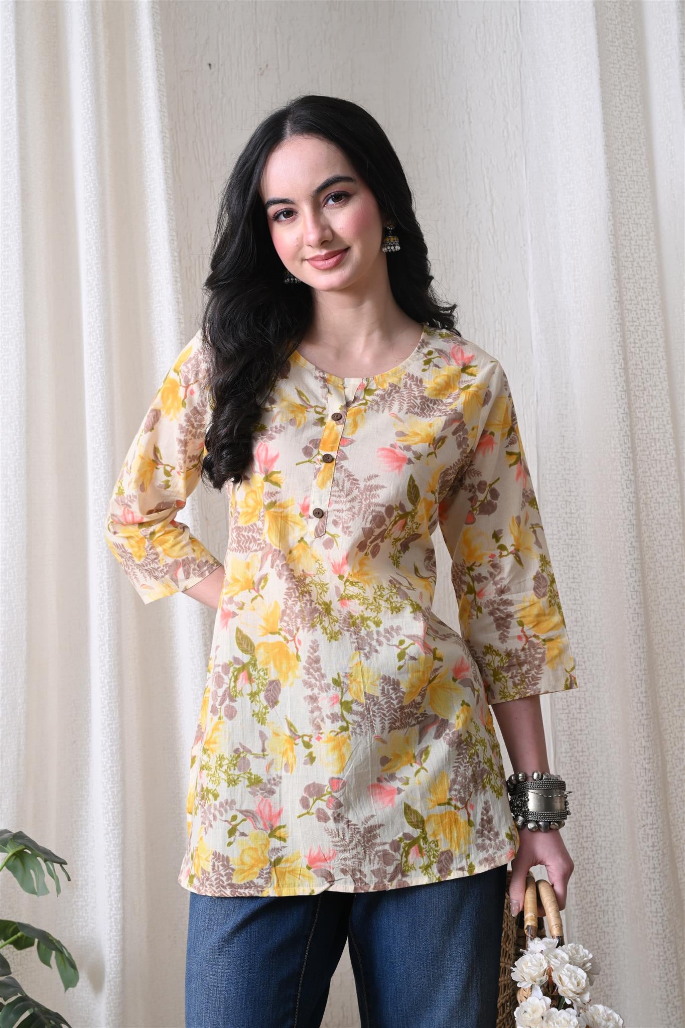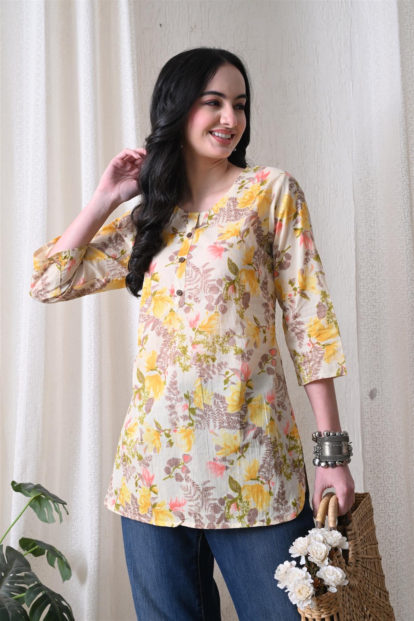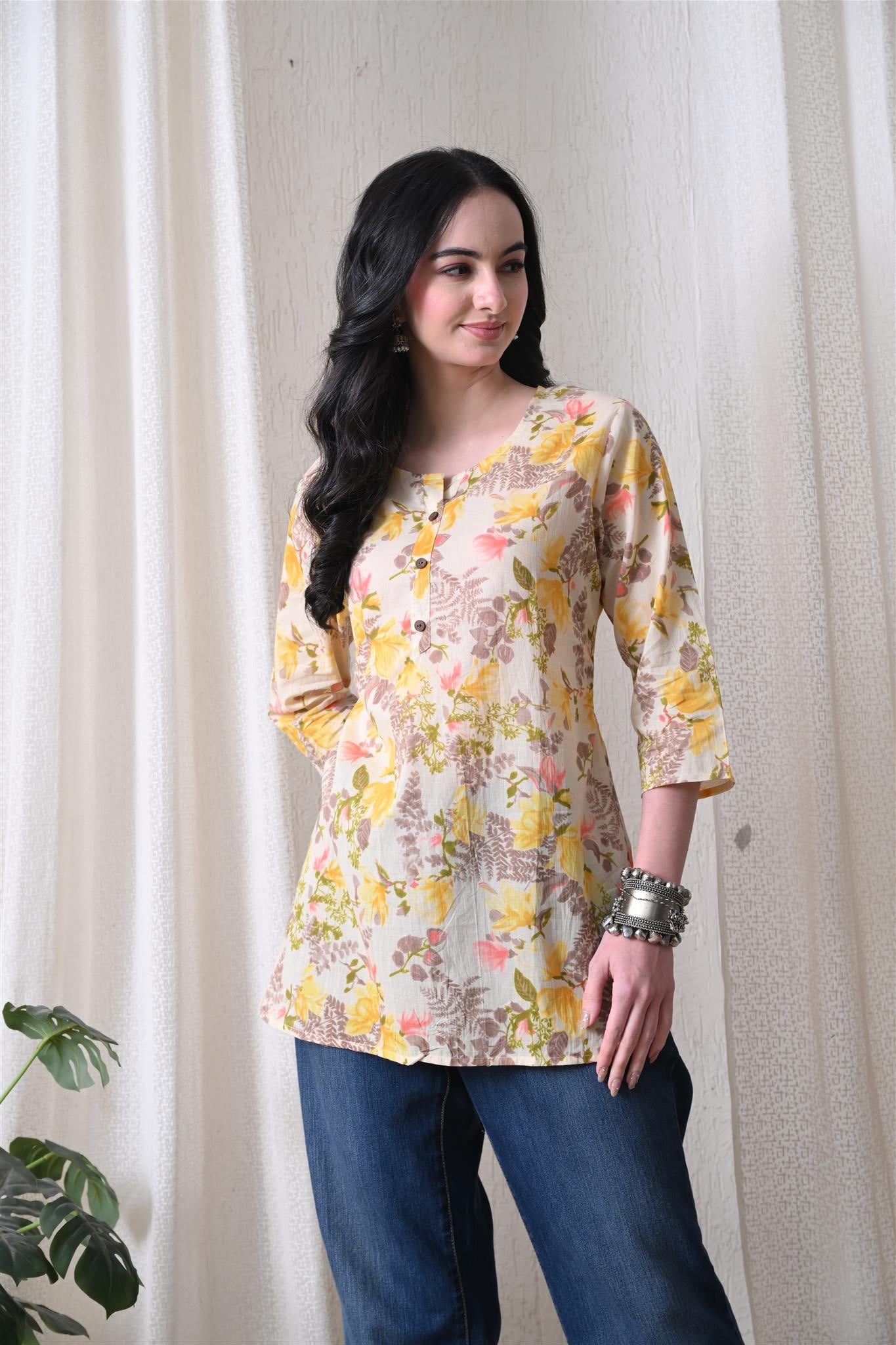 The charming garden-inspired print adds a fresh and lively touch, while the bright yellow shade brings warmth and positivity to your look. Designed with 3/4th sleeves, this top provides balanced coverage and versatile styling, making it perfect for casual outings, office wear, or relaxed weekend dressing.