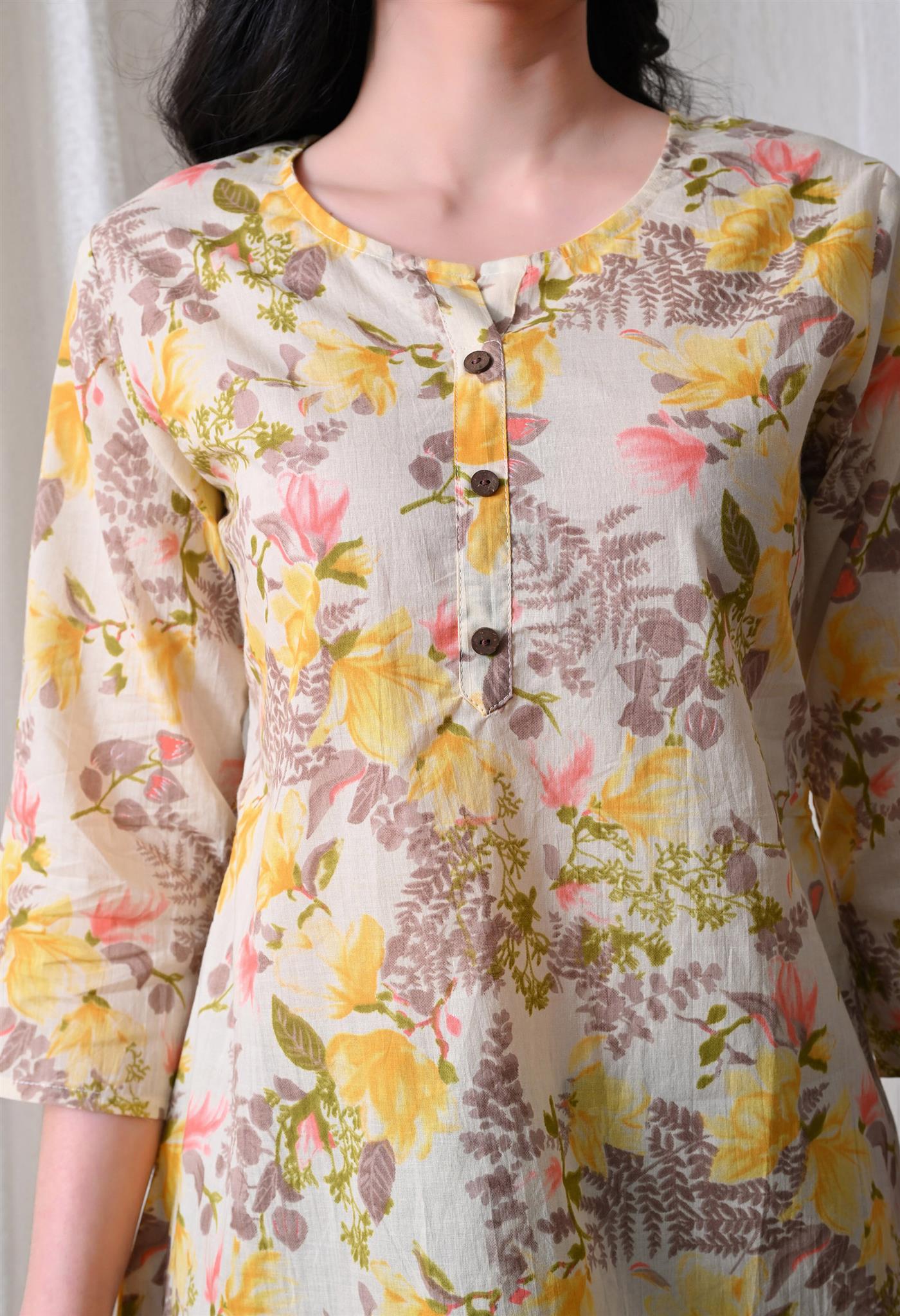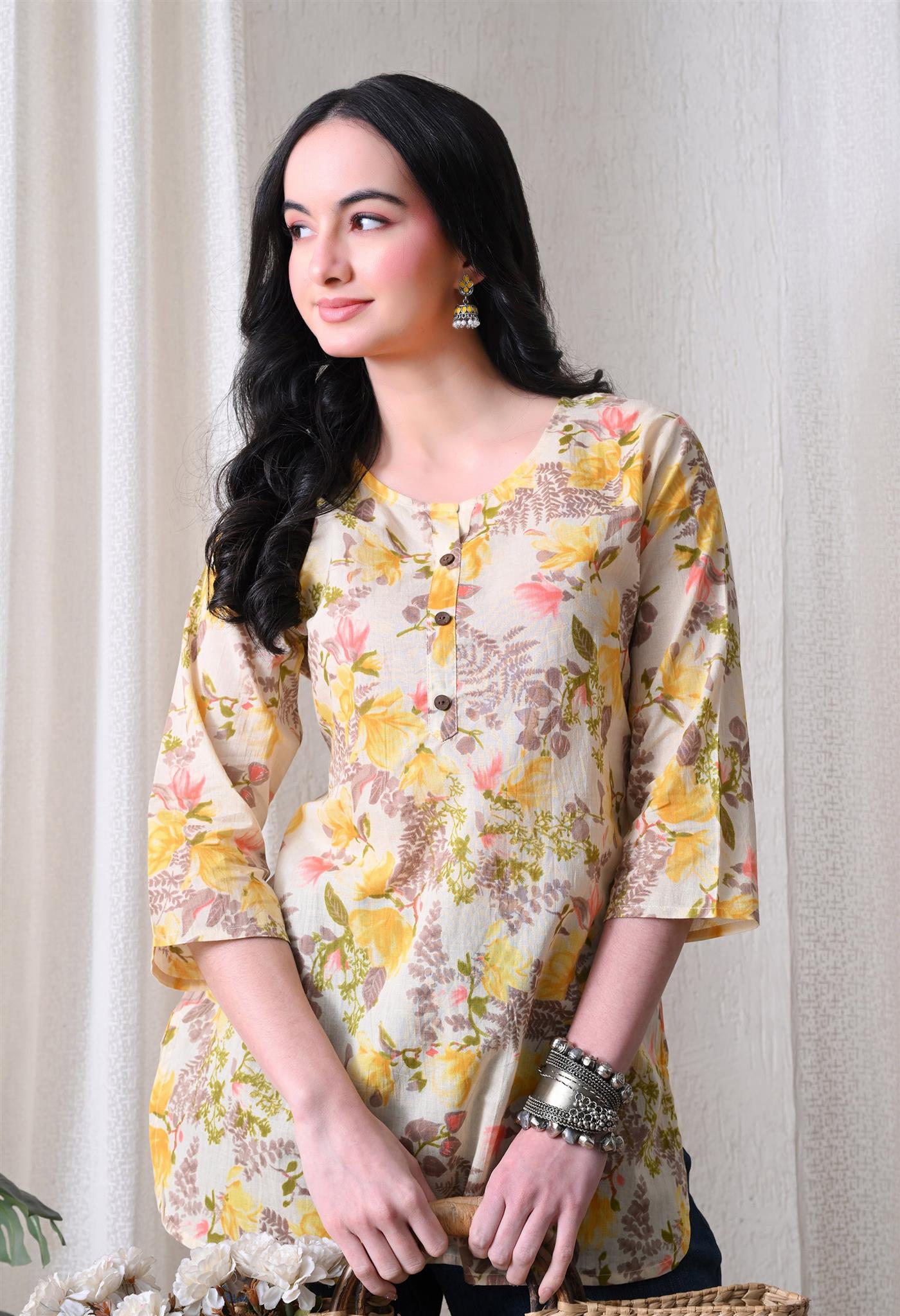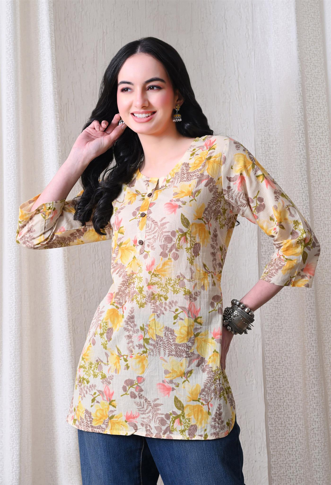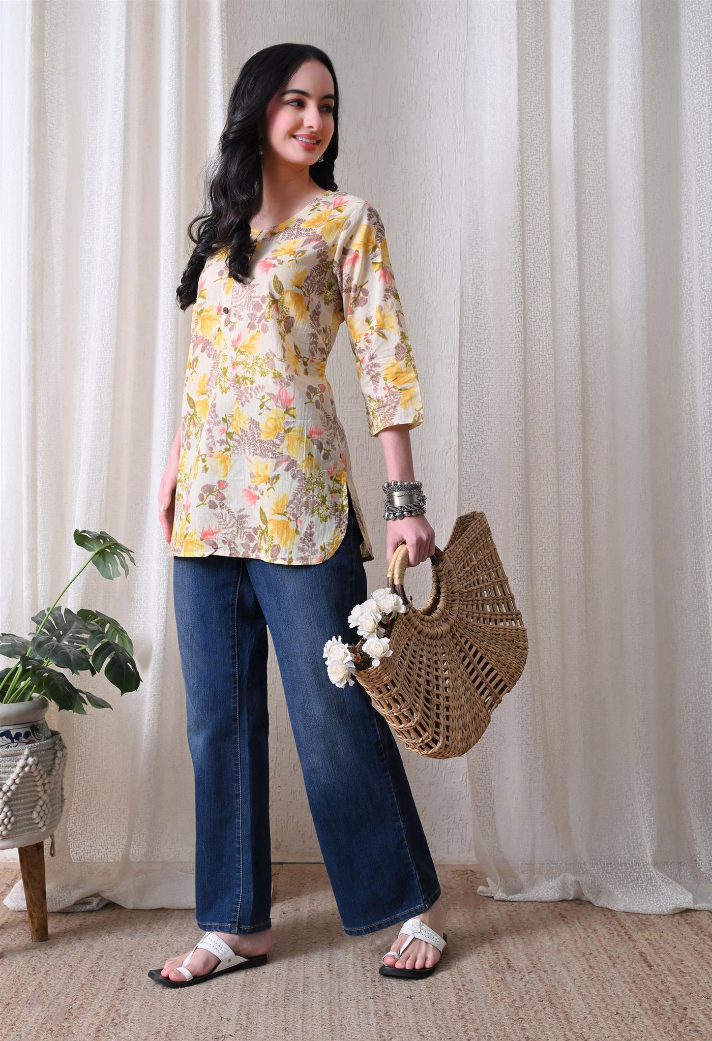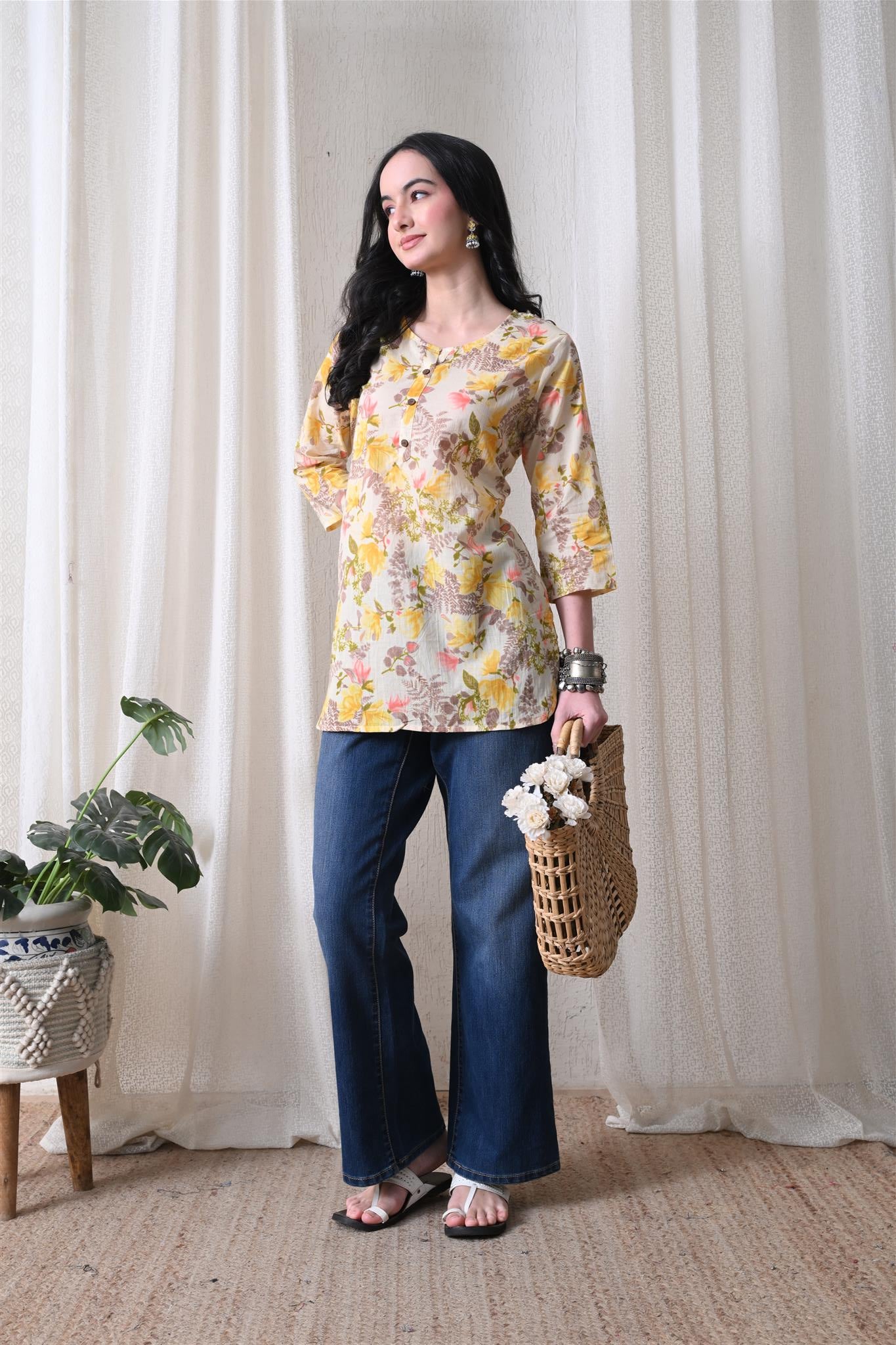 The charming garden-inspired print adds a fresh and lively touch, while the bright yellow shade brings warmth and positivity to your look. Designed with 3/4th sleeves, this top provides balanced coverage and versatile styling, making it perfect for casual outings, office wear, or relaxed weekend dressing.