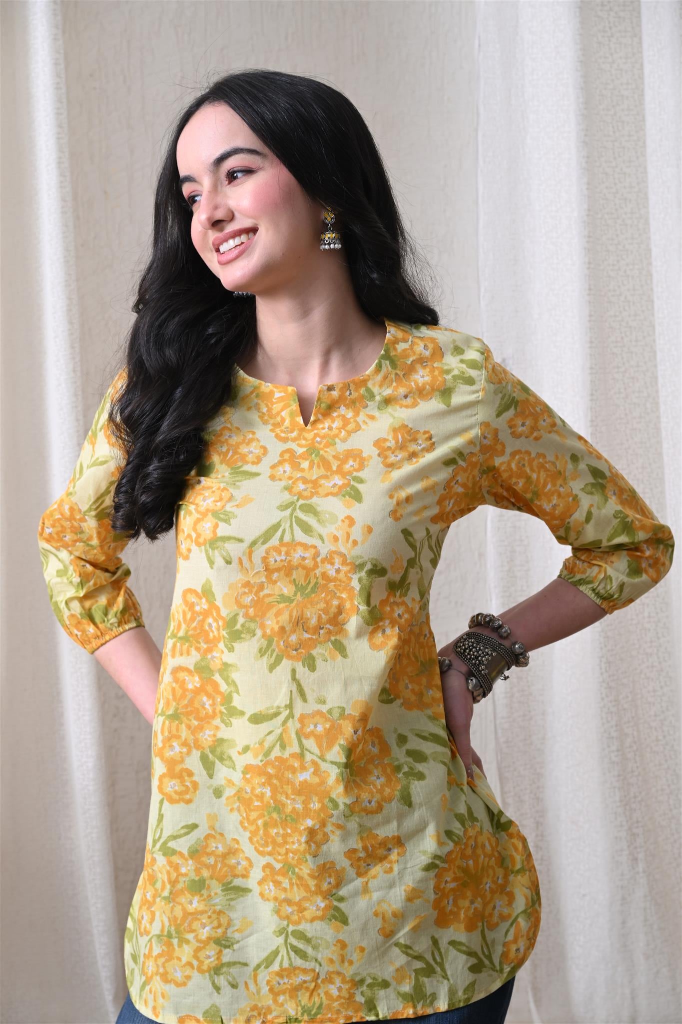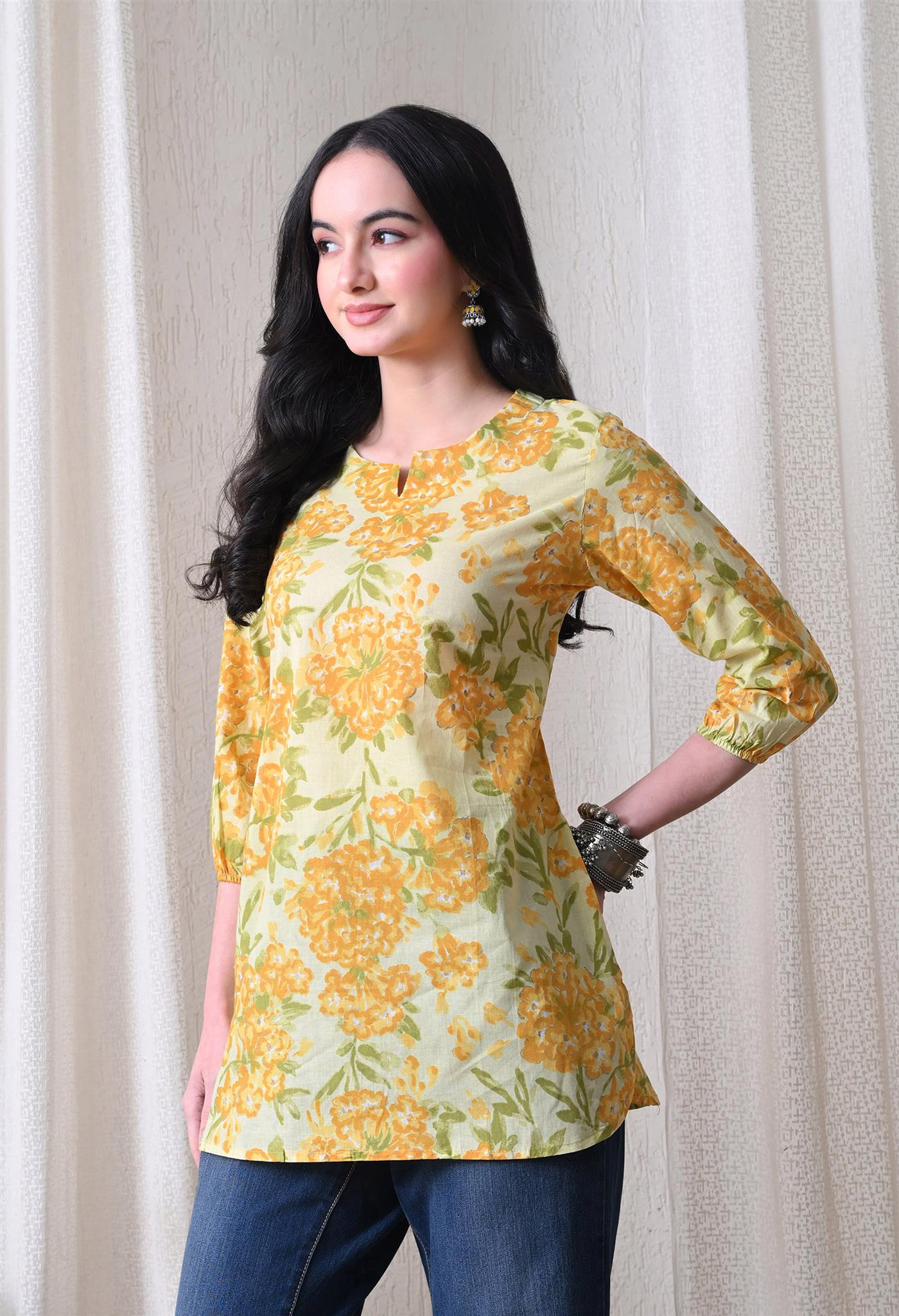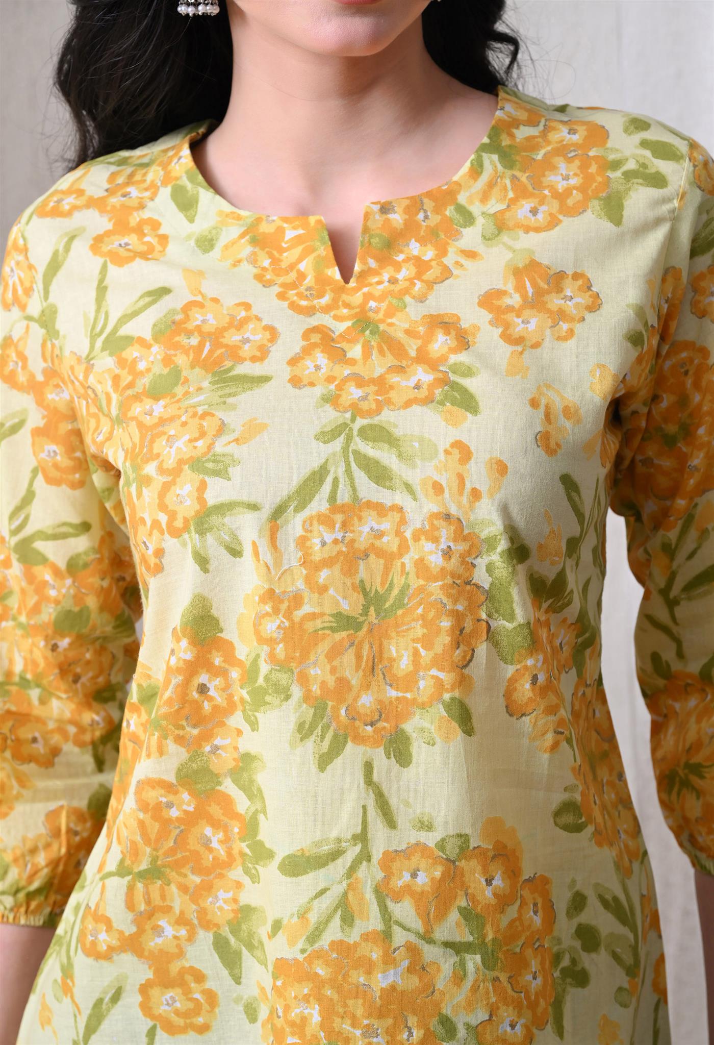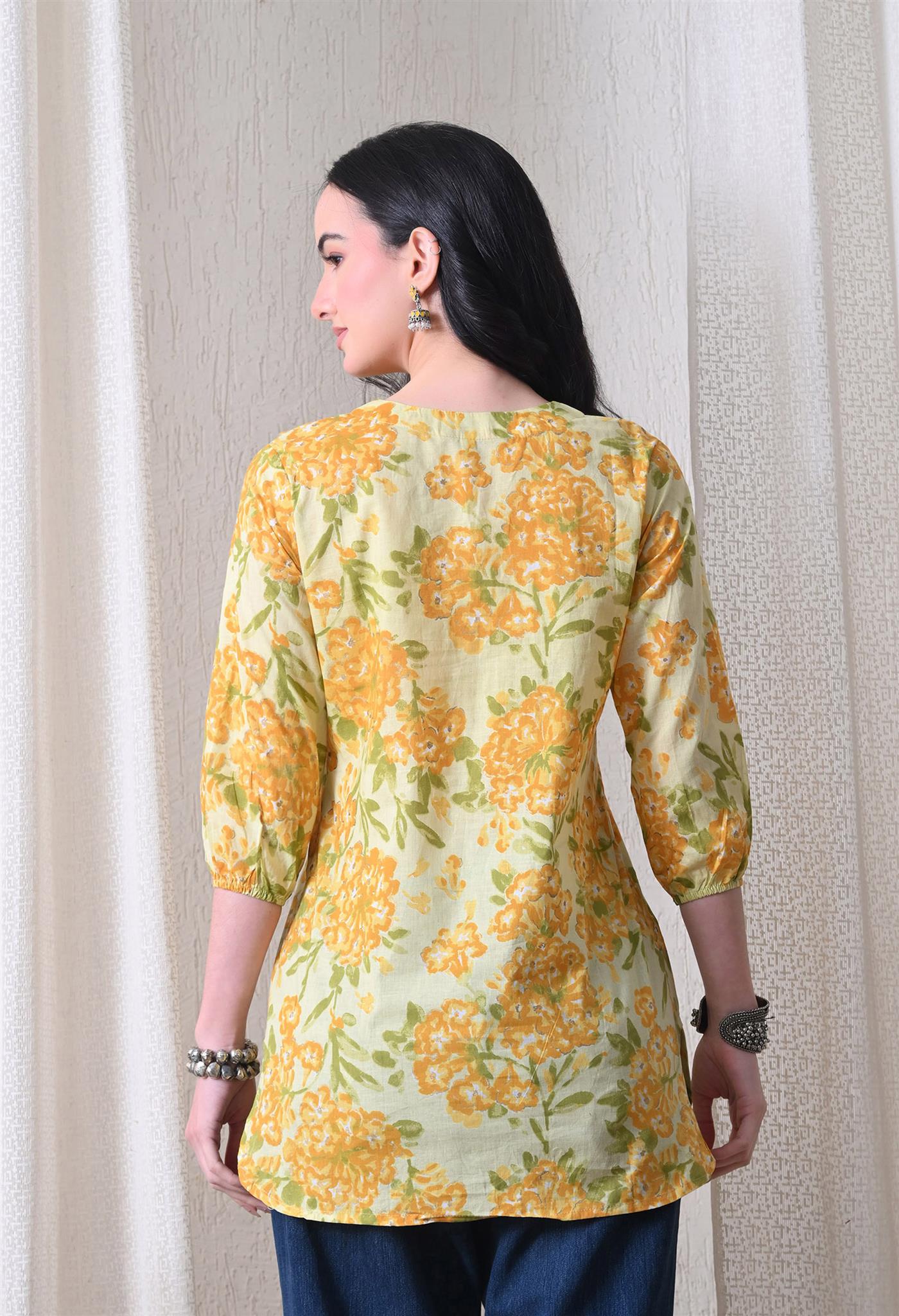 The beautiful marigold-inspired print adds a vibrant and festive charm, while the bright yellow shade enhances its cheerful appeal. Designed with 3/4th sleeves, this top provides balanced coverage and versatile styling, making it perfect for casual outings, office wear, or everyday elegance.
