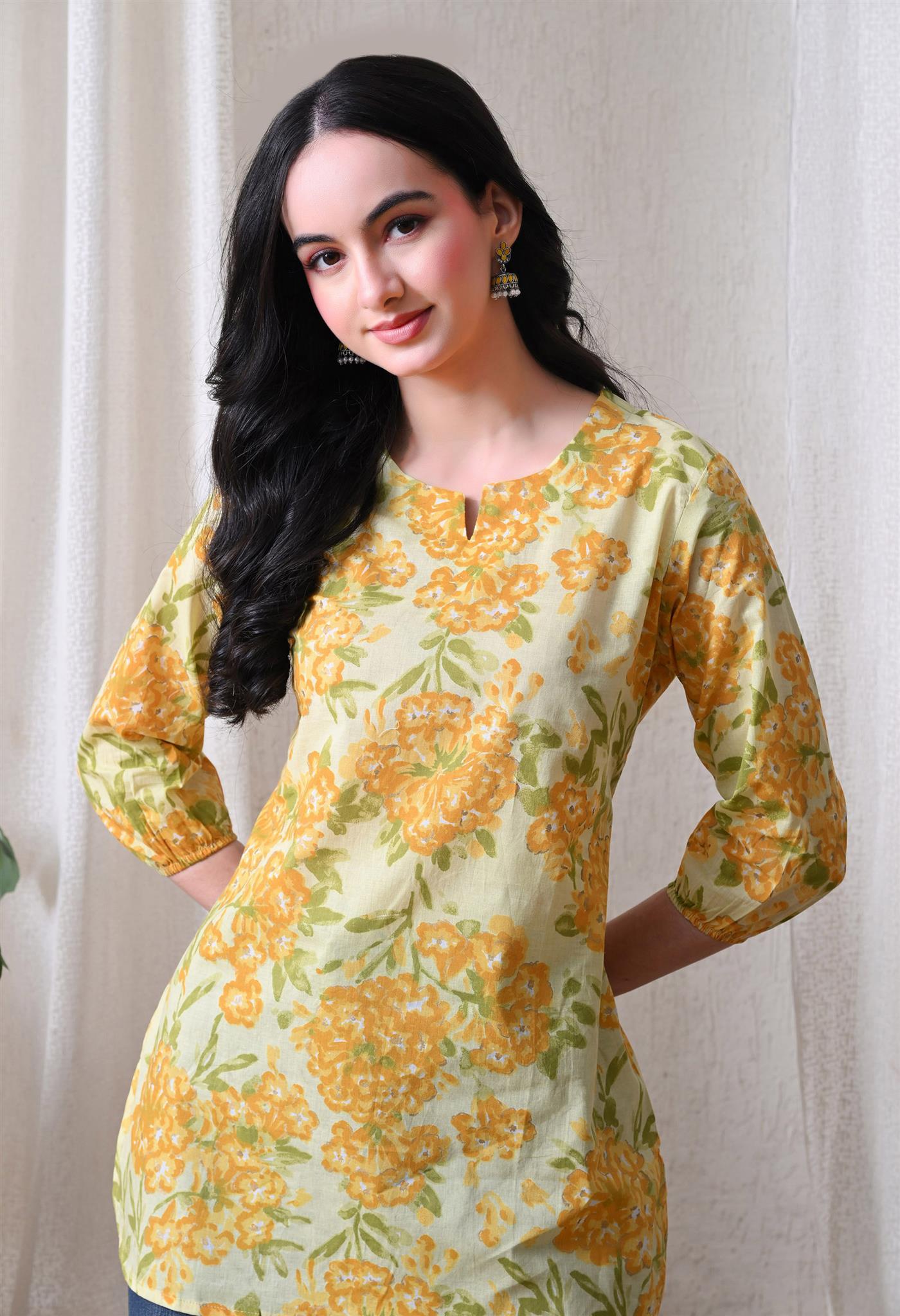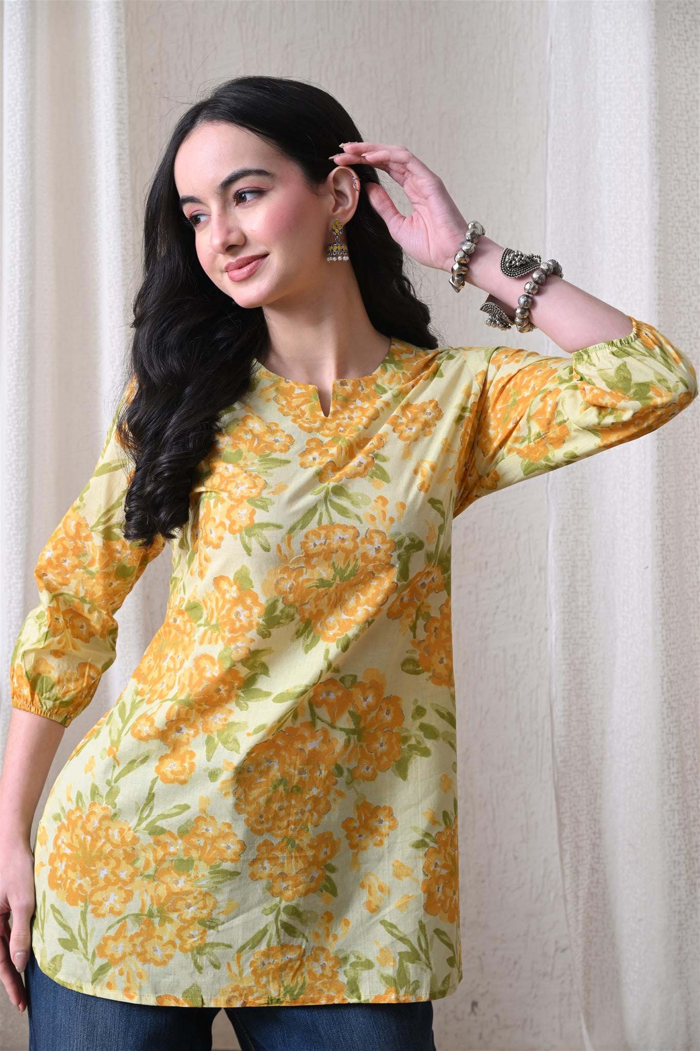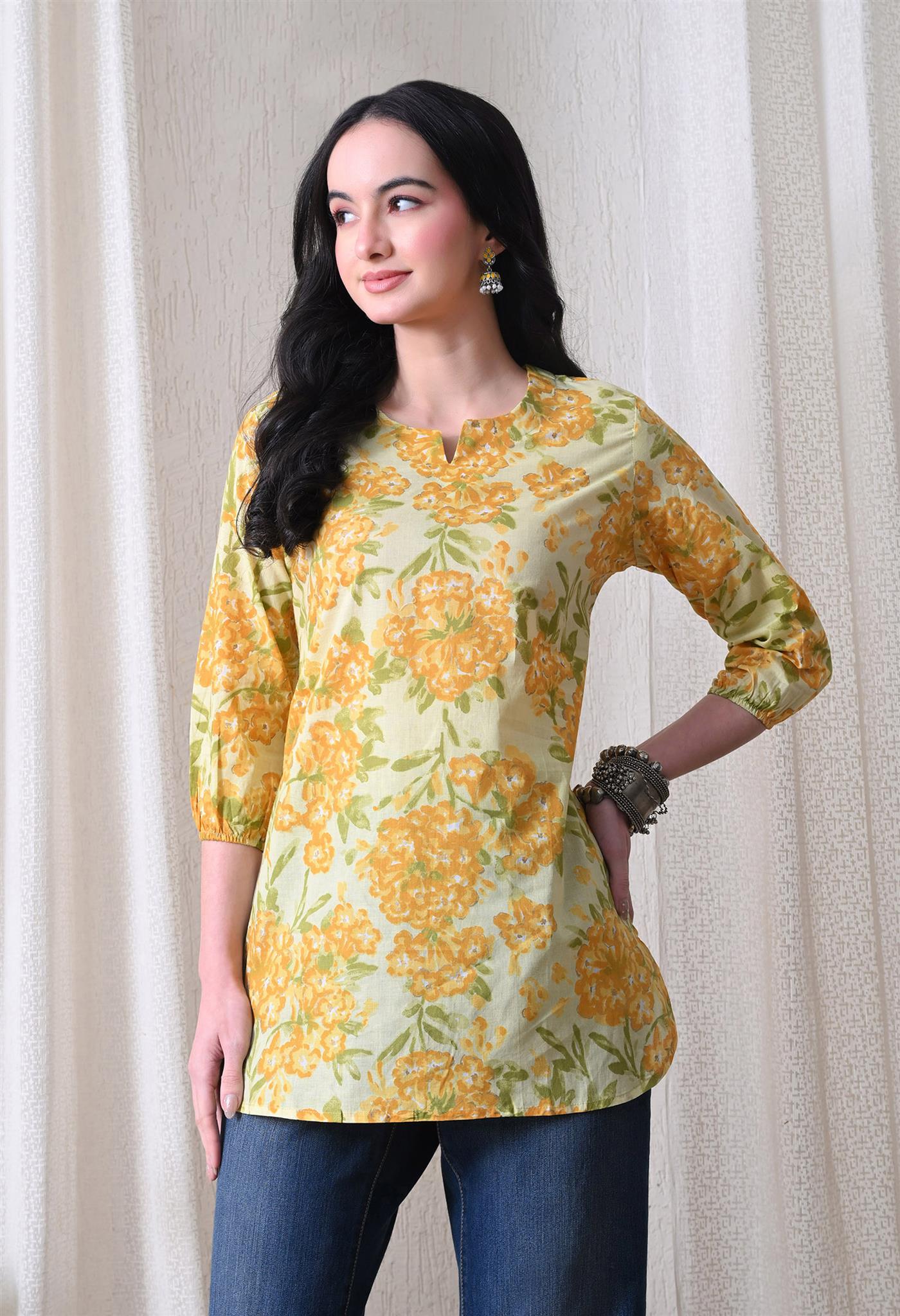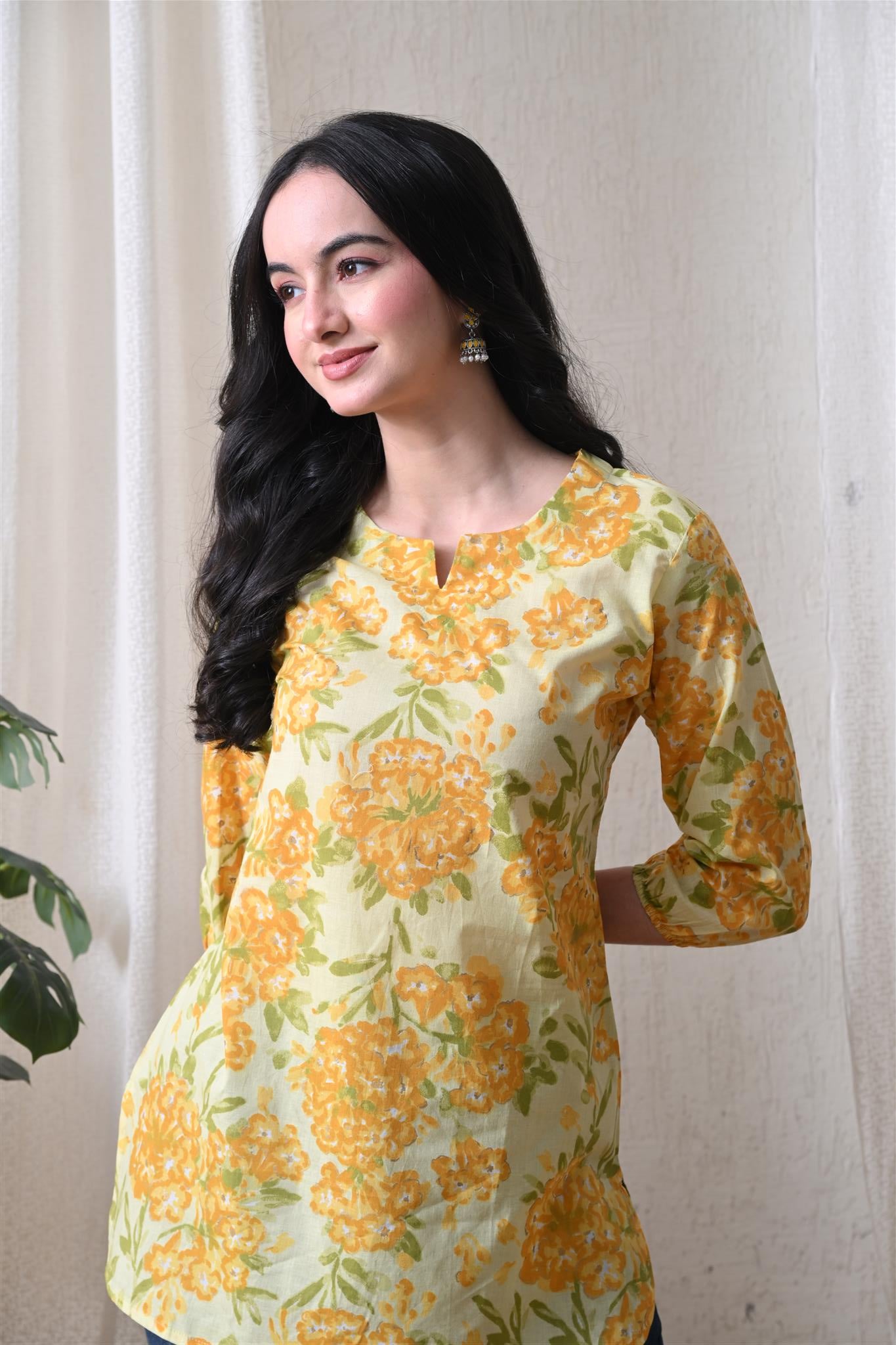 The beautiful marigold-inspired print adds a vibrant and festive charm, while the bright yellow shade enhances its cheerful appeal. Designed with 3/4th sleeves, this top provides balanced coverage and versatile styling, making it perfect for casual outings, office wear, or everyday elegance.