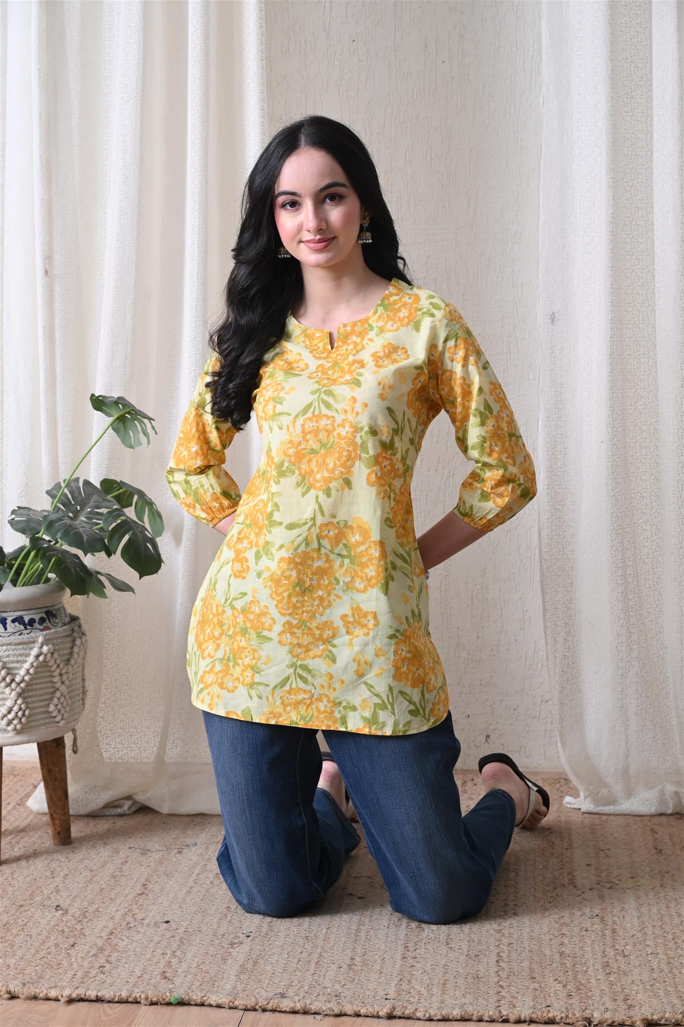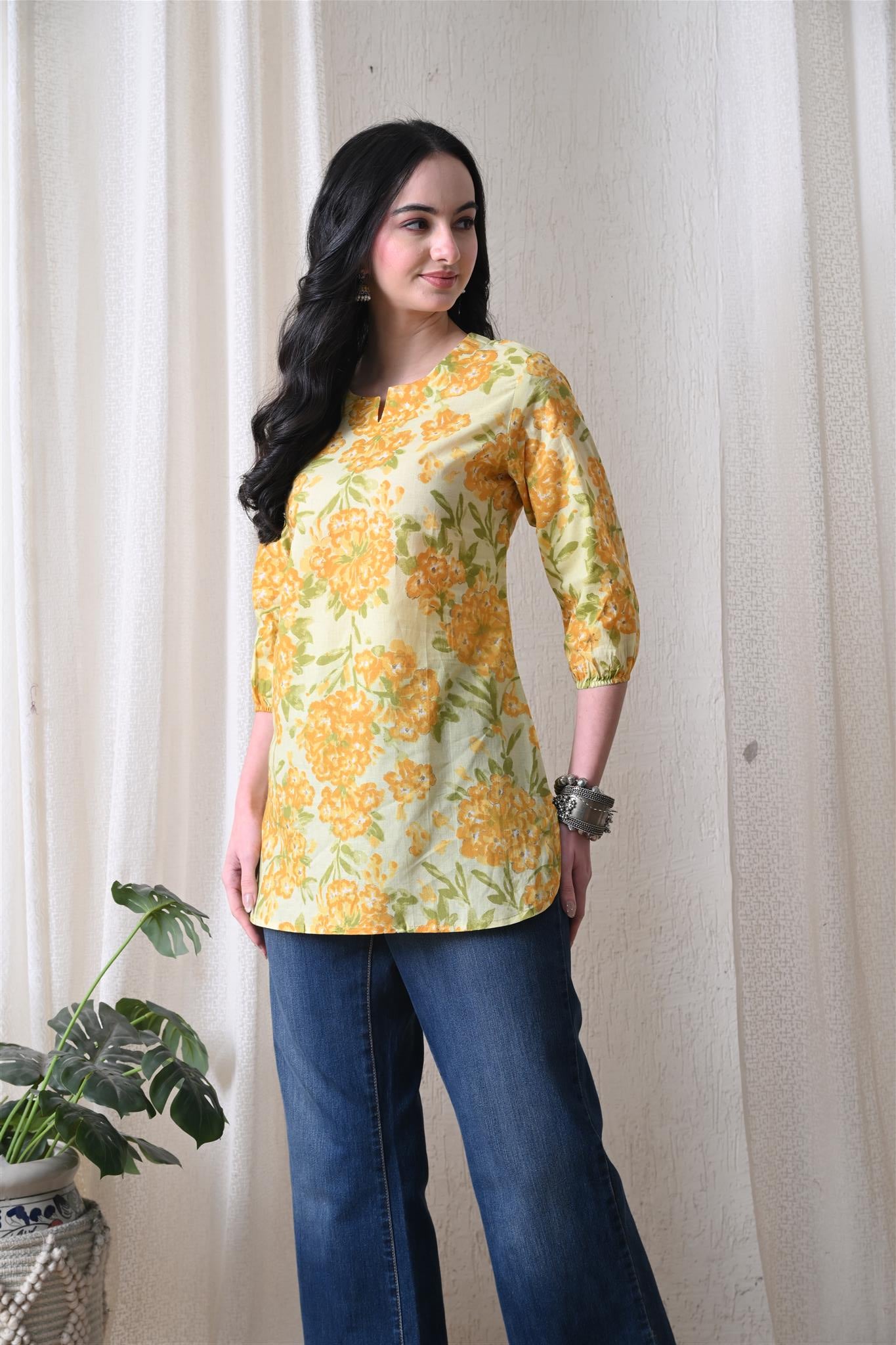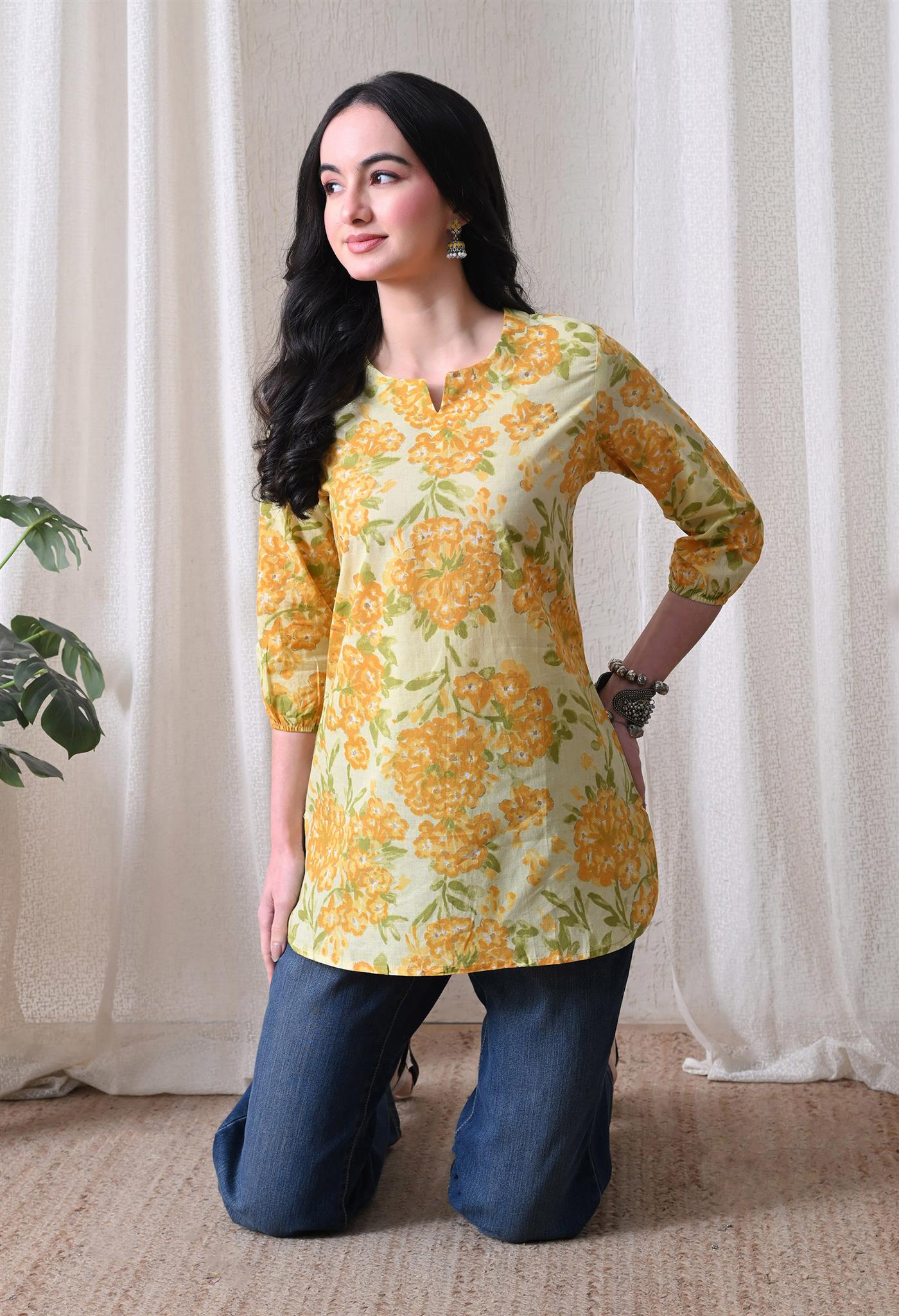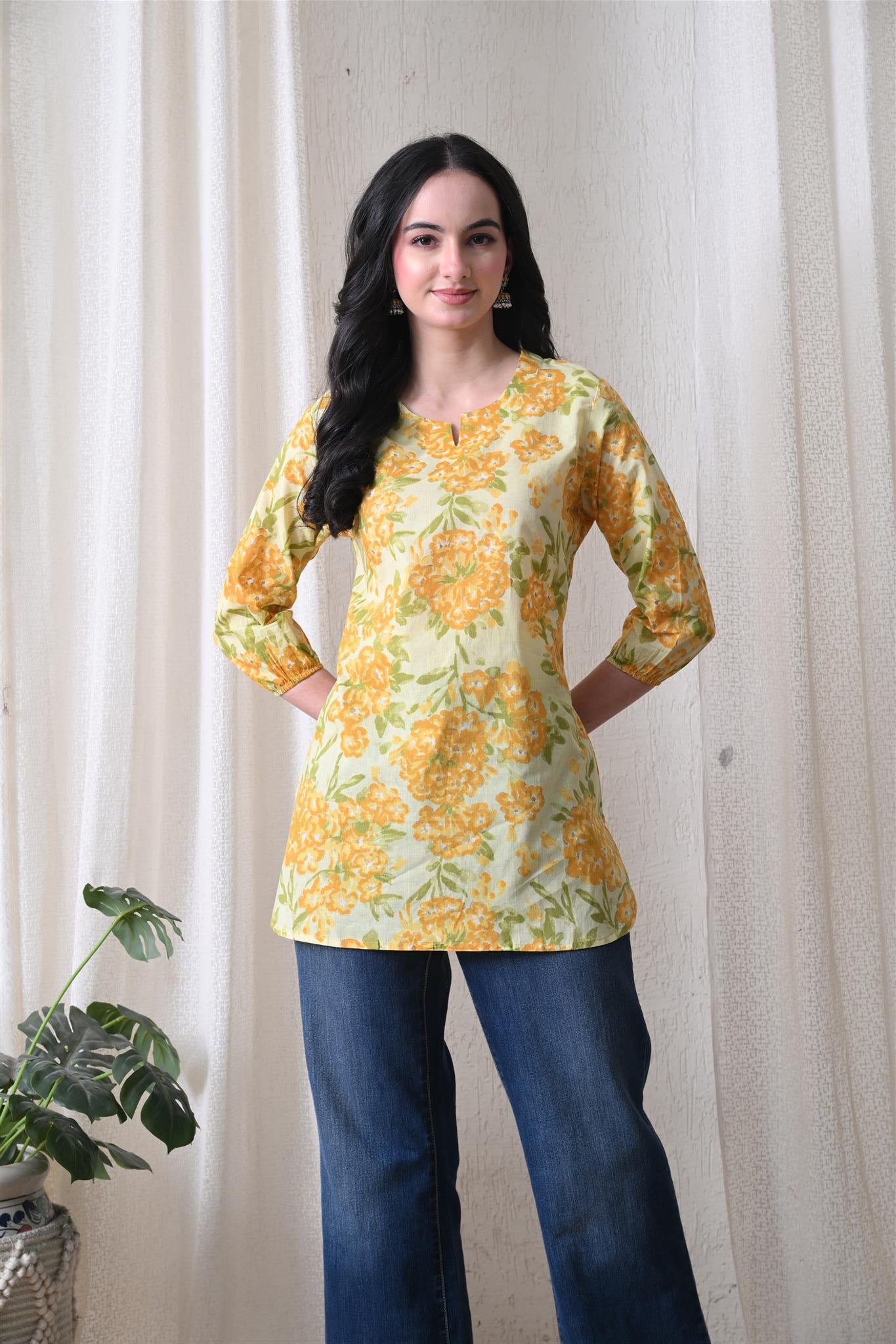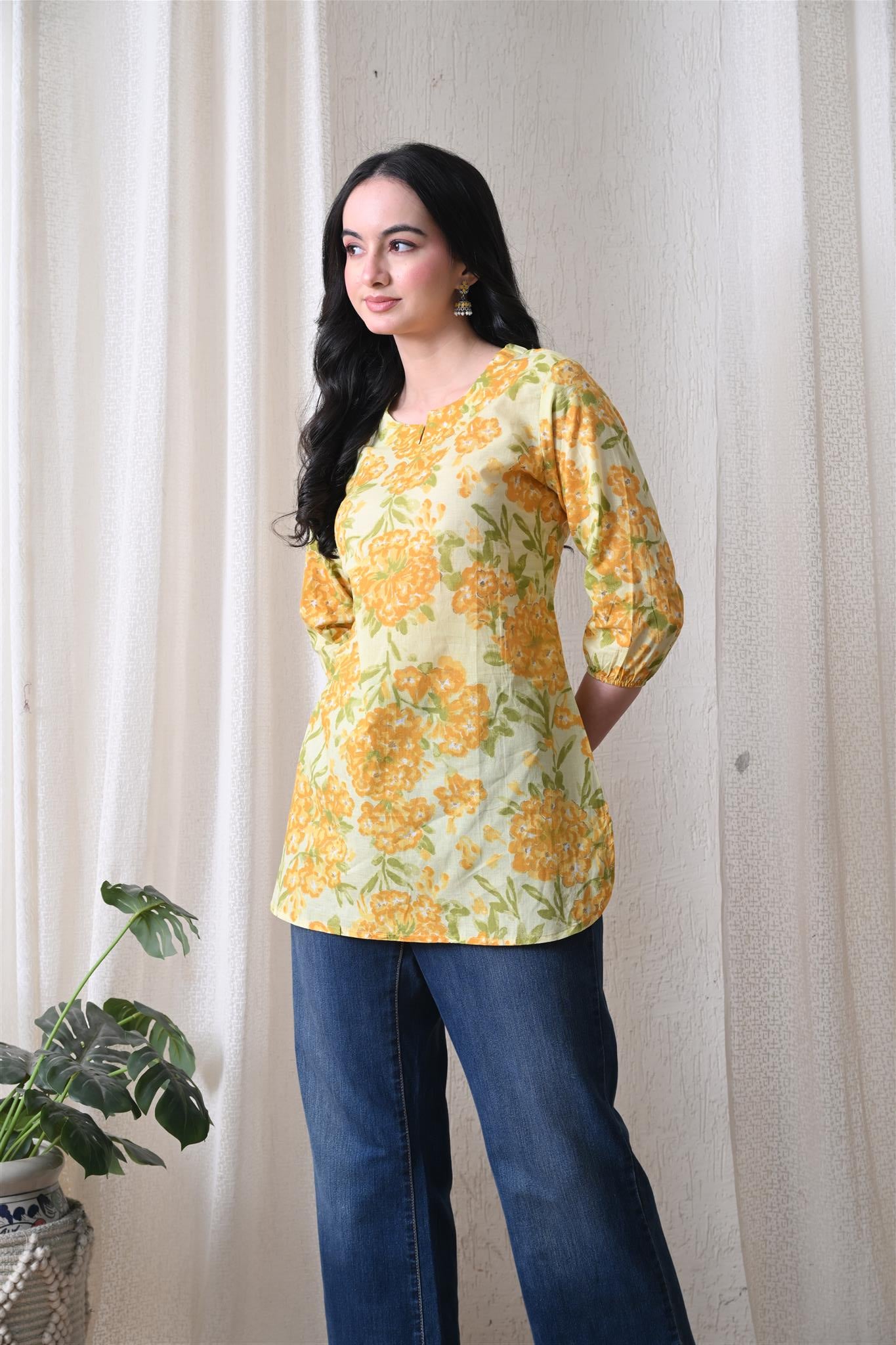 The beautiful marigold-inspired print adds a vibrant and festive charm, while the bright yellow shade enhances its cheerful appeal. Designed with 3/4th sleeves, this top provides balanced coverage and versatile styling, making it perfect for casual outings, office wear, or everyday elegance.