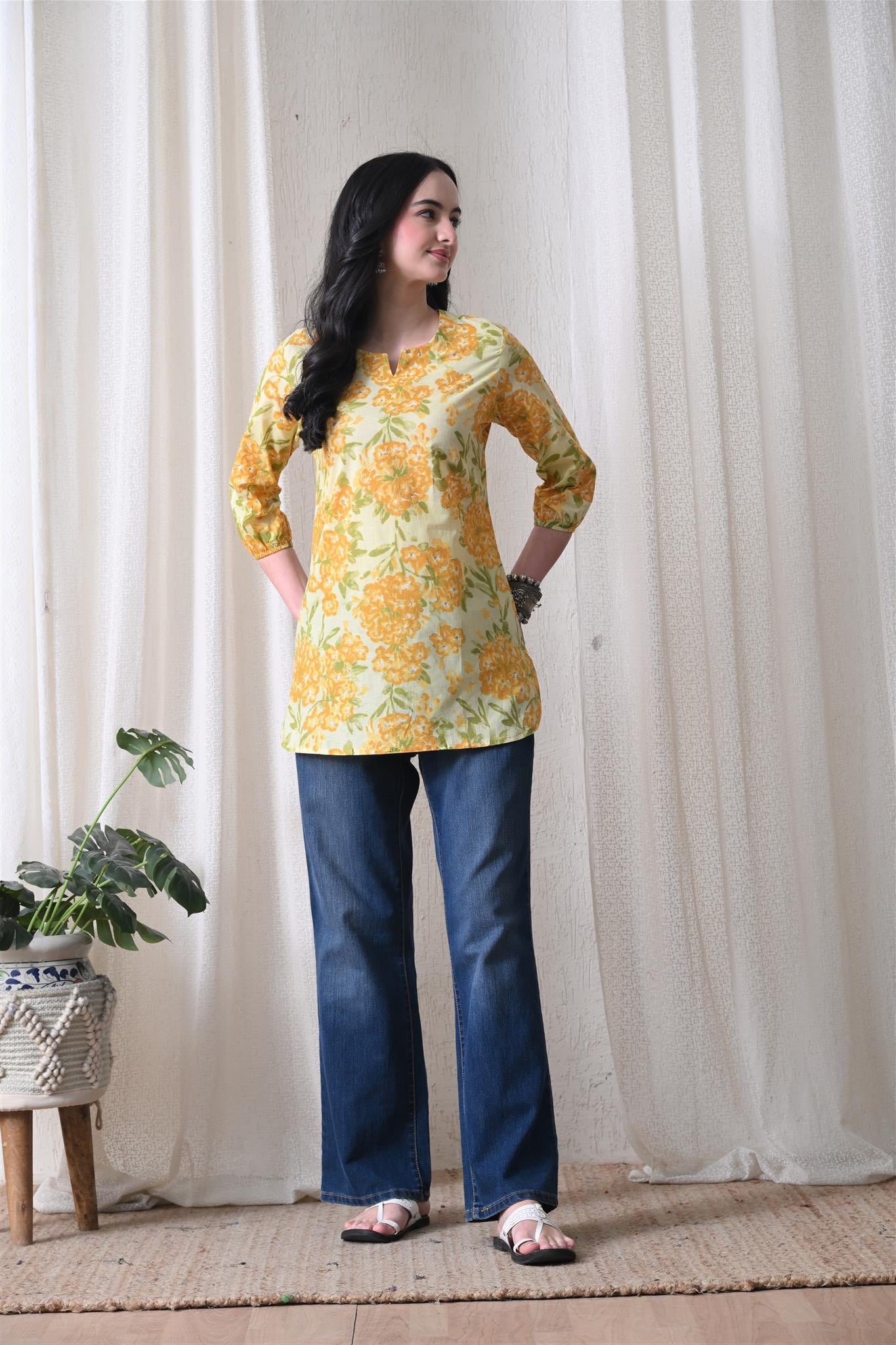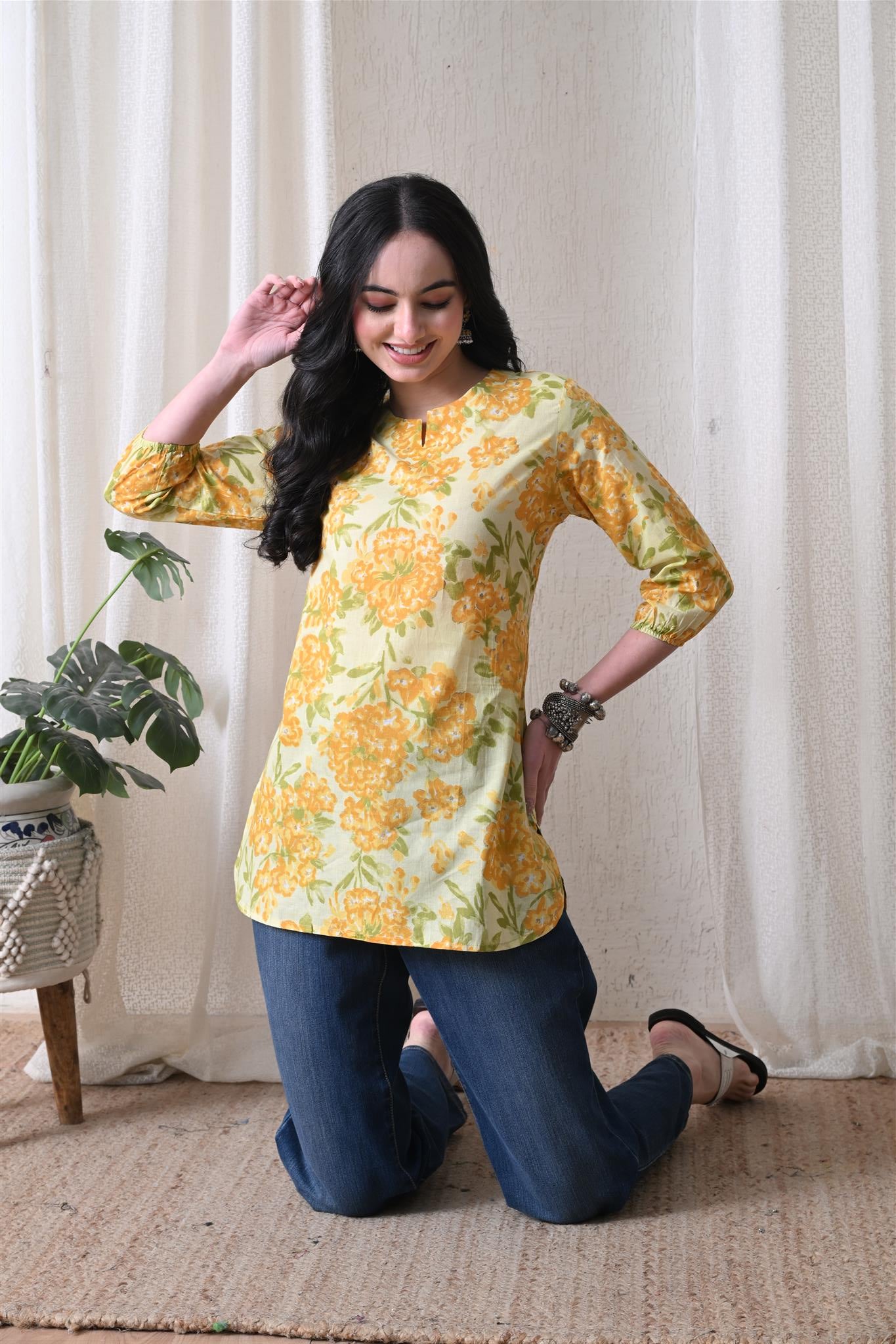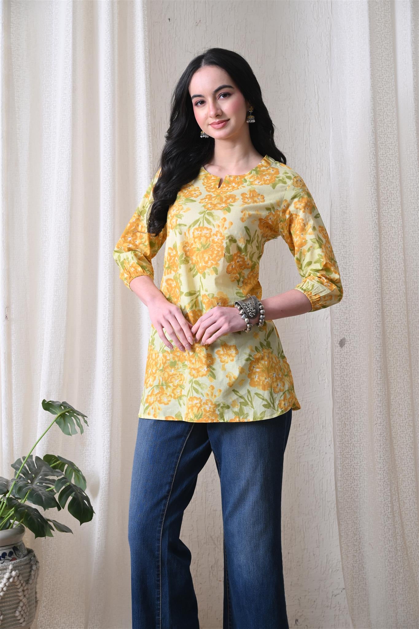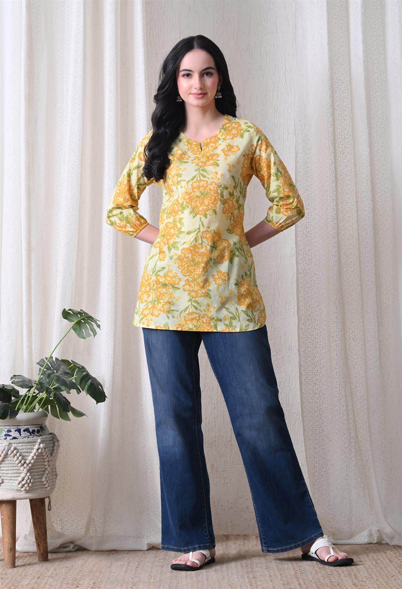 The beautiful marigold-inspired print adds a vibrant and festive charm, while the bright yellow shade enhances its cheerful appeal. Designed with 3/4th sleeves, this top provides balanced coverage and versatile styling, making it perfect for casual outings, office wear, or everyday elegance.